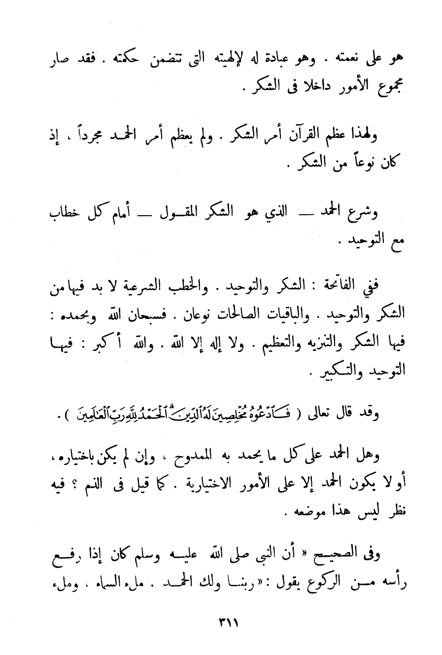 هُوَ عَلَى نِعْمَتِهِ. وَهُوَ عِبَادَةٌ لَهُ لِإِلَهِيَّتِهِ الَّتِي تَتَضَمَّنُ حِكْمَتَهُ. فَقَدْ صَارَ مَجْمُوعُ الْأُمُورِ دَاخِلًا فِي الشُّكْرِ. وَلِهَذَا عَظَّمَ الْقُرْآنُ أَمْرَ الشُّكْرِ. وَلَمْ يُعَظِّمْ أَمْرَ الْحَمْدِ مُجَرَّدًا إذْ كَانَ نَوْعًا مِنْ الشُّكْرِ. وَشَرَعَ الْحَمْدَ - الَّذِي هُوَ الشُّكْرُ الْمَقُولُ - أَمَامَ كُلِّ خِطَابٍ مَعَ التَّوْحِيدِ. فَفِي الْفَاتِحَةِ: الشُّكْرُ وَالتَّوْحِيدُ. وَالْخُطَبُ الشَّرْعِيَّةُ لَا بُدَّ فِيهَا مِنْ الشُّكْرِ وَالتَّوْحِيدِ. وَالْبَاقِيَاتُ الصَّالِحَاتُ نَوْعَانِ. فَسُبْحَانَ اللَّهِ وَبِحَمْدِهِ: فِيهَا الشُّكْرُ وَالتَّنْزِيهُ وَالتَّعْظِيمُ. وَلَا إلَهَ إلَّا اللَّهُ. وَاَللَّهُ أَكْبَرُ: فِيهَا التَّوْحِيدُ وَالتَّكْبِيرُ. وَقَدْ قَالَ تَعَالَى {فَادْعُوهُ مُخْلِصِينَ لَهُ الدِّينَ الْحَمْدُ لِلَّهِ رَبِّ الْعَالَمِينَ} .