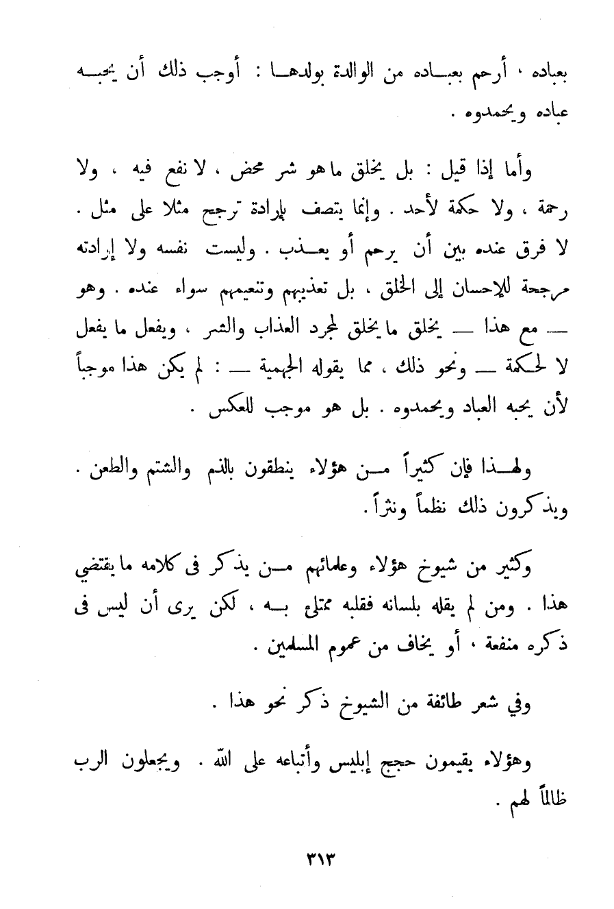 بِعِبَادِهِ أَرْحَمُ بِعِبَادِهِ مِنْ الْوَالِدَةِ بِوَلَدِهَا: أَوْجَبَ ذَلِكَ أَنْ يُحِبَّهُ عِبَادُهُ وَيَحْمَدُوهُ. وَأَمَّا إذَا قِيلَ: بَلْ يَخْلُقُ مَا هُوَ شَرٌّ مَحْضٌ لَا نَفْعَ فِيهِ وَلَا رَحْمَةَ وَلَا حِكْمَةَ لِأَحَدِ. وَإِنَّمَا يَتَّصِفُ بِإِرَادَةِ تُرَجِّحُ مِثْلًا عَلَى مِثْلٍ. لَا فَرْقَ عِنْدَهُ بَيْنَ أَنْ يَرْحَمَ أَوْ يُعَذِّبَ. وَلَيْسَتْ نَفْسُهُ وَلَا إرَادَتُهُ مُرَجِّحَةً لِلْإِحْسَانِ إلَى الْخَلْقِ بَلْ تَعْذِيبُهُمْ وَتَنْعِيمُهُمْ سَوَاءٌ عِنْدَهُ. وَهُوَ - مَعَ هَذَا - يَخْلُقُ مَا يَخْلُقُ لِمُجَرَّدِ الْعَذَابِ وَالشَّرِّ وَيَفْعَلُ مَا يَفْعَلُ لَا لِحِكْمَةِ - وَنَحْوِ ذَلِكَ مِمَّا يَقُولُهُ الْجَهْمِيَّة -: لَمْ يَكُنْ هَذَا مُوجِبًا لِأَنْ يُحِبَّهُ الْعِبَادُ وَيَحْمَدُوهُ. بَلْ هُوَ مُوجِبٌ لِلْعَكْسِ. وَلِهَذَا فَإِنَّ كَثِيرًا مِنْ هَؤُلَاءِ يَنْطِقُونَ بِالذَّمِّ وَالشَّتْمِ وَالطَّعْنِ. وَيَذْكُرُونَ ذَلِكَ نَظْمًا وَنَثْرًا. وَكَثِيرٌ مِنْ شُيُوخِ هَؤُلَاءِ وَعُلَمَائِهِمْ مَنْ يَذْكُرُ فِي كَلَامِهِ مَا يَقْتَضِي هَذَا. وَمَنْ لَمْ يَقُلْهُ بِلِسَانِهِ فَقَلْبُهُ مُمْتَلِئٌ بِهِ لَكِنْ يَرَى أَنْ لَيْسَ فِي ذِكْرِهِ مَنْفَعَةٌ أَوْ يَخَافُ مِنْ عُمُومِ الْمُسْلِمِينَ. وَفِي شِعْرِ طَائِفَةٍ مِنْ الشُّيُوخِ ذُكِرَ نَحْوُ هَذَا. وَهَؤُلَاءِ يُقِيمُونَ حُجَجَ إبْلِيسَ وَأَتْبَاعِهِ عَلَى اللَّهِ. وَيَجْعَلُونَ الرَّبَّ ظَالِمًا لَهُمْ.