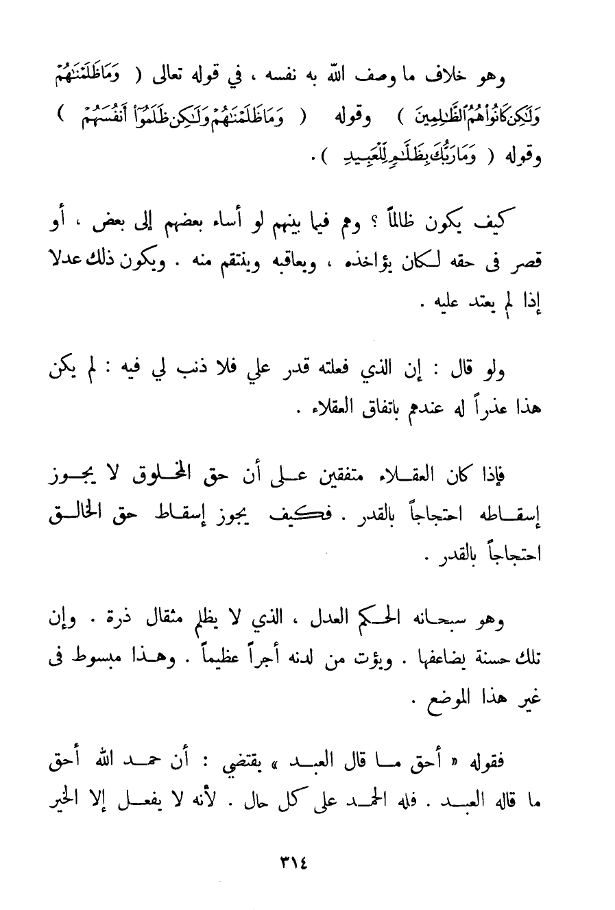 وَهُوَ خِلَافُ مَا وَصَفَ اللَّهُ بِهِ نَفْسَهُ فِي قَوْله تَعَالَى {وَمَا ظَلَمْنَاهُمْ وَلَكِنْ كَانُوا هُمُ الظَّالِمِينَ} وَقَوْلِهِ {وَمَا ظَلَمْنَاهُمْ وَلَكِنْ ظَلَمُوا أَنْفُسَهُمْ} وَقَوْلِهِ {وَمَا رَبُّكَ بِظَلَّامٍ لِلْعَبِيدِ} . كَيْفَ يَكُونُ ظَالِمًا؟ وَهُمْ فِيمَا بَيْنَهُمْ لَوْ أَسَاءَ بَعْضُهُمْ إلَى بَعْضٍ أَوْ قَصَّرَ فِي حَقِّهِ لَكَانَ يُؤَاخِذُهُ وَيُعَاقِبُهُ وَيَنْتَقِمُ مِنْهُ. وَيَكُونُ ذَلِكَ عَدْلًا إذَا لَمْ يَعْتَدِ عَلَيْهِ. ولو قَالَ: إنَّ الَّذِي فَعَلْته قَدَرٌ عَلَيَّ فَلَا ذَنْبَ لِي فِيهِ: لَمْ يَكُنْ هَذَا عُذْرًا لَهُ عِنْدَهُمْ بِاتِّفَاقِ الْعُقَلَاءِ. فَإِذَا كَانَ الْعُقَلَاءُ مُتَّفِقِينَ عَلَى أَنَّ حَقَّ الْمَخْلُوقِ لَا يَجُوزُ إسْقَاطُهُ احْتِجَاجًا بِالْقَدَرِ. فَكَيْفَ يَجُوزُ إسْقَاطُ حَقِّ الْخَالِقِ احْتِجَاجًا بِالْقَدَرِ. وَهُوَ سُبْحَانَهُ الْحَكَمُ الْعَدْلُ الَّذِي لَا يَظْلِمُ مِثْقَالَ ذَرَّةٍ. وَإِنْ تَكُ حَسَنَةً يُضَاعِفْهَا. وَيُؤْتِ مِنْ لَدُنْه أَجْرًا عَظِيمًا. وَهَذَا مَبْسُوطٌ فِي غَيْرِ هَذَا الْمَوْضِعِ. فَقَوْلُهُ {أَحَقُّ مَا قَالَ الْعَبْدُ} يَقْتَضِي: أَنَّ حَمْدَ اللَّهِ أَحَقُّ مَا قَالَهُ الْعَبْدُ. فَلَهُ الْحَمْدُ عَلَى كُلِّ حَالٍ. لِأَنَّهُ لَا يَفْعَلُ إلَّا الْخَيْرَ