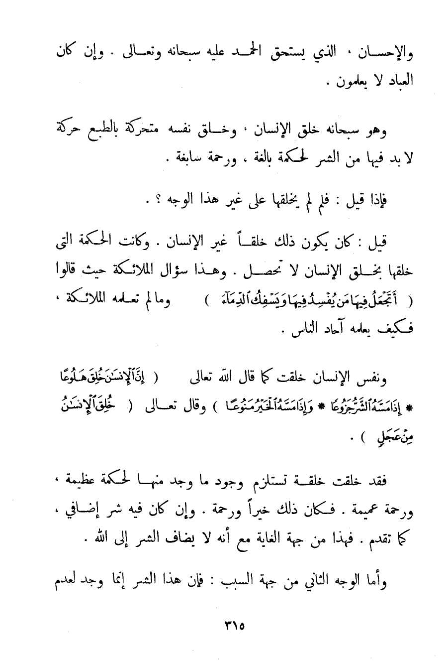وَالْإِحْسَانَ الَّذِي يَسْتَحِقُّ الْحَمْدَ عَلَيْهِ سُبْحَانَهُ وَتَعَالَى. وَإِنْ كَانَ الْعِبَادُ لَا يَعْلَمُونَ. وَهُوَ سُبْحَانَهُ خَلَقَ الْإِنْسَانَ وَخَلَقَ نَفْسَهُ مُتَحَرِّكَةً بِالطَّبْعِ حَرَكَةً لَا بُدَّ فِيهَا مِنْ الشَّرِّ لِحِكْمَةِ بَالِغَةٍ وَرَحْمَةٍ سَابِغَةٍ. فَإِذَا قِيلَ: فَلِمَ لَمْ يَخْلُقْهَا عَلَى غَيْرِ هَذَا الْوَجْهِ؟ . قِيلَ: كَانَ يَكُونُ ذَلِكَ خَلْقًا غَيْرَ الْإِنْسَانِ. وَكَانَتْ الْحِكْمَةُ الَّتِي خَلَقَهَا بِخَلْقِ الْإِنْسَانِ لَا تَحْصُلُ. وَهَذَا سُؤَالُ الْمَلَائِكَةِ حَيْثُ قَالُوا {أَتَجْعَلُ فِيهَا مَنْ يُفْسِدُ فِيهَا وَيَسْفِكُ الدِّمَاءَ} وَمَا لَمْ تَعْلَمْهُ الْمَلَائِكَةُ فَكَيْفَ يَعْلَمُهُ آحَادُ النَّاسِ. وَنَفْسُ الْإِنْسَانِ خُلِقَتْ كَمَا قَالَ اللَّهُ تَعَالَى {إنَّ الْإِنْسَانَ خُلِقَ هَلُوعًا} {إذَا مَسَّهُ الشَّرُّ جَزُوعًا} {وَإِذَا مَسَّهُ الْخَيْرُ مَنُوعًا} وَقَالَ تَعَالَى {خُلِقَ الْإِنْسَانُ مِنْ عَجَلٍ} . فَقَدْ خُلِقَتْ خِلْقَةً تَسْتَلْزِمُ وُجُودَ مَا وُجِدَ مِنْهَا لِحِكْمَةِ عَظِيمَةٍ وَرَحْمَةٍ عَمِيمَةٍ. فَكَانَ ذَلِكَ خَيْرًا وَرَحْمَةً. وَإِنْ كَانَ فِيهِ شَرٌّ إضَافِيٌّ كَمَا تَقَدَّمَ. فَهَذَا مِنْ جِهَةِ الْغَايَةِ مَعَ أَنَّهُ لَا يُضَافُ الشَّرُّ إلَى اللَّهِ. وَأَمَّا الْوَجْهُ الثَّانِي مِنْ جِهَةِ السَّبَبِ: فَإِنَّ هَذَا الشَّرَّ إنَّمَا وُجِدَ لِعَدَمِ