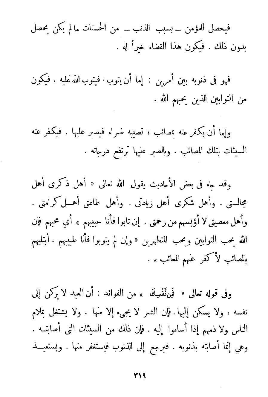 فَيَحْصُلُ لِلْمُؤْمِنِ - بِسَبَبِ الذَّنْبِ - مِنْ الْحَسَنَاتِ مَا لَمْ يَكُنْ يَحْصُلُ بِدُونِ ذَلِكَ. فَيَكُونُ هَذَا الْقَضَاءُ خَيْرًا لَهُ. فَهُوَ فِي ذُنُوبِهِ بَيْنَ أَمْرَيْنِ: إمَّا أَنْ يَتُوبَ فَيَتُوبُ اللَّهُ عَلَيْهِ فَيَكُونُ مِنْ التَّوَّابِينَ الَّذِينَ يُحِبُّهُمْ اللَّهُ. وَإِمَّا أَنْ يُكَفِّرَ عَنْهُ بِمَصَائِبَ؛ تُصِيبُهُ ضَرَّاءُ فَيَصْبِرُ عَلَيْهَا. فَيُكَفِّرُ عَنْهُ السَّيِّئَاتِ بِتِلْكَ الْمَصَائِبِ وَبِالصَّبْرِ عَلَيْهَا تَرْتَفِعُ دَرَجَاتُهُ. وَقَدْ جَاءَ فِي بَعْضِ الْأَحَادِيثِ {يَقُولُ اللَّهُ تَعَالَى أَهْلُ ذِكْرِي أَهْلُ مُجَالَسَتِي. وَأَهْلُ شُكْرِي أَهْلُ زِيَادَتِي. وَأَهْلُ طَاعَتِي أَهْلُ كَرَامَتِي. وَأَهْلُ مَعْصِيَتِي لَا أُؤَيِّسُهُمْ مِنْ رَحْمَتِي. إنْ تَابُوا فَأَنَا حَبِيبُهُمْ} أَيْ مُحِبُّهُمْ فَإِنَّ اللَّهَ يُحِبُّ التَّوَّابِينَ وَيُحِبُّ الْمُتَطَهِّرِينَ {وَإِنْ لَمْ يَتُوبُوا فَأَنَا طَبِيبُهُمْ. أَبْتَلِيهِمْ بِالْمَصَائِبِ لِأُكَفِّرَ عَنْهُمْ المعائب} . وَفِي قَوْله تَعَالَى {فَمِنْ نَفْسِكَ} مِنْ الْفَوَائِدِ: أَنَّ الْعَبْدَ لَا يَرْكَنُ إلَى نَفْسِهِ وَلَا يَسْكُنُ إلَيْهَا. فَإِنَّ الشَّرَّ لَا يَجِيءُ إلَّا مِنْهَا. وَلَا يَشْتَغِلُ بِمَلَامِ النَّاسِ وَلَا ذَمِّهِمْ إذَا أَسَاءُوا إلَيْهِ. فَإِنَّ ذَلِكَ مِنْ السَّيِّئَاتِ الَّتِي أَصَابَتْهُ. وَهِيَ إنَّمَا أَصَابَتْهُ بِذُنُوبِهِ. فَيَرْجِعُ إلَى الذُّنُوبِ فَيَسْتَغْفِرُ مِنْهَا. وَيَسْتَعِيذُ
