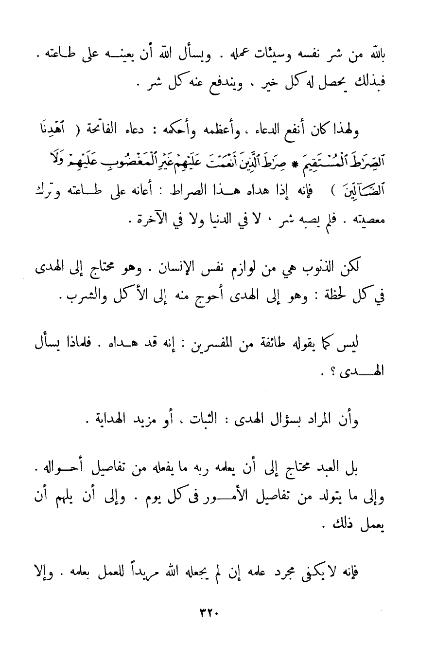 بِاَللَّهِ مِنْ شَرِّ نَفْسِهِ وَسَيِّئَاتِ عَمَلِهِ. وَيَسْأَلُ اللَّهَ أَنْ يُعِينَهُ عَلَى طَاعَتِهِ. فَبِذَلِكَ يَحْصُلُ لَهُ كُلُّ خَيْرٍ وَيَنْدَفِعُ عَنْهُ كُلُّ شَرٍّ. وَلِهَذَا كَانَ أَنْفَعُ الدُّعَاءِ وَأَعْظَمُهُ وَأَحْكَمُهُ: دُعَاءَ الْفَاتِحَةِ {اهْدِنَا الصِّرَاطَ الْمُسْتَقِيمَ} {صِرَاطَ الَّذِينَ أَنْعَمْتَ عَلَيْهِمْ غَيْرِ الْمَغْضُوبِ عَلَيْهِمْ وَلَا الضَّالِّينَ} فَإِنَّهُ إذَا هَدَاهُ هَذَا الصِّرَاطَ: أَعَانَهُ عَلَى طَاعَتِهِ وَتَرْكِ مَعْصِيَتِهِ. فَلَمْ يُصِبْهُ شَرٌّ لَا فِي الدُّنْيَا وَلَا فِي الْآخِرَةِ. لَكِنَّ الذُّنُوبَ هِيَ مِنْ لَوَازِمِ نَفْسِ الْإِنْسَانِ. وَهُوَ مُحْتَاجٌ إلَى الْهُدَى فِي كُلِّ لَحْظَةٍ: وَهُوَ إلَى الْهُدَى أَحْوَجُ مِنْهُ إلَى الْأَكْلِ وَالشُّرْبِ. لَيْسَ كَمَا يَقُولُهُ طَائِفَةٌ مِنْ الْمُفَسِّرِينَ: إنَّهُ قَدْ هَدَاهُ. فَلِمَاذَا يَسْأَلُ الْهُدَى؟ . وَأَنَّ الْمُرَادَ بِسُؤَالِ الْهُدَى: الثَّبَاتُ أَوْ مَزِيدُ الْهِدَايَةِ. بَلْ الْعَبْدُ مُحْتَاجٌ إلَى أَنْ يُعَلِّمَهُ رَبُّهُ مَا يَفْعَلُهُ مِنْ تَفَاصِيلِ أَحْوَالِهِ. وَإِلَى مَا يَتَوَلَّدُ مِنْ تَفَاصِيلِ الْأُمُورِ فِي كُلِّ يَوْمٍ. وَإِلَى أَنْ يُلْهَمَ أَنْ يَعْمَلَ ذَلِكَ. فَإِنَّهُ لَا يَكْفِي مُجَرَّدَ عِلْمِهِ إنْ لَمْ يَجْعَلْهُ اللَّهُ مُرِيدًا لِلْعَمَلِ بِعِلْمِهِ وَإِلَّا