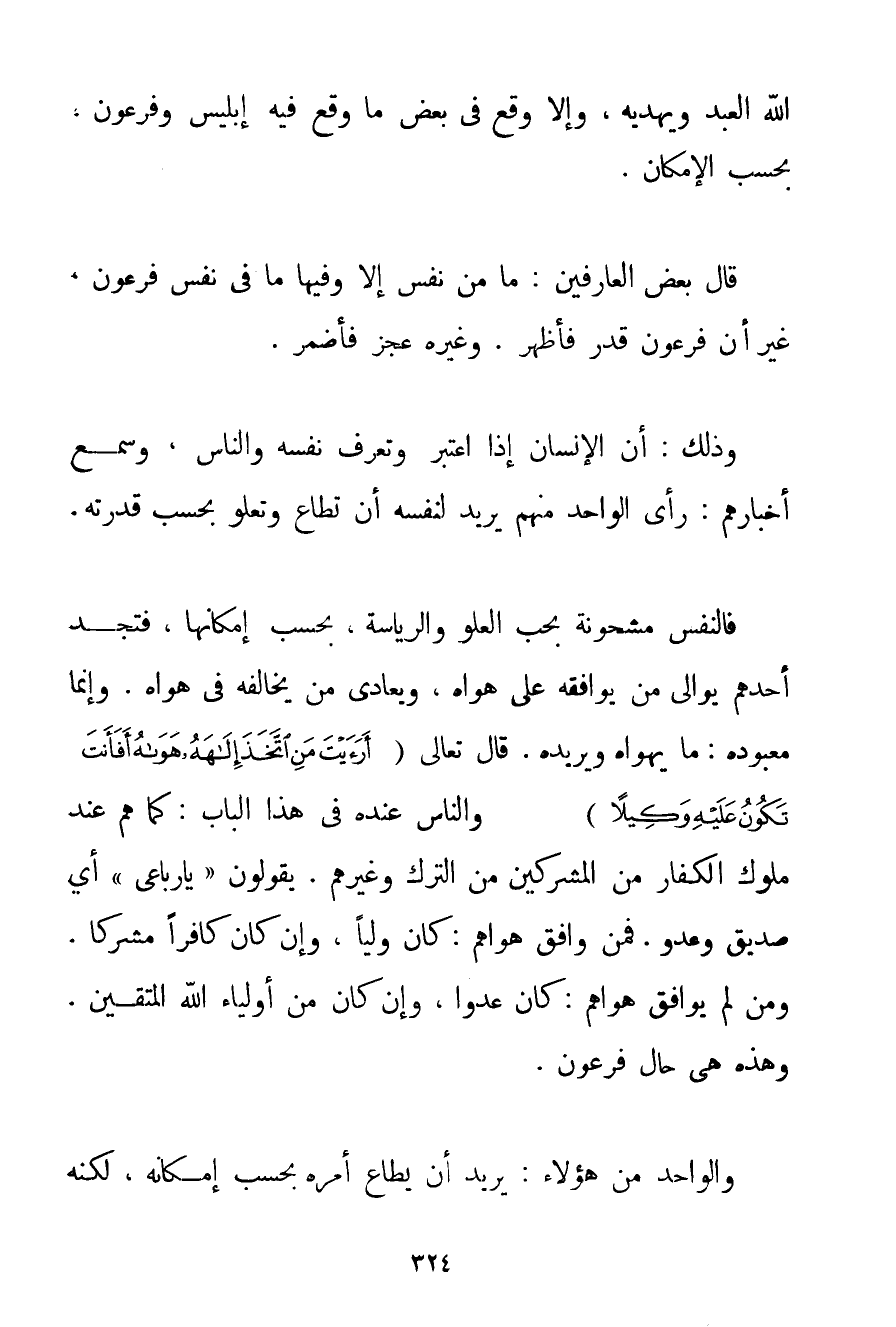 اللَّهُ الْعَبْدَ وَيَهْدِهِ وَإِلَّا وَقَعَ فِي بَعْضِ مَا وَقَعَ فِيهِ إبْلِيسُ وَفِرْعَوْنُ بِحَسَبِ الْإِمْكَانِ. قَالَ بَعْضُ الْعَارِفِينَ: مَا مِنْ نَفْسٍ إلَّا وَفِيهَا مَا فِي نَفْسِ فِرْعَوْنَ غَيْرَ أَنَّ فِرْعَوْنَ قَدَرَ فَأَظْهَرَ. وَغَيْرَهُ عَجَزَ فَأَضْمَرَ. وَذَلِكَ: أَنَّ الْإِنْسَانَ إذَا اعْتَبَرَ وَتَعَرَّفَ نَفْسَهُ وَالنَّاسَ وَسَمِعَ أَخْبَارَهُمْ: رَأَى الْوَاحِدَ مِنْهُمْ يُرِيدُ لِنَفْسِهِ أَنْ تُطَاعَ وَتَعْلُو بِحَسَبِ قُدْرَتِهِ. فَالنَّفْسُ مَشْحُونَةٌ بِحُبِّ الْعُلُوِّ وَالرِّيَاسَةِ بِحَسَبِ إمْكَانِهَا فَتَجِدُ أَحَدَهُمْ يُوَالِي مَنْ يُوَافِقُهُ عَلَى هَوَاهُ وَيُعَادِي مَنْ يُخَالِفُهُ فِي هَوَاهُ. وَإِنَّمَا مَعْبُودُهُ: مَا يَهْوَاهُ وَيُرِيدُهُ. قَالَ تَعَالَى {أَرَأَيْتَ مَنِ اتَّخَذَ إلَهَهُ هَوَاهُ أَفَأَنْتَ تَكُونُ عَلَيْهِ وَكِيلًا} وَالنَّاسُ عِنْدَهُ فِي هَذَا الْبَابِ: كَمَا هُمْ عِنْدَ مُلُوكِ الْكُفَّارِ مِنْ الْمُشْرِكِينَ مِنْ التُّرْكِ وَغَيْرِهِمْ. يَقُولُونَ " يَا رُبَاعِيّ " أَيْ صَدِيقٌ وَعَدُوٌّ. فَمَنْ وَافَقَ هَوَاهُمْ: كَانَ وَلِيًّا وَإِنْ كَانَ كَافِرًا مُشْرِكًا. وَمَنْ لَمْ يُوَافِقْ هَوَاهُمْ: كَانَ عَدُوًّا وَإِنْ كَانَ مِنْ أَوْلِيَاءِ اللَّهِ الْمُتَّقِينَ. وَهَذِهِ هِيَ حَالُ فِرْعَوْنَ. وَالْوَاحِدُ مِنْ هَؤُلَاءِ: يُرِيدُ أَنْ يُطَاعَ أَمْرُهُ بِحَسَبِ إمْكَانِهِ لَكِنَّهُ