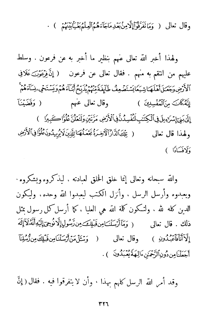 جَاءَتْهُمُ الْبَيِّنَةُ} وَقَالَ تَعَالَى {وَمَا تَفَرَّقُوا إلَّا مِنْ بَعْدِ مَا جَاءَهُمُ الْعِلْمُ بَغْيًا بَيْنَهُمْ} . وَلِهَذَا أَخْبَرَ اللَّهُ تَعَالَى عَنْهُمْ بِنَظِيرِ مَا أَخْبَرَ بِهِ عَنْ فِرْعَوْنَ. وَسَلَّطَ عَلَيْهِمْ مَنْ انْتَقَمَ بِهِ مِنْهُمْ. فَقَالَ تَعَالَى عَنْ فِرْعَوْنَ {إنَّ فِرْعَوْنَ عَلَا فِي الْأَرْضِ وَجَعَلَ أَهْلَهَا شِيَعًا يَسْتَضْعِفُ طَائِفَةً مِنْهُمْ يُذَبِّحُ أَبْنَاءَهُمْ وَيَسْتَحْيِي نِسَاءَهُمْ إنَّهُ كَانَ مِنَ الْمُفْسِدِينَ} وَقَالَ تَعَالَى عَنْهُمْ {وَقَضَيْنَا إلَى بَنِي إسْرائِيلَ فِي الْكِتَابِ لَتُفْسِدُنَّ فِي الْأَرْضِ مَرَّتَيْنِ وَلَتَعْلُنَّ عُلُوًّا كَبِيرًا} وَلِهَذَا قَالَ تَعَالَى {تِلْكَ الدَّارُ الْآخِرَةُ نَجْعَلُهَا لِلَّذِينَ لَا يُرِيدُونَ عُلُوًّا فِي الْأَرْضِ وَلَا فَسَادًا}