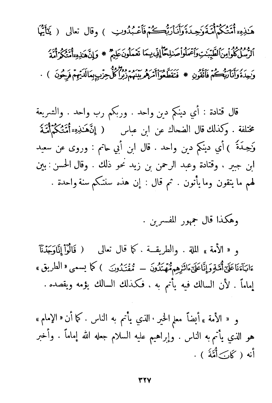هَذِهِ أُمَّتُكُمْ أُمَّةً وَاحِدَةً وَأَنَا رَبُّكُمْ فَاعْبُدُونِ} وَقَالَ تَعَالَى {يَا أَيُّهَا الرُّسُلُ كُلُوا مِنَ الطَّيِّبَاتِ وَاعْمَلُوا صَالِحًا إنِّي بِمَا تَعْمَلُونَ عَلِيمٌ} {وَإِنَّ هَذِهِ أُمَّتُكُمْ أُمَّةً وَاحِدَةً وَأَنَا رَبُّكُمْ فَاتَّقُونِ} {فَتَقَطَّعُوا أَمْرَهُمْ بَيْنَهُمْ زُبُرًا كُلُّ حِزْبٍ بِمَا لَدَيْهِمْ فَرِحُونَ} . قَالَ قتادة: أَيْ دِينُكُمْ دِينٌ وَاحِدٌ. وَرَبُّكُمْ رَبٌّ وَاحِدٌ. وَالشَّرِيعَةُ مُخْتَلِفَةٌ. وَكَذَلِكَ قَالَ الضَّحَّاكُ عَنْ ابْنِ عَبَّاسٍ {إنَّ هَذِهِ أُمَّتُكُمْ أُمَّةً وَاحِدَةً} أَيْ دِينُكُمْ دِينٌ وَاحِدٌ. قَالَ ابْنُ أَبِي حَاتِمٍ: وَرُوِيَ عَنْ سَعِيدِ بْنِ جُبَيْرٍ وقتادة وَعَبْدِ الرَّحْمَنِ بْنِ زَيْدٍ نَحْوِ ذَلِكَ. وَقَالَ الْحَسَنُ: بَيَّنَ لَهُمْ مَا يَتَّقُونَ وَمَا يَأْتُونَ. ثُمَّ قَالَ: إنَّ هَذِهِ سُنَّتُكُمْ سَنَةً وَاحِدَةً. وَهَكَذَا قَالَ جُمْهُورُ الْمُفَسِّرِينَ. و " الْأُمَّةُ " الْمِلَّةُ. وَالطَّرِيقَةُ كَمَا قَالَ تَعَالَى {قَالُوا إنَّا وَجَدْنَا آبَاءَنَا عَلَى أُمَّةٍ وَإِنَّا عَلَى آثَارِهِمْ مُهْتَدُونَ} - مُقْتَدُونَ كَمَا يُسَمَّى " الطَّرِيقُ " إمَامًا. لِأَنَّ السَّالِكَ فِيهِ يَأْتَمُّ بِهِ فَكَذَلِكَ السَّالِكُ يَؤُمُّهُ وَيَقْصِدُهُ. و " الْأُمَّةُ " أَيْضًا مُعَلِّمُ الْخَيْرِ الَّذِي يَأْتَمُّ بِهِ النَّاسُ. كَمَا أَنَّ " الْإِمَامَ " هُوَ الَّذِي يَأْتَمُّ بِهِ النَّاسُ. وَإِبْرَاهِيمُ عَلَيْهِ السَّلَامُ جَعَلَهُ اللَّهُ إمَامًا. وَأَخْبَرَ أَنَّهُ {كَانَ أُمَّةً}