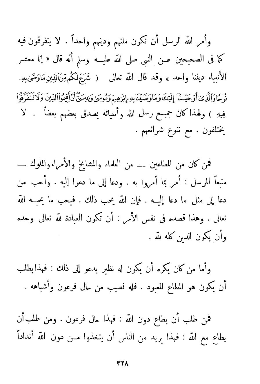 وَأَمَرَ اللَّهُ الرُّسُلَ أَنْ تَكُونَ مِلَّتُهُمْ وَدِينُهُمْ وَاحِدًا. لَا يَتَفَرَّقُونَ فِيهِ كَمَا فِي الصَّحِيحَيْنِ عَنْ النَّبِيِّ صَلَّى اللَّهُ عَلَيْهِ وَسَلَّمَ أَنَّهُ قَالَ {إنَّا مَعْشَرَ الْأَنْبِيَاءِ دِينُنَا وَاحِدٌ} وَقَدْ قَالَ اللَّهُ تَعَالَى {شَرَعَ لَكُمْ مِنَ الدِّينِ مَا وَصَّى بِهِ نُوحًا وَالَّذِي أَوْحَيْنَا إلَيْكَ وَمَا وَصَّيْنَا بِهِ إبْرَاهِيمَ وَمُوسَى وَعِيسَى أَنْ أَقِيمُوا الدِّينَ وَلَا تَتَفَرَّقُوا فِيهِ} وَلِهَذَا كَانَ جَمِيعُ رُسُلِ اللَّهِ وَأَنْبِيَائِهِ يُصَدِّقُ بَعْضُهُمْ بَعْضًا. لَا يَخْتَلِفُونَ مَعَ تَنَوُّعِ شَرَائِعِهِمْ. فَمَنْ كَانَ مِنْ الْمُطَاعِينَ - مِنْ الْعُلَمَاءِ وَالْمَشَايِخِ وَالْأُمَرَاءِ وَالْمُلُوكِ - مُتَّبِعًا لِلرُّسُلِ: أَمَرَ بِمَا أَمَرُوا بِهِ. وَدَعَا إلَى مَا دَعَوْا إلَيْهِ. وَأَحَبَّ مَنْ دَعَا إلَى مِثْلِ مَا دَعَا إلَيْهِ. فَإِنَّ اللَّهَ يُحِبُّ ذَلِكَ. فَيُحِبُّ مَا يُحِبُّهُ اللَّهُ تَعَالَى. وَهَذَا قَصْدُهُ فِي نَفْسِ الْأَمْرِ: أَنْ تَكُونَ الْعِبَادَةُ لِلَّهِ تَعَالَى وَحْدَهُ وَأَنْ يَكُونَ الدِّينُ كُلُّهُ لِلَّهِ. وَأَمَّا مَنْ كَانَ يَكْرَهُ أَنْ يَكُونَ لَهُ نَظِيرٌ يَدْعُو إلَى ذَلِكَ: فَهَذَا يَطْلُبُ أَنْ يَكُونَ هُوَ الْمُطَاعُ الْمَعْبُودُ. فَلَهُ نَصِيبٌ مِنْ حَالِ فِرْعَوْنَ وَأَشْبَاهِهِ. فَمَنْ طَلَبَ أَنْ يُطَاعَ دُونَ اللَّهِ: فَهَذَا حَالُ فِرْعَوْنَ. وَمَنْ طَلَبَ أَنْ يُطَاعَ مَعَ اللَّهِ: فَهَذَا يُرِيدُ مِنْ النَّاسِ أَنْ يَتَّخِذُوا مِنْ دُونِ اللَّهِ أَنْدَادًا