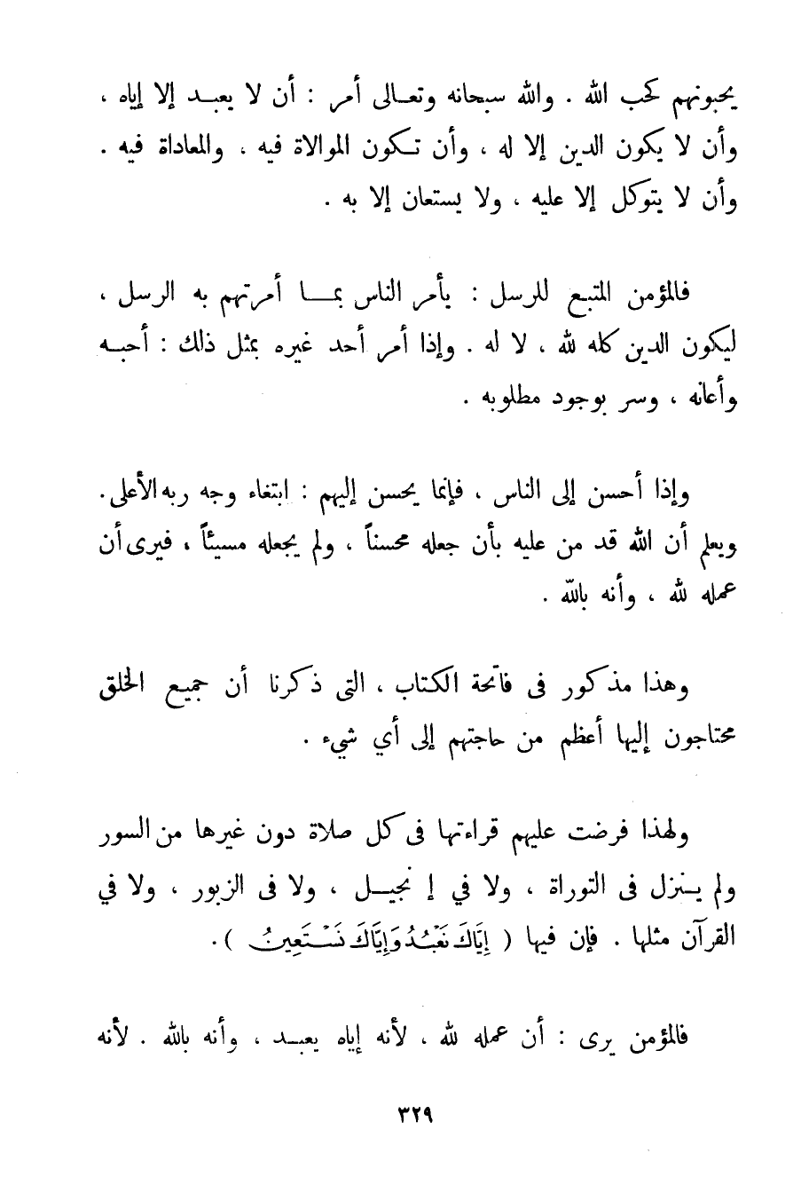 يُحِبُّونَهُمْ كَحُبِّ اللَّهِ. وَاَللَّهُ سُبْحَانَهُ وَتَعَالَى أَمَرَ: أَنْ لَا يُعْبَدَ إلَّا إيَّاهُ وَأَنْ لَا يَكُونَ الدِّينُ إلَّا لَهُ وَأَنْ تَكُونَ الْمُوَالَاةُ فِيهِ وَالْمُعَادَاةُ فِيهِ. وَأَنْ لَا يُتَوَكَّلَ إلَّا عَلَيْهِ وَلَا يُسْتَعَانَ إلَّا بِهِ. فَالْمُؤْمِنُ الْمُتَّبِعُ لِلرُّسُلِ: يَأْمُرُ النَّاسَ بِمَا أَمَرَتْهُمْ بِهِ الرُّسُلُ لِيَكُونَ الدِّينُ كُلُّهُ لِلَّهِ لَا لَهُ. وَإِذَا أَمَرَ أَحَدٌ غَيْرُهُ بِمِثْلِ ذَلِكَ: أَحَبَّهُ وَأَعَانَهُ وَسُرَّ بِوُجُودِ مَطْلُوبِهِ. وَإِذَا أَحْسَنَ إلَى النَّاسِ فَإِنَّمَا يُحْسِنُ إلَيْهِمْ: ابْتِغَاءَ وَجْهِ رَبِّهِ الْأَعْلَى. وَيَعْلَمُ أَنَّ اللَّهَ قَدْ مَنَّ عَلَيْهِ بِأَنْ جَعَلَهُ مُحْسِنًا وَلَمْ يَجْعَلْهُ مُسِيئًا فَيَرَى أَنَّ عَمَلَهُ لِلَّهِ وَأَنَّهُ بِاَللَّهِ. وَهَذَا مَذْكُورٌ فِي فَاتِحَةِ الْكِتَابِ الَّتِي ذَكَرْنَا أَنَّ جَمِيعَ الْخَلْقِ مُحْتَاجُونَ إلَيْهَا أَعْظَمَ مِنْ حَاجَتِهِمْ إلَى أَيْ شَيْءٍ. وَلِهَذَا فُرِضَتْ عَلَيْهِمْ قِرَاءَتُهَا فِي كُلِّ صَلَاةٍ دُونَ غَيْرِهَا مِنْ السُّوَرِ وَلَمْ يَنْزِلْ فِي التَّوْرَاةِ وَلَا فِي الْإِنْجِيلِ وَلَا فِي الزَّبُورِ وَلَا فِي الْقُرْآنِ مِثْلُهَا. فَإِنَّ فِيهَا {إيَّاكَ نَعْبُدُ وَإِيَّاكَ نَسْتَعِينُ} . فَالْمُؤْمِنُ يَرَى: أَنَّ عَمَلَهُ لِلَّهِ لِأَنَّهُ إيَّاهُ يَعْبُدُ وَأَنَّهُ بِاَللَّهِ. لِأَنَّهُ