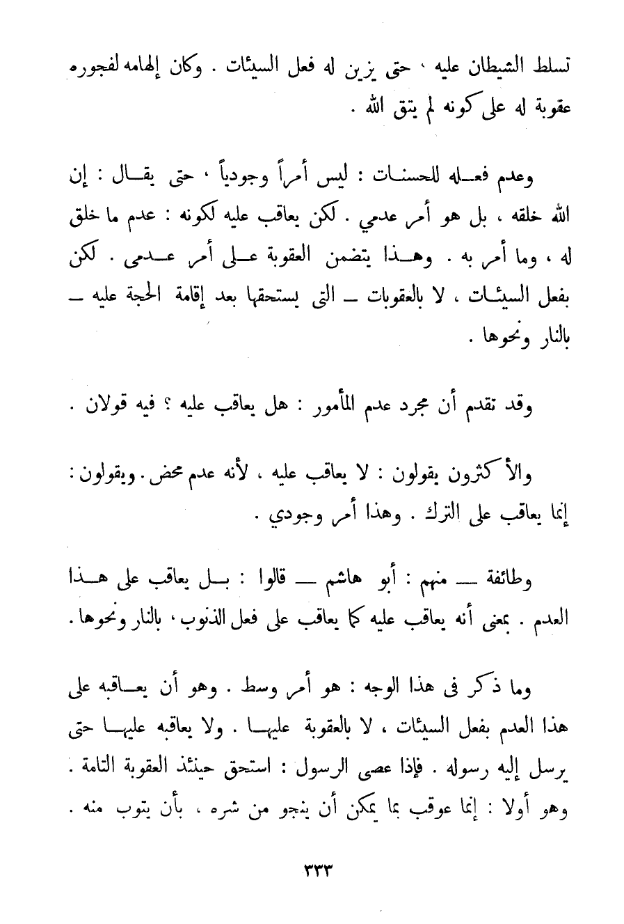 تَسَلُّطُ الشَّيْطَانِ عَلَيْهِ حَتَّى يُزَيِّنَ لَهُ فِعْلَ السَّيِّئَاتِ. وَكَانَ إلْهَامُهُ لِفُجُورِهِ عُقُوبَةً لَهُ عَلَى كَوْنِهِ لَمْ يَتَّقِ اللَّهَ. وَعَدَمُ فِعْلِهِ لِلْحَسَنَاتِ: لَيْسَ أَمْرًا وُجُودِيًّا حَتَّى يُقَالَ: إنَّ اللَّهَ خَلَقَهُ بَلْ هُوَ أَمْرٌ عَدَمِيٌّ. لَكِنْ يُعَاقَبُ عَلَيْهِ لِكَوْنِهِ: عَدِمَ مَا خُلِقَ لَهُ وَمَا أُمِرَ بِهِ. وَهَذَا يَتَضَمَّنُ الْعُقُوبَةَ عَلَى أَمْرٍ عَدَمِيٍّ. لَكِنْ بِفِعْلِ السَّيِّئَاتِ لَا بِالْعُقُوبَاتِ - الَّتِي يَسْتَحِقُّهَا بَعْدَ إقَامَةِ الْحُجَّةِ عَلَيْهِ - بِالنَّارِ وَنَحْوِهَا. وَقَدْ تَقَدَّمَ أَنَّ مُجَرَّدَ عَدَمِ الْمَأْمُورِ: هَلْ يُعَاقَبُ عَلَيْهِ؟ فِيهِ قَوْلَانِ. وَالْأَكْثَرُونَ يَقُولُونَ: لَا يُعَاقَبُ عَلَيْهِ لِأَنَّهُ عَدَمٌ مَحْضٌ. وَيَقُولُونَ: إنَّمَا يُعَاقَبُ عَلَى التَّرْكِ. وَهَذَا أَمْرٌ وُجُودِيٌّ. وَطَائِفَةٌ - مِنْهُمْ: أَبُو هَاشِمٍ - قَالُوا: بَلْ يُعَاقَبُ عَلَى هَذَا الْعَدَمِ. بِمَعْنَى أَنَّهُ يُعَاقَبُ عَلَيْهِ كَمَا يُعَاقَبُ عَلَى فِعْلِ الذُّنُوبِ بِالنَّارِ وَنَحْوِهَا. وَمَا ذُكِرَ فِي هَذَا الْوَجْهِ: هُوَ أَمْرٌ وَسَطٌ. وَهُوَ أَنْ يُعَاقِبَهُ عَلَى هَذَا الْعَدَمِ بِفِعْلِ السَّيِّئَاتِ لَا بِالْعُقُوبَةِ عَلَيْهَا. وَلَا يُعَاقِبُهُ عَلَيْهَا حَتَّى يُرْسِلَ إلَيْهِ رَسُولَهُ. فَإِذَا عَصَى الرَّسُولَ: اسْتَحَقَّ حِينَئِذٍ الْعُقُوبَةَ التَّامَّةَ. وَهُوَ أَوَّلًا: إنَّمَا عُوقِبَ بِمَا يُمْكِنُ أَنْ يَنْجُوَ مِنْ شَرِّهِ بِأَنْ يَتُوبَ مِنْهُ.