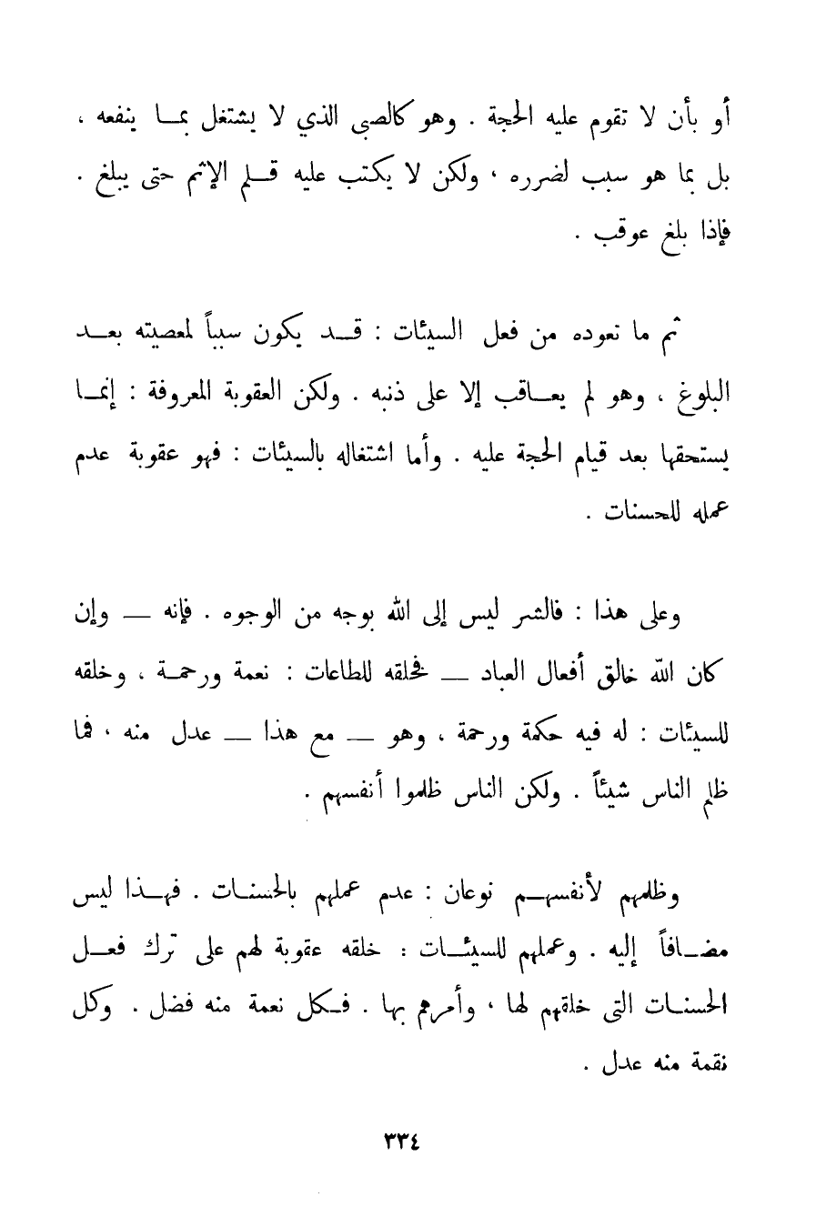 أَوْ بِأَنْ لَا تَقُومَ عَلَيْهِ الْحُجَّةُ. وَهُوَ كَالصَّبِيِّ الَّذِي لَا يَشْتَغِلُ بِمَا يَنْفَعُهُ بَلْ بِمَا هُوَ سَبَبٌ لِضَرَرِهِ وَلَكِنْ لَا يَكْتُبُ عَلَيْهِ قَلَمٌ الْإِثْمَ حَتَّى يَبْلُغَ. فَإِذَا بَلَغَ عُوقِبَ. ثُمَّ مَا تَعَوَّدَهُ مِنْ فِعْلِ السَّيِّئَاتِ: قَدْ يَكُونُ سَبَبًا لِمَعْصِيَتِهِ بَعْدَ الْبُلُوغِ وَهُوَ لَمْ يُعَاقَبْ إلَّا عَلَى ذَنْبِهِ. وَلَكِنَّ الْعُقُوبَةَ الْمَعْرُوفَةَ: إنَّمَا يَسْتَحِقُّهَا بَعْدَ قِيَامِ الْحُجَّةِ عَلَيْهِ. وَأَمَّا اشْتِغَالُهُ بِالسَّيِّئَاتِ: فَهُوَ عُقُوبَةُ عَدَمِ عَمَلِهِ لِلْحَسَنَاتِ. وَعَلَى هَذَا: فَالشَّرُّ لَيْسَ إلَى اللَّهِ بِوَجْهِ مِنْ الْوُجُوهِ. فَإِنَّهُ - وَإِنْ كَانَ اللَّهُ خَالِقَ أَفْعَالِ الْعِبَادِ - فَخَلْقُهُ لِلطَّاعَاتِ: نِعْمَةٌ وَرَحْمَةٌ وَخَلْقُهُ لِلسَّيِّئَاتِ: لَهُ فِيهِ حِكْمَةٌ وَرَحْمَةٌ وَهُوَ - مَعَ هَذَا - عَدْلٌ مِنْهُ فَمَا ظَلَمَ النَّاسَ شَيْئًا. وَلَكِنَّ النَّاسَ ظَلَمُوا أَنْفُسَهُمْ. وَظُلْمُهُمْ لِأَنْفُسِهِمْ نَوْعَانِ: عَدَمُ عَمَلِهِمْ بِالْحَسَنَاتِ. فَهَذَا لَيْسَ مُضَافًا إلَيْهِ. وَعَمَلُهُمْ لِلسَّيِّئَاتِ: خَلَقَهُ عُقُوبَةً لَهُمْ عَلَى تَرْكِ فِعْلِ الْحَسَنَاتِ الَّتِي خَلَقَهُمْ لَهَا وَأَمَرَهُمْ بِهَا. فَكُلُّ نِعْمَةٍ مِنْهُ فَضْلٌ. وَكُلُّ نِقْمَةٍ مِنْهُ عَدْلٌ.