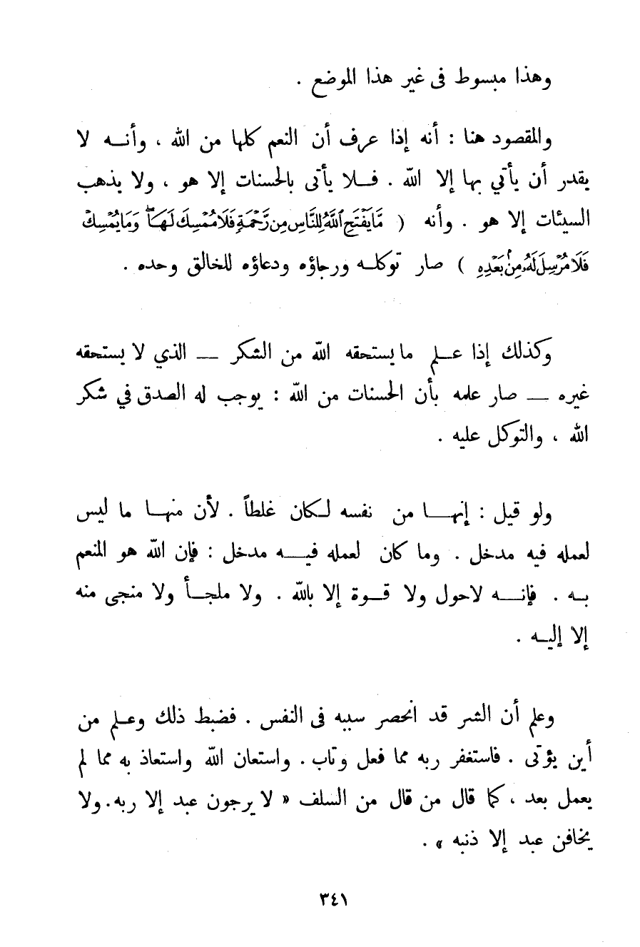 وَهَذَا مَبْسُوطٌ فِي غَيْرِ هَذَا الْمَوْضِعِ. وَالْمَقْصُودُ هُنَا: أَنَّهُ إذَا عَرَفَ أَنَّ النِّعَمَ كُلَّهَا مِنْ اللَّهِ وَأَنَّهُ لَا مُقَدِّرَ أَنْ يَأْتِيَ بِهَا إلَّا اللَّهُ. فَلَا يَأْتِي بِالْحَسَنَاتِ إلَّا هُوَ وَلَا يُذْهِبُ السَّيِّئَاتِ إلَّا هُوَ. وَأَنَّهُ {مَا يَفْتَحِ اللَّهُ لِلنَّاسِ مِنْ رَحْمَةٍ فَلَا مُمْسِكَ لَهَا وَمَا يُمْسِكْ فَلَا مُرْسِلَ لَهُ مِنْ بَعْدِهِ} صَارَ تَوَكُّلُهُ وَرَجَاؤُهُ وَدُعَاؤُهُ لِلْخَالِقِ وَحْدَهُ. وَكَذَلِكَ إذَا عَلِمَ مَا يَسْتَحِقُّهُ اللَّهُ مِنْ الشُّكْرِ - الَّذِي لَا يَسْتَحِقُّهُ غَيْرُهُ - صَارَ عِلْمُهُ بِأَنَّ الْحَسَنَاتِ مِنْ اللَّهِ: يُوجِبُ لَهُ الصِّدْقَ فِي شُكْرِ اللَّهِ وَالتَّوَكُّلِ عَلَيْهِ. وَلَوْ قِيلَ: إنَّهَا مِنْ نَفْسِهِ لَكَانَ غَلَطًا. لِأَنَّ مِنْهَا مَا لَيْسَ لِعَمَلِهِ فِيهِ مَدْخَلٌ. وَمَا كَانَ لِعَمَلِهِ فِيهِ مَدْخَلٌ: فَإِنَّ اللَّهَ هُوَ الْمُنْعِمُ بِهِ. فَإِنَّهُ لَا حَوْلَ وَلَا قُوَّةَ إلَّا بِاَللَّهِ. وَلَا مَلْجَأَ وَلَا مَنْجَى مِنْهُ إلَّا إلَيْهِ. وَعَلِمَ أَنَّ الشَّرَّ قَدْ انْحَصَرَ سَبَبُهُ فِي النَّفْسِ. فَضَبَطَ ذَلِكَ وَعَلِمَ مِنْ أَيْنَ يُؤْتَى. فَاسْتَغْفَرَ رَبَّهُ مِمَّا فَعَلَ وَتَابَ. وَاسْتَعَانَ اللَّهَ وَاسْتَعَاذَ بِهِ مِمَّا لَمْ يَعْمَلْ بَعْدُ كَمَا قَالَ مَنْ قَالَ مِنْ السَّلَفِ " لَا يَرْجُوَنَّ عَبْدٌ إلَّا رَبَّهُ. وَلَا يَخَافَنَّ عَبْدٌ إلَّا ذَنْبَهُ ".