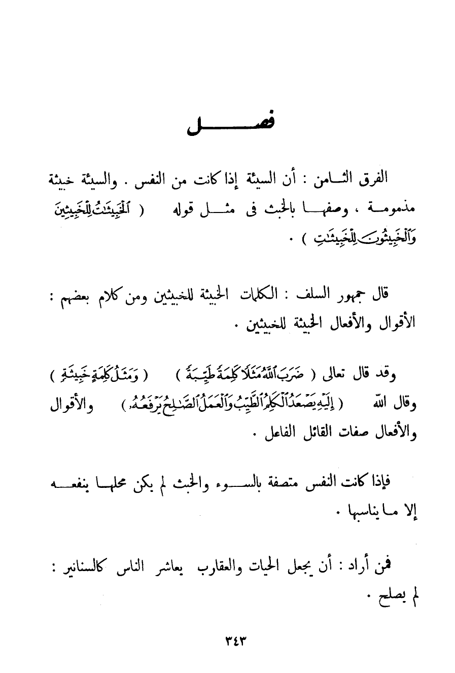 الْفَرْقُ الثَّامِنُ: أَنَّ السَّيِّئَةَ إذَا كَانَتْ مِنْ النَّفْسِ. وَالسَّيِّئَةُ خَبِيثَةٌ مَذْمُومَةٌ وَصَفَهَا بِالْخُبْثِ فِي مِثْلِ قَوْلِهِ {الْخَبِيثَاتُ لِلْخَبِيثِينَ وَالْخَبِيثُونَ لِلْخَبِيثَاتِ} .