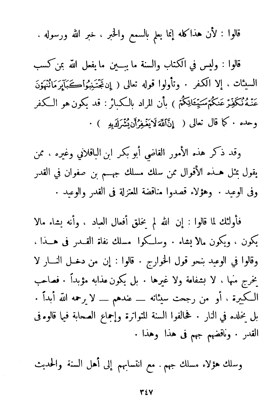 قَالُوا: لِأَنَّ هَذَا كُلَّهُ إنَّمَا يُعْلَمُ بِالسَّمْعِ وَالْخَبَرِ خَبَرِ اللَّهِ وَرَسُولِهِ. قَالُوا: وَلَيْسَ فِي الْكِتَابِ وَالسُّنَّةِ مَا يُبَيِّنُ مَا يَفْعَلُ اللَّهُ بِمَنْ كَسَبَ السَّيِّئَاتِ إلَّا الْكُفْرَ. وَتَأَوَّلُوا قَوْله تَعَالَى {إنْ تَجْتَنِبُوا كَبَائِرَ مَا تُنْهَوْنَ عَنْهُ نُكَفِّرْ عَنْكُمْ سَيِّئَاتِكُمْ} بِأَنَّ الْمُرَادَ بِالْكَبَائِرِ: قَدْ يَكُونُ هُوَ الْكُفْرُ وَحْدَهُ. كَمَا قَالَ تَعَالَى {إنَّ اللَّهَ لَا يَغْفِرُ أَنْ يُشْرَكَ بِهِ} . وَقَدْ ذَكَرَ هَذِهِ الْأُمُورَ الْقَاضِي أَبُو بَكْرٍ ابْنُ الْبَاقِلَانِي وَغَيْرُهُ مِمَّنْ يَقُولُ بِمِثْلِ هَذِهِ الْأَقْوَالِ مِمَّنْ سَلَكَ مَسْلَكَ جَهْمِ بْنِ صَفْوَانَ فِي الْقَدَرِ وَفِي الْوَعِيدِ. وَهَؤُلَاءِ قَصَدُوا مُنَاقَضَةَ الْمُعْتَزِلَةِ فِي الْقَدَرِ وَالْوَعِيدِ. فَأُولَئِكَ لَمَّا قَالُوا: إنَّ اللَّهَ لَمْ يَخْلُقْ أَفْعَالَ الْعِبَادِ وَأَنَّهُ يَشَاءُ مَا لَا يَكُونُ وَيَكُونُ مَا لَا يَشَاءُ. وَسَلَكُوا مَسْلَكَ نفاة الْقَدَرِ فِي هَذَا وَقَالُوا فِي الْوَعِيدِ بِنَحْوِ قَوْلِ الْخَوَارِجِ. قَالُوا: إنَّ مَنْ دَخَلَ النَّارَ لَا يَخْرُجُ مِنْهَا لَا بِشَفَاعَةِ وَلَا غَيْرِهَا. بَلْ يَكُونُ عَذَابُهُ مُؤَبَّدًا. فَصَاحِبُ الْكَبِيرَةِ أَوْ مَنْ رَجَحَتْ سَيِّئَاتُهُ - عِنْدَهُمْ - لَا يَرْحَمُهُ اللَّهُ أَبَدًا. بَلْ يُخَلِّدُهُ فِي النَّارِ. فَخَالَفُوا السُّنَّةَ الْمُتَوَاتِرَةَ وَإِجْمَاعَ الصَّحَابَةِ فِيمَا قَالُوهُ فِي الْقَدَرِ. وَنَاقَضَهُمْ جَهْمٌ فِي هَذَا وَهَذَا. وَسَلَكَ هَؤُلَاءِ مَسْلَكَ جَهْمٍ. مَعَ انْتِسَابِهِمْ إلَى أَهْلِ السُّنَّةِ وَالْحَدِيثِ