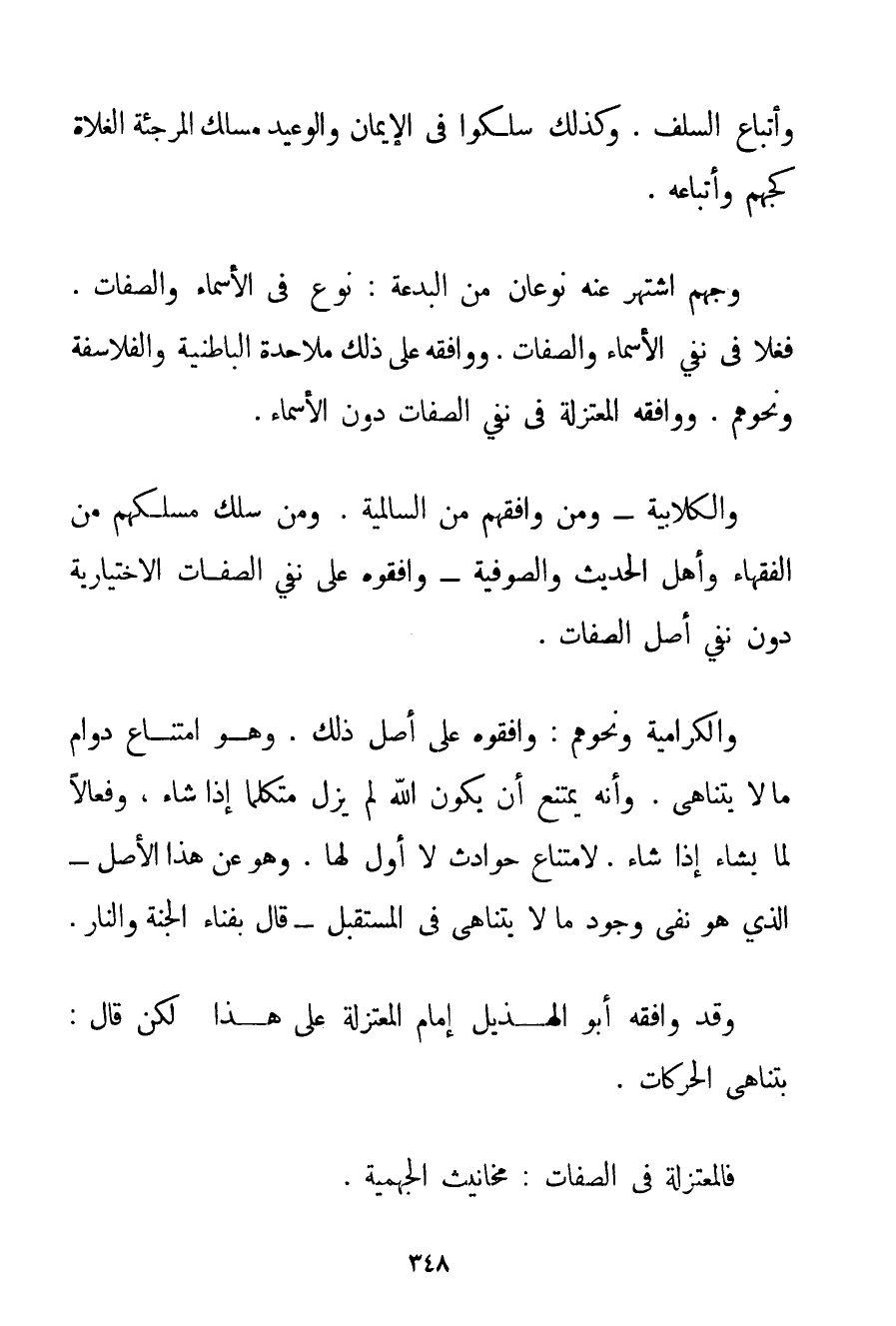 وَأَتْبَاعِ السَّلَفِ. وَكَذَلِكَ سَلَكُوا فِي الْإِيمَانِ وَالْوَعِيدِ مَسْلَكَ الْمُرْجِئَةِ الْغُلَاةِ كَجَهْمِ وَأَتْبَاعِهِ. وَجَهْمٌ اُشْتُهِرَ عَنْهُ نَوْعَانِ مِنْ الْبِدْعَةِ: نَوْعٌ فِي الْأَسْمَاءِ وَالصِّفَاتِ. فَغَلَا فِي نَفْيِ الْأَسْمَاءِ وَالصِّفَاتِ. وَوَافَقَهُ عَلَى ذَلِكَ مَلَاحِدَةُ الْبَاطِنِيَّةِ وَالْفَلَاسِفَةِ وَنَحْوِهِمْ. وَوَافَقَهُ الْمُعْتَزِلَةُ فِي نَفْيِ الصِّفَاتِ دُونَ الْأَسْمَاءِ. والْكُلَّابِيَة - وَمَنْ وَافَقَهُمْ مِنْ السالمية. وَمَنْ سَلَكَ مَسْلَكَهُمْ مِنْ الْفُقَهَاءِ وَأَهْلِ الْحَدِيثِ وَالصُّوفِيَّةِ - وَافَقُوهُ عَلَى نَفْيِ الصِّفَاتِ الِاخْتِيَارِيَّةِ دُونَ نَفْيِ أَصْلِ الصِّفَاتِ. وَالْكَرَامِيَّة وَنَحْوُهُمْ: وَافَقُوهُ عَلَى أَصْلِ ذَلِكَ. وَهُوَ امْتِنَاعُ دَوَامِ مَا لَا يَتَنَاهَى. وَأَنَّهُ يَمْتَنِعُ أَنْ يَكُونَ اللَّهُ لَمْ يَزَلْ مُتَكَلِّمًا إذَا شَاءَ وَفَعَّالًا لِمَا يَشَاءُ إذَا شَاءَ. لِامْتِنَاعِ حَوَادِثَ لَا أَوَّلَ لَهَا. وَهُوَ عَنْ هَذَا الْأَصْلِ - الَّذِي هُوَ نَفْيُ وُجُودِ مَا لَا يَتَنَاهَى فِي الْمُسْتَقْبَلِ - قَالَ بِفَنَاءِ الْجَنَّةِ وَالنَّارِ. وَقَدْ وَافَقَهُ أَبُو الهذيل إمَامُ الْمُعْتَزِلَةِ عَلَى هَذَا لَكِنْ قَالَ: بِتَنَاهِي الْحَرَكَاتِ. فَالْمُعْتَزِلَةُ فِي الصِّفَاتِ: مَخَانِيثُ الْجَهْمِيَّة.