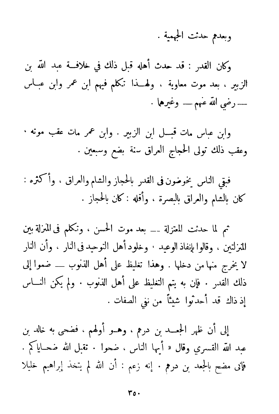 وَبَعْدَهُمْ حَدَثَتْ الْجَهْمِيَّة. وَكَانَ الْقَدَرُ: قَدْ حَدَّثَ أَهْلُهُ قَبْلَ ذَلِكَ فِي خِلَافَةِ عَبْدِ اللَّهِ بْنِ الزُّبَيْرِ بَعْدَ مَوْتِ مُعَاوِيَةَ وَلِهَذَا تَكَلَّمَ فِيهِمْ ابْنُ عُمَرَ وَابْنُ عَبَّاسٍ - رَضِيَ اللَّهُ عَنْهُمْ - وَغَيْرُهُمَا. وَابْنُ عَبَّاسٍ مَاتَ قَبْلَ ابْنِ الزُّبَيْرِ. وَابْنُ عُمَرَ مَاتَ عَقِبَ مَوْتِهِ وَعَقِبَ ذَلِكَ تَوَلَّى الْحَجَّاجُ الْعِرَاقَ سَنَةَ بِضْعٍ وَسَبْعِينَ. فَبَقِيَ النَّاسُ يَخُوضُونَ فِي الْقَدَرِ بِالْحِجَازِ وَالشَّامِ وَالْعِرَاقِ وَأَكْثَرُهُ: كَانَ بِالشَّامِ وَالْعِرَاقِ بِالْبَصْرَةِ وَأَقَلُّهُ: كَانَ بِالْحِجَازِ. ثُمَّ لَمَّا حَدَثَتْ الْمُعْتَزِلَةُ - بَعْدَ مَوْتِ الْحَسَنِ وَتُكُلِّمَ فِي الْمَنْزِلَةِ بَيْنَ الْمَنْزِلَتَيْنِ وَقَالُوا بِإِنْفَاذِ الْوَعِيدِ وَخُلُودِ أَهْلِ التَّوْحِيدِ فِي النَّارِ وَأَنَّ النَّارَ لَا يَخْرُجُ مِنْهَا مَنْ دَخَلَهَا. وَهَذَا تَغْلِيظٌ عَلَى أَهْلِ الذُّنُوبِ - ضَمُّوا إلَى ذَلِكَ الْقَدَرَ. فَإِنَّ بِهِ يَتِمُّ التَّغْلِيظُ عَلَى أَهْلِ الذُّنُوبِ. وَلَمْ يَكُنْ النَّاسُ إذْ ذَاكَ قَدْ أَحْدَثُوا شَيْئًا مِنْ نَفْيِ الصِّفَاتِ. إلَى أَنْ ظَهَرَ الْجَعْدُ بْنُ دِرْهَمٍ وَهُوَ أَوَّلُهُمْ فَضَحَّى بِهِ خَالِدُ بْنُ عَبْدِ اللَّهِ الْقَسْرِيُّ وَقَالَ " أَيُّهَا النَّاسُ ضَحُّوا. تَقَبَّلَ اللَّهُ ضَحَايَاكُمْ. فَإِنِّي مُضَحٍّ بِالْجَعْدِ بْنِ دِرْهَمٍ. إنَّهُ زَعَمَ: أَنَّ اللَّهَ لَمْ يَتَّخِذْ إبْرَاهِيمَ خَلِيلًا