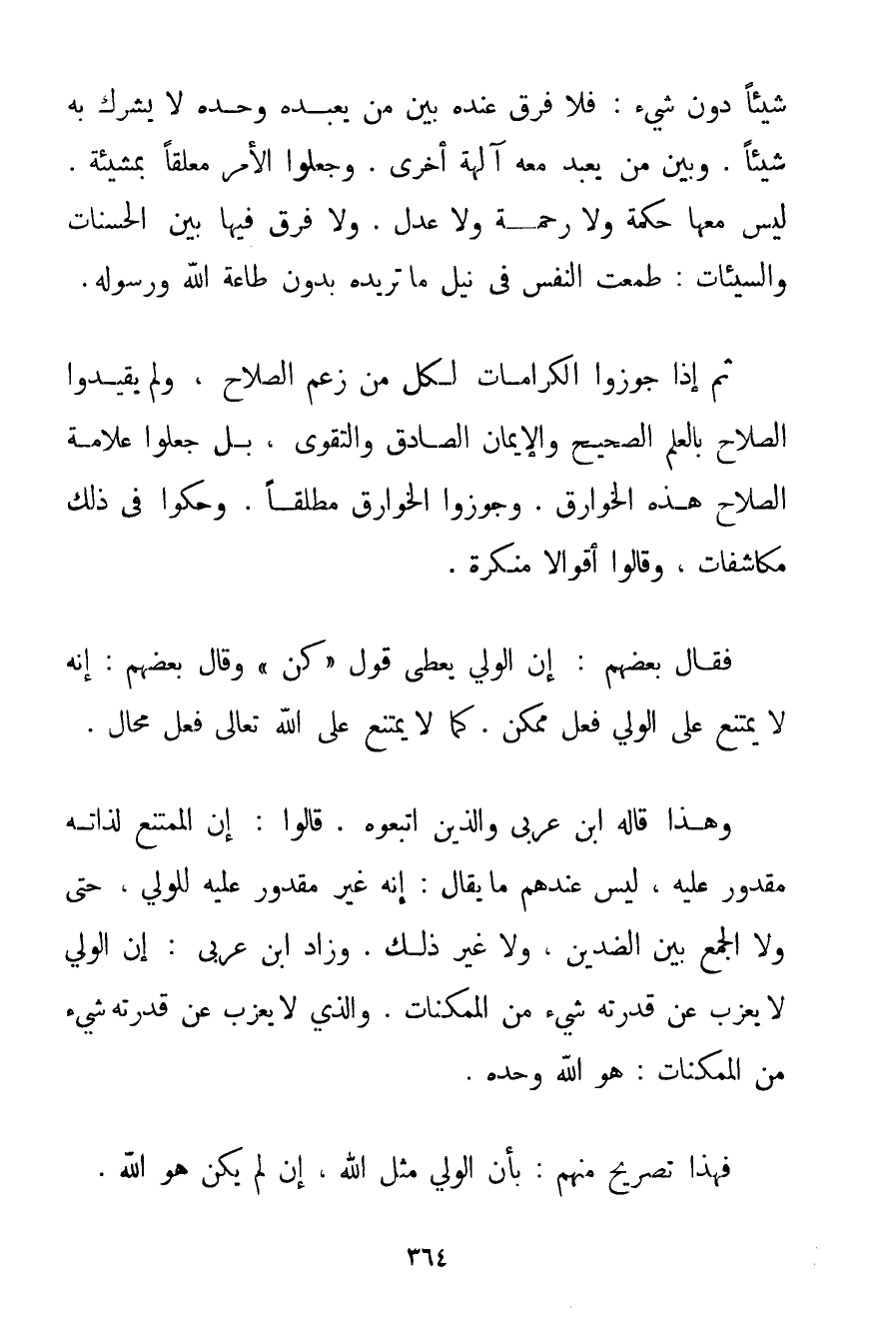 شَيْئًا دُونَ شَيْءٍ: فَلَا فَرْقَ عِنْدَهُ بَيْنَ مَنْ يَعْبُدُهُ وَحْدَهُ لَا يُشْرِكُ بِهِ شَيْئًا. وَبَيْنَ مَنْ يَعْبُدُ مَعَهُ آلِهَةً أُخْرَى. وَجَعَلُوا الْأَمْرَ مُعَلَّقًا بِمَشِيئَةِ. لَيْسَ مَعَهَا حِكْمَةٌ وَلَا رَحْمَةٌ وَلَا عَدْلٌ. وَلَا فَرْقَ فِيهَا بَيْنَ الْحَسَنَاتِ وَالسَّيِّئَاتِ: طَمِعَتْ النَّفْسُ فِي نَيْلِ مَا تُرِيدُهُ بِدُونِ طَاعَةِ اللَّهِ وَرَسُولِهِ. ثُمَّ إذَا جَوَّزُوا الْكَرَامَاتِ لِكُلِّ مَنْ زَعَمَ الصَّلَاحَ وَلَمْ يُقَيِّدُوا الصَّلَاحَ بِالْعِلْمِ الصَّحِيحِ وَالْإِيمَانِ الصَّادِقِ وَالتَّقْوَى بَلْ جَعَلُوا عَلَامَةَ الصَّلَاحِ هَذِهِ الْخَوَارِقَ. وَجَوَّزُوا الْخَوَارِقَ مُطْلَقًا. وَحَكَوْا فِي ذَلِكَ مُكَاشَفَاتٍ وَقَالُوا أَقْوَالًا مُنْكَرَةً. فَقَالَ بَعْضُهُمْ: إنَّ الْوَلِيَّ يُعْطَى قَوْلَ " كُنْ " وَقَالَ بَعْضُهُمْ: إنَّهُ لَا يَمْتَنِعُ عَلَى الْوَلِيِّ فِعْلُ مُمْكِنٍ. كَمَا لَا يَمْتَنِعُ عَلَى اللَّهِ تَعَالَى فِعْلُ مُحَالٍ. وَهَذَا قَالَهُ ابْنُ عَرَبِيٍّ وَاَلَّذِينَ اتَّبَعُوهُ. قَالُوا: إنَّ الْمُمْتَنِعَ لِذَاتِهِ مَقْدُورٌ عَلَيْهِ لَيْسَ عِنْدَهُمْ مَا يُقَالُ: إنَّهُ غَيْرُ مَقْدُورٍ عَلَيْهِ لِلْوَلِيِّ حَتَّى وَلَا الْجَمْعُ بَيْنَ الضِّدَّيْنِ وَلَا غَيْرَ ذَلِكَ. وَزَادَ ابْنُ عَرَبِيٍّ: أَنَّ الْوَلِيَّ لَا يَعْزُبُ عَنْ قُدْرَتِهِ شَيْءٌ مِنْ الْمُمْكِنَاتِ. وَاَلَّذِي لَا يَعْزُبُ عَنْ قُدْرَتِهِ شَيْءٌ مِنْ الْمُمْكِنَاتِ: هُوَ اللَّهُ وَحْدَهُ. فَهَذَا تَصْرِيحٌ مِنْهُمْ: بِأَنَّ الْوَلِيَّ مِثْلُ اللَّهِ إنْ لَمْ يَكُنْ هُوَ اللَّهُ.