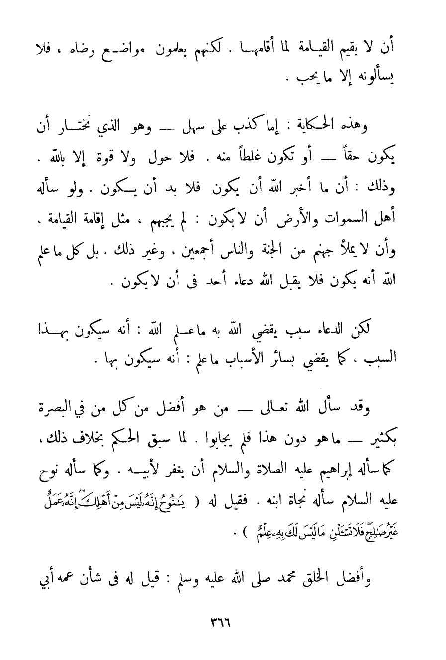 أَنْ لَا يُقِيمَ الْقِيَامَةَ لَمَا أَقَامَهَا. لَكِنَّهُمْ يَعْلَمُونَ مَوَاضِعَ رِضَاهُ فَلَا يَسْأَلُونَهُ إلَّا مَا يُحِبُّ. وَهَذِهِ الْحِكَايَةُ: إمَّا كَذِبٌ عَلَى سَهْلٍ - وَهُوَ الَّذِي نَخْتَارُ أَنْ يَكُونَ حَقًّا - أَوْ تَكُونَ غَلَطًا مِنْهُ. فَلَا حَوْلَ وَلَا قُوَّةَ إلَّا بِاَللَّهِ. وَذَلِكَ: أَنَّ مَا أَخْبَرَ اللَّهُ أَنْ يَكُونَ فَلَا بُدَّ أَنْ يَكُونَ. وَلَوْ سَأَلَهُ أَهْلُ السَّمَوَاتِ وَالْأَرْضِ أَنْ لَا يَكُونَ: لَمْ يُجِبْهُمْ مِثْلُ إقَامَةِ الْقِيَامَةِ وَأَنْ لَا يَمْلَأَ جَهَنَّمَ مِنْ الْجِنَّةِ وَالنَّاسِ أَجْمَعِينَ وَغَيْرُ ذَلِكَ. بَلْ كُلُّ مَا عَلِمَ اللَّهُ أَنَّهُ يَكُونُ فَلَا يَقْبَلُ اللَّهُ دُعَاءَ أَحَدٍ فِي أَنْ لَا يَكُونَ. لَكِنَّ الدُّعَاءَ سَبَبٌ يَقْضِي اللَّهُ بِهِ مَا عَلِمَ اللَّهُ: أَنَّهُ سَيَكُونُ بِهَذَا السَّبَبِ كَمَا يَقْضِي بِسَائِرِ الْأَسْبَابِ مَا عَلِمَ: أَنَّهُ سَيَكُونُ بِهَا. وَقَدْ سَأَلَ اللَّهَ تَعَالَى - مَنْ هُوَ أَفْضَلُ مِنْ كُلِّ مَنْ فِي الْبَصْرَةِ بِكَثِيرِ - مَا هُوَ دُونَ هَذَا فَلَمْ يُجَابُوا. لِمَا سَبَقَ الْحُكْمُ بِخِلَافِ ذَلِكَ كَمَا سَأَلَهُ إبْرَاهِيمُ عَلَيْهِ الصَّلَاةُ وَالسَّلَامُ أَنْ يَغْفِرَ لِأَبِيهِ. وَكَمَا سَأَلَهُ نُوحٌ عَلَيْهِ السَّلَامُ سَأَلَهُ نَجَاةَ ابْنِهِ. فَقِيلَ لَهُ {يَا نُوحُ إنَّهُ لَيْسَ مِنْ أَهْلِكَ إنَّهُ عَمَلٌ غَيْرُ صَالِحٍ فَلَا تَسْأَلْنِي مَا لَيْسَ لَكَ بِهِ عِلْمٌ} . وَأَفْضَلُ الْخَلْقِ مُحَمَّدٌ صَلَّى اللَّهُ عَلَيْهِ وَسَلَّمَ قِيلَ لَهُ فِي شَأْنِ عَمِّهِ أَبِي
