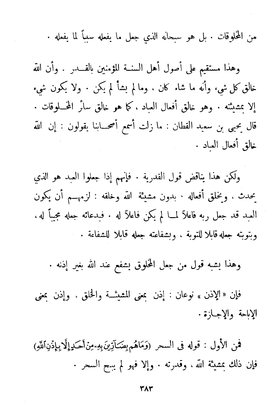 مِنْ الْمَخْلُوقَاتِ. بَلْ هُوَ سُبْحَانَهُ الَّذِي جَعَلَ مَا يَفْعَلُهُ سَبَبًا لِمَا يَفْعَلُهُ. وَهَذَا مُسْتَقِيمٌ عَلَى أُصُولِ أَهْلِ السُّنَّةِ الْمُؤْمِنِينَ بِالْقَدَرِ وَأَنَّ اللَّهَ خَالِقُ كُلِّ شَيْءٍ وَأَنَّهُ مَا شَاءَ كَانَ وَمَا لَمْ يَشَأْ لَمْ يَكُنْ. وَلَا يَكُونُ شَيْءٌ إلَّا بِمَشِيئَتِهِ. وَهُوَ خَالِقُ أَفْعَالِ الْعِبَادِ كَمَا هُوَ خَالِقُ سَائِرِ الْمَخْلُوقَاتِ. قَالَ يَحْيَى بْنُ سَعِيدٍ الْقَطَّانُ: مَا زِلْت أَسْمَعُ أَصْحَابَنَا يَقُولُونَ: إنَّ اللَّهَ خَالِقُ أَفْعَالِ الْعِبَادِ. وَلَكِنَّ هَذَا يُنَاقِضُ قَوْلَ الْقَدَرِيَّةِ. فَإِنَّهُمْ إذَا جَعَلُوا الْعَبْدَ هُوَ الَّذِي يُحْدِثُ وَيَخْلُقُ أَفْعَالَهُ بِدُونِ مَشِيئَةِ اللَّهِ وَخَلْقِهِ: لَزِمَهُمْ أَنْ يَكُونَ الْعَبْدُ قَدْ جَعَلَ رَبَّهُ فَاعِلًا لِمَا لَمْ يَكُنْ فَاعِلًا لَهُ. فَبِدُعَائِهِ جَعَلَهُ مُجِيبًا لَهُ وَبِتَوْبَتِهِ جَعَلَهُ قَابِلًا لِلتَّوْبَةِ وَبِشَفَاعَتِهِ جَعَلَهُ قَابِلًا لِلشَّفَاعَةِ. وَهَذَا يُشْبِهُ قَوْلَ مَنْ جَعَلَ الْمَخْلُوقَ يَشْفَعُ عِنْدَ اللَّهِ بِغَيْرِ إذْنِهِ. فَإِنَّ " الْإِذْنَ " نَوْعَانِ: إذْنٌ بِمَعْنَى الْمَشِيئَةِ وَالْخَلْقِ وَإِذْنٌ بِمَعْنَى الْإِبَاحَةِ وَالْإِجَازَةِ. فَمِنْ الْأَوَّلِ: قَوْلُهُ فِي السِّحْرِ {وَمَا هُمْ بِضَارِّينَ بِهِ مِنْ أَحَدٍ إلَّا بِإِذْنِ اللَّهِ} فَإِنَّ ذَلِكَ بِمَشِيئَةِ اللَّهِ وَقُدْرَتِهِ. وَإِلَّا فَهُوَ لَمْ يُبِحْ السِّحْرَ.