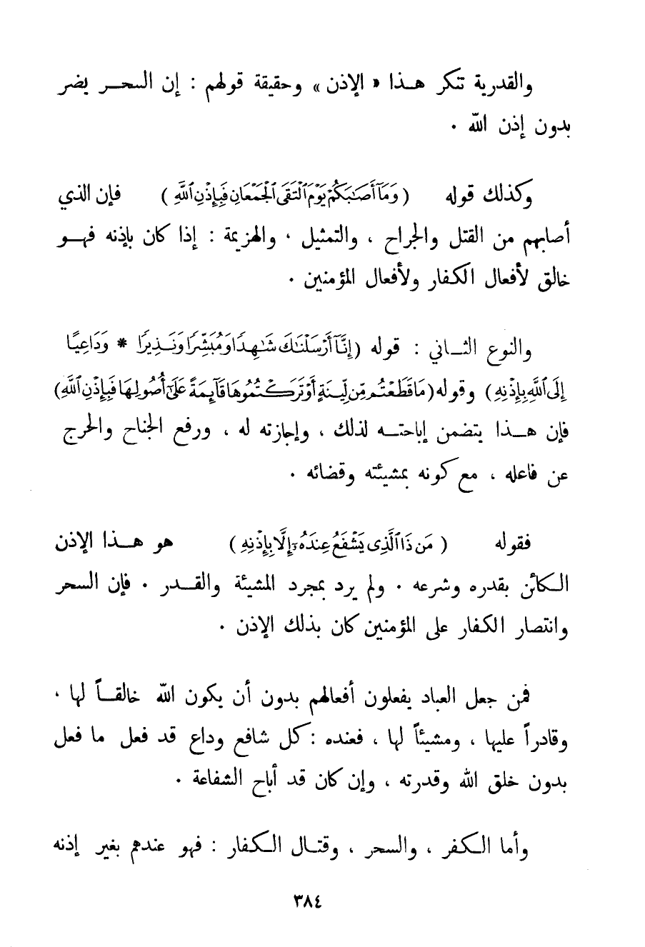 وَالْقَدَرِيَّةُ تُنْكِرُ هَذَا " الْإِذْنَ " وَحَقِيقَةُ قَوْلِهِمْ: إنَّ السِّحْرَ يَضُرُّ بِدُونِ إذْنِ اللَّهِ. وَكَذَلِكَ قَوْلُهُ {وَمَا أَصَابَكُمْ يَوْمَ الْتَقَى الْجَمْعَانِ فَبِإِذْنِ اللَّهِ} فَإِنَّ الَّذِي أَصَابَهُمْ مِنْ الْقَتْلِ وَالْجِرَاحِ وَالتَّمْثِيلِ وَالْهَزِيمَةِ: إذَا كَانَ بِإِذْنِهِ فَهُوَ خَالِقٌ لِأَفْعَالِ الْكُفَّارِ وَلِأَفْعَالِ الْمُؤْمِنِينَ. وَالنَّوْعُ الثَّانِي: قَوْلُهُ {إنَّا أَرْسَلْنَاكَ شَاهِدًا وَمُبَشِّرًا وَنَذِيرًا} {وَدَاعِيًا إلَى اللَّهِ بِإِذْنِهِ} وَقَوْلُهُ {مَا قَطَعْتُمْ مِنْ لِينَةٍ أَوْ تَرَكْتُمُوهَا قَائِمَةً عَلَى أُصُولِهَا فَبِإِذْنِ اللَّهِ} فَإِنَّ هَذَا يَتَضَمَّنُ إبَاحَتَهُ لِذَلِكَ وَإِجَازَتَهُ لَهُ وَرَفْعَ الْجُنَاحِ وَالْحَرَجِ عَنْ فَاعِلِهِ مَعَ كَوْنِهِ بِمَشِيئَتِهِ وَقَضَائِهِ. فَقَوْلُهُ {مَنْ ذَا الَّذِي يَشْفَعُ عِنْدَهُ إلَّا بِإِذْنِهِ} هُوَ هَذَا الْإِذْنُ الْكَائِنُ بِقَدَرِهِ وَشَرْعِهِ. وَلَمْ يُرِدْ بِمُجَرَّدِ الْمَشِيئَةِ وَالْقَدَرِ. فَإِنَّ السِّحْرَ وَانْتِصَارَ الْكُفَّارِ عَلَى الْمُؤْمِنِينَ كَانَ بِذَلِكَ الْإِذْنُ. فَمَنْ جَعَلَ الْعِبَادَ يَفْعَلُونَ أَفْعَالَهُمْ بِدُونِ أَنْ يَكُونَ اللَّهُ خَالِقًا لَهَا وَقَادِرًا عَلَيْهَا وَمُشِيئًا لَهَا فَعِنْدَهُ: كُلُّ شَافِعٍ وَدَاعٍ قَدْ فَعَلَ مَا فَعَلَ بِدُونِ خَلْقِ اللَّهِ وَقُدْرَتِهِ وَإِنْ كَانَ قَدْ أَبَاحَ الشَّفَاعَةَ. وَأَمَّا الْكُفْرُ وَالسِّحْرُ وَقِتَالُ الْكُفَّارِ: فَهُوَ عِنْدُهُمْ بِغَيْرِ إذْنِهِ
