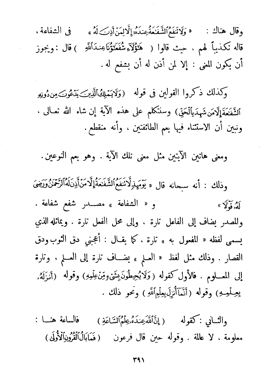 وَقَالَ هُنَاكَ: {وَلَا تَنْفَعُ الشَّفَاعَةُ عِنْدَهُ إلَّا لِمَنْ أَذِنَ لَهُ} فِي الشَّفَاعَةِ قَالَهُ تَكْذِيبًا لَهُمْ حَيْثُ قَالُوا {هَؤُلَاءِ شُفَعَاؤُنَا عِنْدَ اللَّهِ} قَالَ: وَيَجُوزُ أَنْ يَكُونَ الْمَعْنَى: إلَّا لِمَنْ أَذِنَ لَهُ أَنْ يَشْفَعَ لَهُ. وَكَذَلِكَ ذَكَرُوا الْقَوْلَيْنِ فِي قَوْلِهِ {وَلَا يَمْلِكُ الَّذِينَ يَدْعُونَ مِنْ دُونِهِ الشَّفَاعَةَ إلَّا مَنْ شَهِدَ بِالْحَقِّ} وَسَنَتَكَلَّمُ عَلَى هَذِهِ الْآيَةِ إنْ شَاءَ اللَّهُ تَعَالَى وَنُبَيِّنُ أَنَّ الِاسْتِثْنَاءَ فِيهَا يَعُمُّ الطَّائِفَتَيْنِ وَأَنَّهُ مُنْقَطِعٌ. وَمَعْنَى هَاتَيْنِ الْآيَتَيْنِ مِثْلُ مَعْنَى تِلْكَ الْآيَةِ. وَهُوَ يَعُمُّ النَّوْعَيْنِ. وَذَلِكَ: أَنَّهُ سُبْحَانَهُ قَالَ {يَوْمَئِذٍ لَا تَنْفَعُ الشَّفَاعَةُ إلَّا مَنْ أَذِنَ لَهُ الرَّحْمَنُ وَرَضِيَ لَهُ قَوْلًا} و " الشَّفَاعَةُ " مَصْدَرُ شَفَعَ شَفَاعَةً. وَالْمَصْدَرُ يُضَافُ إلَى الْفَاعِلِ تَارَةً وَإِلَى مَحَلِّ الْفِعْلِ تَارَةً. وَيُمَاثِلُهُ الَّذِي يُسَمَّى لَفْظُهُ " الْمَفْعُولَ بِهِ " تَارَةً كَمَا يُقَالُ: أَعْجَبَنِي دَقُّ الثَّوْبِ وَدَقُّ الْقَصَّارِ. وَذَلِكَ مِثْلُ لَفْظِ " الْعِلْمِ " يُضَافُ تَارَةً إلَى الْعِلْمِ وَتَارَةً إلَى الْمَعْلُومِ. فَالْأَوَّلُ كَقَوْلِهِ {وَلَا يُحِيطُونَ بِشَيْءٍ مِنْ عِلْمِهِ} وَقَوْلِهِ {أَنْزَلَهُ بِعِلْمِهِ} وَقَوْلِهِ {أَنَّمَا أُنْزِلَ بِعِلْمِ اللَّهِ} وَنَحْوِ ذَلِكَ. وَالثَّانِي: كَقَوْلِهِ {إنَّ اللَّهَ عِنْدَهُ عِلْمُ السَّاعَةِ} فَالسَّاعَةُ هُنَا: مَعْلُومَةٌ لَا عَالِمَةً. وَقَوْلِهِ حِينَ قَالَ فِرْعَوْنُ {فَمَا بَالُ الْقُرُونِ الْأُولَى}
