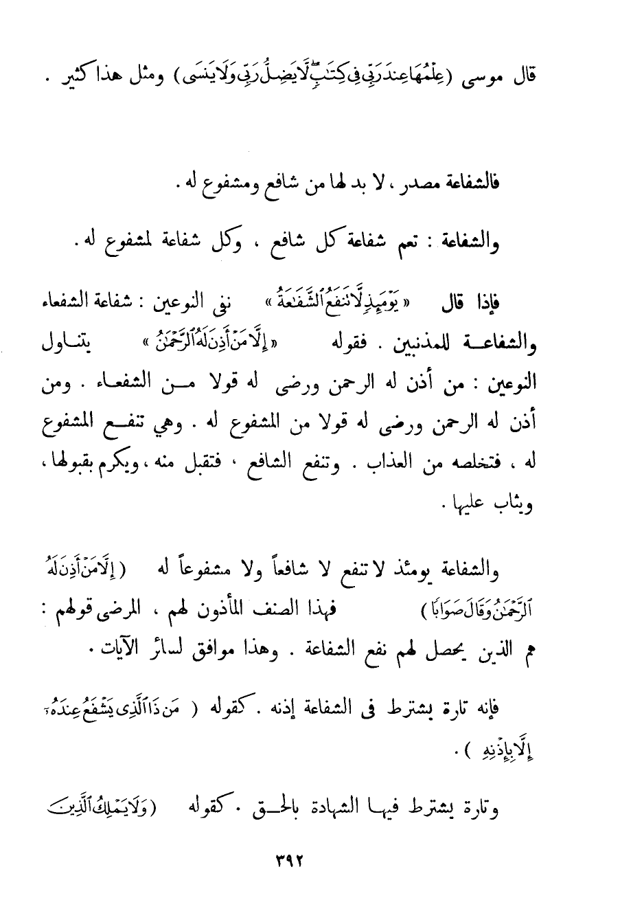 قَالَ مُوسَى {عِلْمُهَا عِنْدَ رَبِّي فِي كِتَابٍ لَا يَضِلُّ رَبِّي وَلَا يَنْسَى} وَمَثَلِ هَذَا كَثِيرٌ. فَالشَّفَاعَةُ مَصْدَرٌ لَا بُدَّ لَهَا مِنْ شَافِعٍ وَمَشْفُوعٍ لَهُ. وَالشَّفَاعَةُ: تَعُمُّ شَفَاعَةَ كُلِّ شَافِعٍ وَكُلُّ شَفَاعَةٍ لِمَشْفُوعِ لَهُ. فَإِذَا قَالَ {يَوْمَئِذٍ لَا تَنْفَعُ الشَّفَاعَةُ} نَفَى النَّوْعَيْنِ: شَفَاعَةَ الشُّفَعَاءِ وَالشَّفَاعَةَ لِلْمُذْنِبِينَ. فَقَوْلُهُ {إلَّا مَنْ أَذِنَ لَهُ الرَّحْمَنُ} يَتَنَاوَلُ النَّوْعَيْنِ: مَنْ أَذِنَ لَهُ الرَّحْمَنُ وَرَضِيَ لَهُ قَوْلًا مِنْ الشُّفَعَاءِ. وَمَنْ أَذِنَ لَهُ الرَّحْمَنُ وَرَضِيَ لَهُ قَوْلًا مِنْ الْمَشْفُوعِ لَهُ. وَهِيَ تَنْفَعُ الْمَشْفُوعَ لَهُ فَتُخَلِّصُهُ مِنْ الْعَذَابِ. وَتَنْفَعُ الشَّافِعَ فَتُقْبَلُ مِنْهُ وَيُكْرَمُ بِقَبُولِهَا وَيُثَابُ عَلَيْهِ. وَالشَّفَاعَةُ يَوْمَئِذٍ لَا تَنْفَعُ لَا شَافِعًا وَلَا مَشْفُوعًا لَهُ {إلَّا مَنْ أَذِنَ لَهُ الرَّحْمَنُ وَقَالَ صَوَابًا} فَهَذَا الصِّنْفُ الْمَأْذُونُ لَهُمْ الْمَرْضِيُّ قَوْلَهُمْ: هُمْ الَّذِينَ يَحْصُلُ لَهُمْ نَفْعُ الشَّفَاعَةِ. وَهَذَا مُوَافِقٌ لِسَائِرِ الْآيَاتِ. فَإِنَّهُ تَارَةً يَشْتَرِطُ فِي الشَّفَاعَةِ إذْنَهُ. كَقَوْلِهِ {مَنْ ذَا الَّذِي يَشْفَعُ عِنْدَهُ إلَّا بِإِذْنِهِ} . وَتَارَةً يَشْتَرِطُ فِيهَا الشَّهَادَةَ بِالْحَقِّ. كَقَوْلِهِ {وَلَا يَمْلِكُ الَّذِينَ