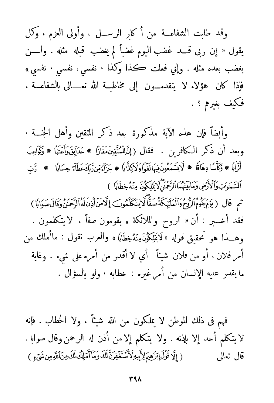 وَقَدْ طُلِبَتْ الشَّفَاعَةُ مِنْ أَكَابِرِ الرُّسُلِ وَأُولِي الْعَزْمِ وَكُلٌّ يَقُولُ " إنَّ رَبِّي قَدْ غَضِبَ الْيَوْمَ غَضَبًا لَمْ يَغْضَبْ قَبْلَهُ مِثْلَهُ. وَلَنْ يَغْضَبَ بَعْدَهُ مِثْلَهُ. وَإِنِّي فَعَلْت كَذَا وَكَذَا نَفْسِي نَفْسِي نَفْسِي " فَإِذَا كَانَ هَؤُلَاءِ لَا يَتَقَدَّمُونَ إلَى مُخَاطَبَةِ اللَّهِ تَعَالَى بِالشَّفَاعَةِ فَكَيْفَ بِغَيْرِهِمْ؟ . وَأَيْضًا فَإِنَّ هَذِهِ الْآيَةَ مَذْكُورَةٌ بَعْدَ ذِكْرِ الْمُتَّقِينَ وَأَهْلِ الْجَنَّةِ وَبَعْدَ أَنْ ذَكَرَ الْكَافِرِينَ. فَقَالَ {إنَّ لِلْمُتَّقِينَ مَفَازًا} {حَدَائِقَ وَأَعْنَابًا} {وَكَوَاعِبَ أَتْرَابًا} {وَكَأْسًا دِهَاقًا} {لَا يَسْمَعُونَ فِيهَا لَغْوًا وَلَا كِذَّابًا} {جَزَاءً مِنْ رَبِّكَ عَطَاءً حِسَابًا} {رَبِّ السَّمَاوَاتِ وَالْأَرْضِ وَمَا بَيْنَهُمَا الرَّحْمَنِ لَا يَمْلِكُونَ مِنْهُ خِطَابًا} ثُمَّ قَالَ {يَوْمَ يَقُومُ الرُّوحُ وَالْمَلَائِكَةُ صَفًّا لَا يَتَكَلَّمُونَ إلَّا مَنْ أَذِنَ لَهُ الرَّحْمَنُ وَقَالَ صَوَابًا} فَقَدْ أَخْبَرَ: أَنَّ " الرُّوحَ وَالْمَلَائِكَةَ " يَقُومُونَ صَفًّا لَا يَتَكَلَّمُونَ. وَهَذَا هُوَ تَحْقِيقُ قَوْلِهِ {لَا يَمْلِكُونَ مِنْهُ خِطَابًا} وَالْعَرَبُ تَقُولُ: مَا أَمْلِكُ مِنْ أَمْرِ فُلَانٍ أَوْ مِنْ فُلَانٍ شَيْئًا أَيْ لَا أَقْدِرُ مِنْ أَمْرِهِ عَلَى شَيْءٍ. وَغَايَةُ مَا يَقْدِرُ عَلَيْهِ الْإِنْسَانُ مِنْ أَمْرِ غَيْرِهِ: خِطَابُهُ وَلَوْ بِالسُّؤَالِ. فَهُمْ فِي ذَلِكَ الْمَوْطِنِ لَا يَمْلِكُونَ مِنْ اللَّهِ شَيْئًا وَلَا الْخِطَابَ. فَإِنَّهُ لَا يَتَكَلَّمُ أَحَدٌ إلَّا بِإِذْنِهِ. وَلَا يَتَكَلَّمُ إلَّا مَنْ أَذِنَ لَهُ الرَّحْمَنُ وَقَالَ صَوَابًا. قَالَ تَعَالَى {إلَّا قَوْلَ إبْرَاهِيمَ لِأَبِيهِ لَأَسْتَغْفِرَنَّ لَكَ وَمَا أَمْلِكُ لَكَ مِنَ