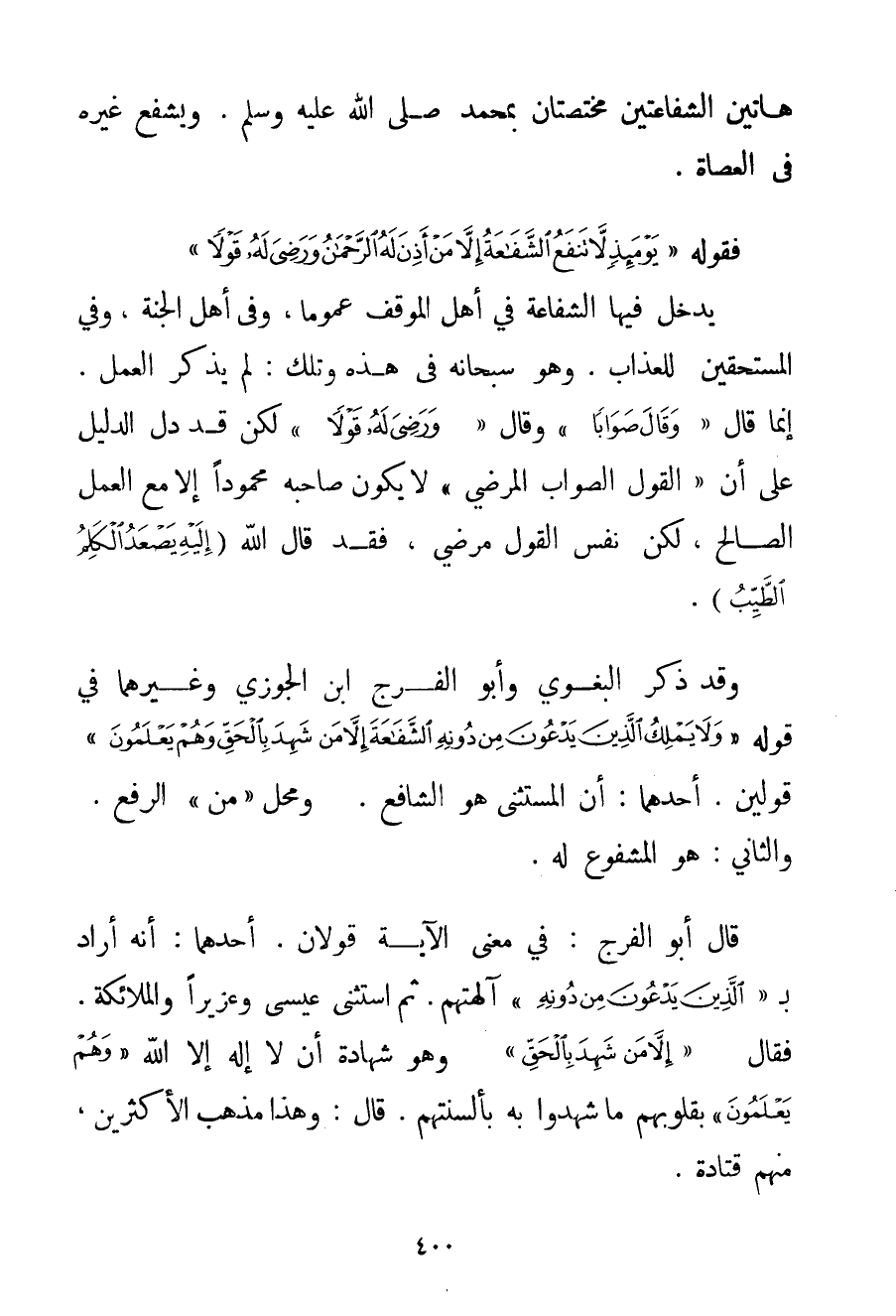 وَقَدْ ذَكَرَ البغوي وَأَبُو الْفَرَجِ ابْنُ الْجَوْزِيِّ وَغَيْرُهُمَا فِي قَوْلِهِ {وَلَا يَمْلِكُ الَّذِينَ يَدْعُونَ مِنْ دُونِهِ الشَّفَاعَةَ إلَّا مَنْ شَهِدَ بِالْحَقِّ وَهُمْ يَعْلَمُونَ} قَوْلَيْنِ. أَحَدَهُمَا: أَنَّ الْمُسْتَثْنَى هُوَ الشَّافِعُ. وَمَحَلُّ " مَنْ " الرَّفْعُ. وَالثَّانِيَ: هُوَ الْمَشْفُوعُ لَهُ. قَالَ أَبُو الْفَرَجِ: فِي مَعْنَى الْآيَةِ قَوْلَانِ. أَحَدُهُمَا: أَنَّهُ أَرَادَ بـ {الَّذِينَ يَدْعُونَ مِنْ دُونِهِ} آلِهَتَهُمْ. ثُمَّ اسْتَثْنَى عِيسَى وَعُزَيْرًا وَالْمَلَائِكَةَ. فَقَالَ {إلَّا مَنْ شَهِدَ بِالْحَقِّ} وَهُوَ شَهَادَةُ أَنْ لَا إلَهَ إلَّا اللَّهُ {وَهُمْ يَعْلَمُونَ} بِقُلُوبِهِمْ مَا شَهِدُوا بِهِ بِأَلْسِنَتِهِمْ. قَالَ: وَهَذَا مَذْهَبُ الْأَكْثَرِينَ مِنْهُمْ قتادة.