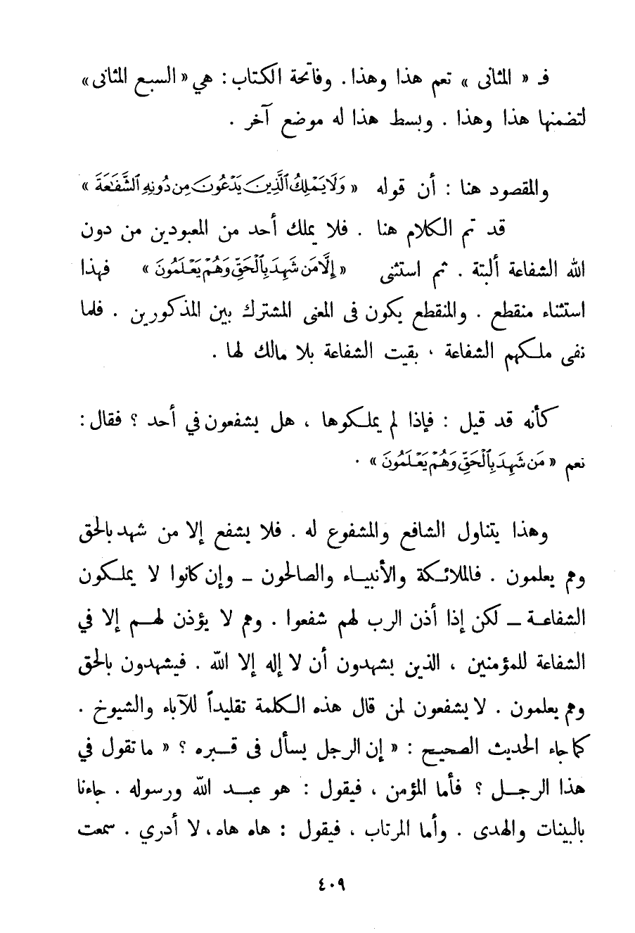 فـ " الْمَثَانِي " تَعُمُّ هَذَا وَهَذَا. وَفَاتِحَةُ الْكِتَابِ: هِيَ " السَّبْعُ الْمَثَانِي " لِتَضَمُّنِهَا هَذَا وَهَذَا. وَبَسْطٌ هَذَا لَهُ مَوْضِعٌ آخَرُ. وَالْمَقْصُودُ هُنَا: أَنَّ قَوْلَهُ {وَلَا يَمْلِكُ الَّذِينَ يَدْعُونَ مِنْ دُونِهِ الشَّفَاعَةَ} قَدْ تَمَّ الْكَلَامُ هُنَا. فَلَا يَمْلِكُ أَحَدٌ مِنْ الْمَعْبُودِينَ مِنْ دُونِ اللَّهِ الشَّفَاعَةَ أَلْبَتَّةَ. ثُمَّ اسْتَثْنَى {إلَّا مَنْ شَهِدَ بِالْحَقِّ وَهُمْ يَعْلَمُونَ} فَهَذَا اسْتِثْنَاءٌ مُنْقَطِعٌ. وَالْمُنْقَطِعُ يَكُونُ فِي الْمَعْنَى الْمُشْتَرِكِ بَيْنَ الْمَذْكُورِينَ. فَلَمَّا نَفَى مُلْكَهُمْ الشَّفَاعَةَ بَقِيَتْ الشَّفَاعَةُ بِلَا مَالِكٍ لَهَا. كَأَنَّهُ قَدْ قِيلَ: فَإِذَا لَمْ يَمْلِكُوهَا هَلْ يَشْفَعُونَ فِي أَحَدٍ؟ فَقَالَ: نَعَمْ {مَنْ شَهِدَ بِالْحَقِّ وَهُمْ يَعْلَمُونَ} . وَهَذَا يَتَنَاوَلُ الشَّافِعَ وَالْمَشْفُوعَ لَهُ. فَلَا يَشْفَعُ إلَّا مَنْ شَهِدَ بِالْحَقِّ وَهُمْ يَعْلَمُونَ. فَالْمَلَائِكَةُ وَالْأَنْبِيَاءُ وَالصَّالِحُونَ - وَإِنْ كَانُوا لَا يَمْلِكُونَ الشَّفَاعَةَ - لَكِنْ إذَا أَذِنَ الرَّبُّ لَهُمْ شَفَعُوا. وَهُمْ لَا يُؤْذَنُ لَهُمْ إلَّا فِي الشَّفَاعَةِ لِلْمُؤْمِنِينَ الَّذِينَ يَشْهَدُونَ أَنْ لَا إلَهَ إلَّا اللَّهُ. فَيَشْهَدُونَ بِالْحَقِّ وَهُمْ يَعْلَمُونَ. لَا يَشْفَعُونَ لِمَنْ قَالَ هَذِهِ الْكَلِمَةَ تَقْلِيدًا لِلْآبَاءِ وَالشُّيُوخِ. كَمَا جَاءَ الْحَدِيثُ الصَّحِيحُ: {إنَّ الرَّجُلَ يُسْأَلُ فِي قَبْرِهِ؟ مَا تَقُولُ فِي هَذَا الرَّجُلِ؟ فَأَمَّا الْمُؤْمِنُ فَيَقُولُ: هُوَ عَبْدُ اللَّهِ وَرَسُولُهُ. جَاءَنَا بِالْبَيِّنَاتِ وَالْهُدَى. وَأَمَّا الْمُرْتَابُ فَيَقُولُ: هاه هاه لَا أَدْرِي. سَمِعْت