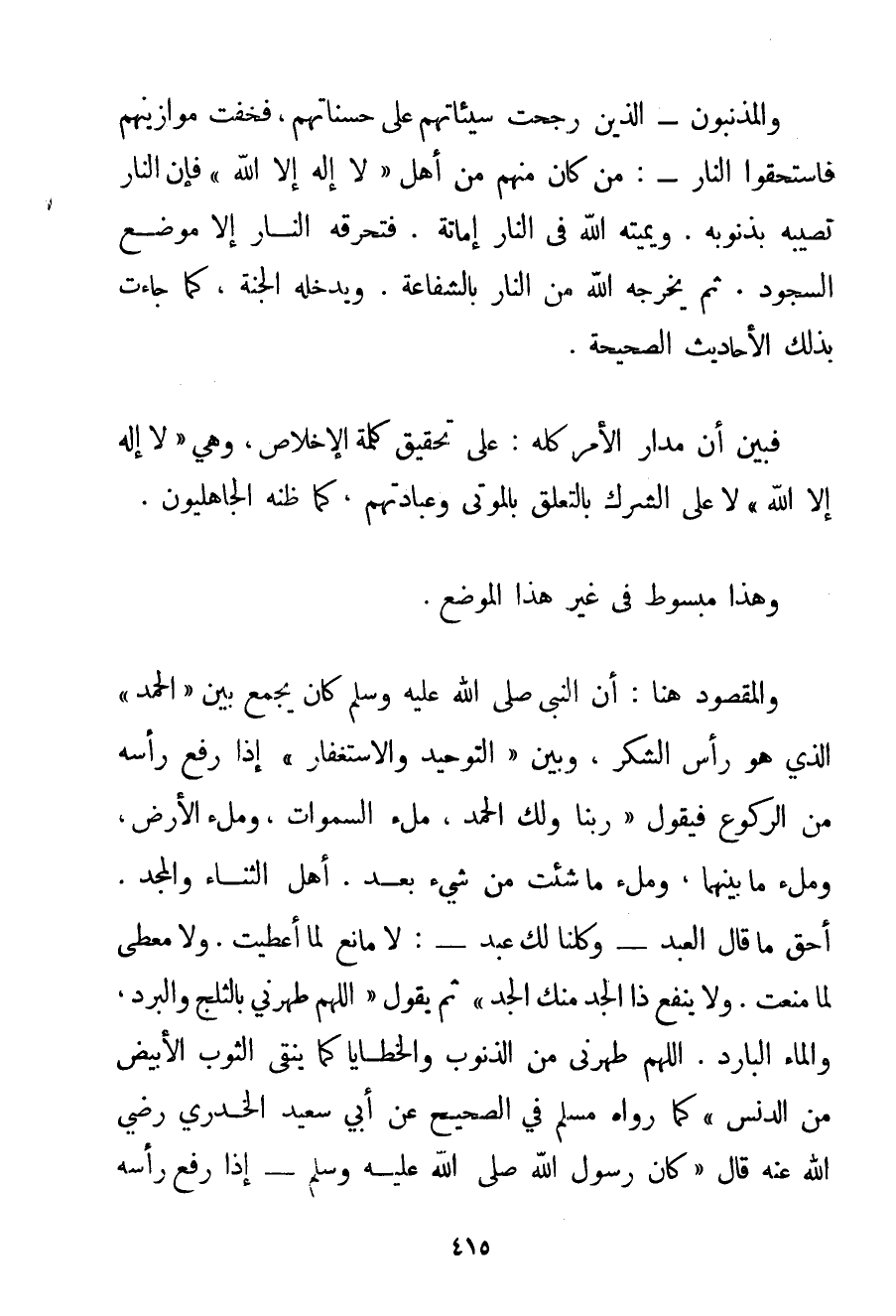 وَالْمُذْنِبُونَ - الَّذِينَ رَجَحَتْ سَيِّئَاتُهُمْ عَلَى حَسَنَاتِهِمْ فَخَفَّتْ مَوَازِينُهُمْ فَاسْتَحَقُّوا النَّارَ -: مَنْ كَانَ مِنْهُمْ مِنْ أَهْلِ " لَا إلَهَ إلَّا اللَّهُ " فَإِنَّ النَّارَ تُصِيبُهُ بِذُنُوبِهِ. وَيُمِيتُهُ اللَّهُ فِي النَّارِ إمَاتَةً. فَتُحَرِّقُهُ النَّارُ إلَّا مَوْضِعَ السُّجُودِ. ثُمَّ يُخْرِجُهُ اللَّهُ مِنْ النَّارِ بِالشَّفَاعَةِ. وَيُدْخِلُهُ الْجَنَّةَ كَمَا جَاءَتْ بِذَلِكَ الْأَحَادِيثُ الصَّحِيحَةُ. فَبَيَّنَ أَنَّ مَدَارَ الْأَمْرِ كُلِّهِ: عَلَى تَحْقِيقِ كَلِمَةِ الْإِخْلَاصِ وَهِيَ " لَا إلَهَ إلَّا اللَّهُ " لَا عَلَى الشِّرْكِ بِالتَّعَلُّقِ بِالْمَوْتَى وَعِبَادَتِهِمْ كَمَا ظَنَّهُ الْجَاهِلِيُّونَ. وَهَذَا مَبْسُوطٌ فِي غَيْرِ هَذَا الْمَوْضِعِ. وَالْمَقْصُودُ هُنَا: {أَنَّ النَّبِيَّ صَلَّى اللَّهُ عَلَيْهِ وَسَلَّمَ كَانَ يَجْمَعُ بَيْنَ الْحَمْدِ الَّذِي هُوَ رَأْسُ الشُّكْرِ وَبَيْنَ التَّوْحِيدِ وَالِاسْتِغْفَارِ إذَا رَفَعَ رَأْسَهُ مِنْ الرُّكُوعِ فَيَقُولُ رَبَّنَا وَلَك الْحَمْدُ مِلْءَ السَّمَوَاتِ وَمِلْءَ الْأَرْضِ وَمِلْءَ مَا بَيْنَهُمَا وَمِلْءَ مَا شِئْت مِنْ شَيْءٍ بَعْدُ. أَهْلَ الثَّنَاءِ وَالْمَجْدِ أَحَقُّ مَا قَالَ الْعَبْدُ - وَكُلُّنَا لَك عَبْدٌ -: لَا مَانِعَ لِمَا أَعْطَيْت. وَلَا مُعْطِيَ لِمَا مَنَعْت. وَلَا يَنْفَعُ ذَا الْجَدِّ مِنْك الْجَدُّ ثُمَّ يَقُولُ اللَّهُمَّ طَهِّرْنِي بِالثَّلْجِ وَالْبَرَدِ وَالْمَاءِ الْبَارِدِ. اللَّهُمَّ طَهِّرْنِي مِنْ الذُّنُوبِ وَالْخَطَايَا كَمَا يُنَقَّى الثَّوْبُ الْأَبْيَضُ مِنْ الدَّنَسِ} كَمَا رَوَاهُ مُسْلِمٌ فِي الصَّحِيحِ عَنْ أَبِي سَعِيدٍ الخدري رَضِيَ اللَّهُ عَنْهُ قَالَ {كَانَ رَسُولُ اللَّهِ صَلَّى اللَّهُ عَلَيْهِ وَسَلَّمَ - إذَا رَفَعَ رَأْسَهُ