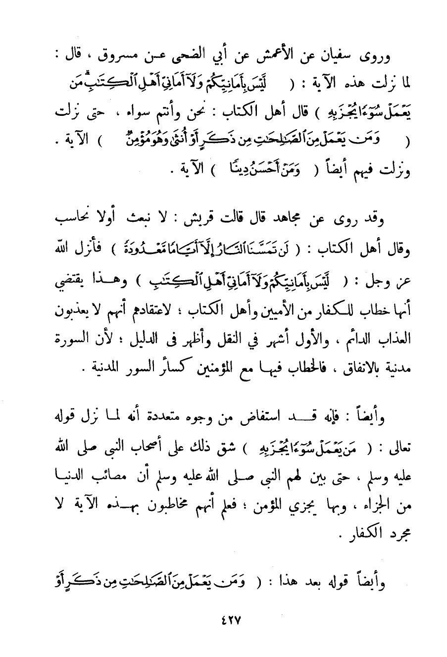 وَرَوَى سُفْيَانُ عَنْ الْأَعْمَشِ عَنْ أَبِي الضُّحَى عَنْ مَسْرُوقٍ قَالَ: لَمَّا نَزَلَتْ هَذِهِ الْآيَةُ: {لَيْسَ بِأَمَانِيِّكُمْ وَلَا أَمَانِيِّ أَهْلِ الْكِتَابِ مَنْ يَعْمَلْ سُوءًا يُجْزَ بِهِ} قَالَ أَهْلُ الْكِتَابِ: نَحْنُ وَأَنْتُمْ سَوَاءٌ حَتَّى نَزَلَتْ {وَمَنْ يَعْمَلْ مِنَ الصَّالِحَاتِ مِنْ ذَكَرٍ أَوْ أُنْثَى وَهُوَ مُؤْمِنٌ} الْآيَةَ. وَنَزَلَتْ فِيهِمْ أَيْضًا {وَمَنْ أَحْسَنُ دِينًا} الْآيَةَ. وَقَدْ رُوِيَ عَنْ مُجَاهِدٌ قَالَ قَالَتْ قُرَيْشٌ: لَا نُبْعَثُ أَوْ لَا نُحَاسَبُ وَقَالَ أَهْلُ الْكِتَابِ: {لَنْ تَمَسَّنَا النَّارُ إلَّا أَيَّامًا مَعْدُودَةً} فَأَنْزَلَ اللَّهُ عَزَّ وَجَلَّ: {لَيْسَ بِأَمَانِيِّكُمْ وَلَا أَمَانِيِّ أَهْلِ الْكِتَابِ} وَهَذَا يَقْتَضِي أَنَّهَا خِطَابٌ لِلْكُفَّارِ مِنْ الْأُمِّيِّينَ وَأَهْلِ الْكِتَابِ؛ لِاعْتِقَادِهِمْ أَنَّهُمْ لَا يُعَذَّبُونَ الْعَذَابَ الدَّائِمَ وَالْأَوَّلُ أَشْهَرُ فِي النَّقْلِ وَأَظْهَرُ فِي الدَّلِيلِ؛ لِأَنَّ السُّورَةَ مَدَنِيَّةٌ بِالِاتِّفَاقِ فَالْخِطَابُ فِيهَا مَعَ الْمُؤْمِنِينَ كَسَائِرِ السُّوَرِ الْمَدَنِيَّةِ. وَأَيْضًا: فَإِنَّهُ قَدْ اسْتَفَاضَ مِنْ وُجُوهٍ مُتَعَدِّدَةٍ أَنَّهُ لَمَّا نَزَلَ قَوْله تَعَالَى {مَنْ يَعْمَلْ سُوءًا يُجْزَ بِهِ} شَقَّ ذَلِكَ عَلَى أَصْحَابِ النَّبِيِّ صَلَّى اللَّهُ عَلَيْهِ وَسَلَّمَ حَتَّى بَيَّنَ لَهُمْ النَّبِيُّ صَلَّى اللَّهُ عَلَيْهِ وَسَلَّمَ أَنَّ مَصَائِبَ الدُّنْيَا مِنْ الْجَزَاءِ وَبِهَا يُجْزَى الْمُؤْمِنُ؛ فَعُلِمَ أَنَّهُمْ مُخَاطَبُونَ بِهَذِهِ الْآيَةِ لَا مُجَرَّدَ الْكُفَّارِ. وَأَيْضًا قَوْلُهُ بَعْدَ هَذَا: {وَمَنْ يَعْمَلْ مِنَ الصَّالِحَاتِ مِنْ ذَكَرٍ أَوْ