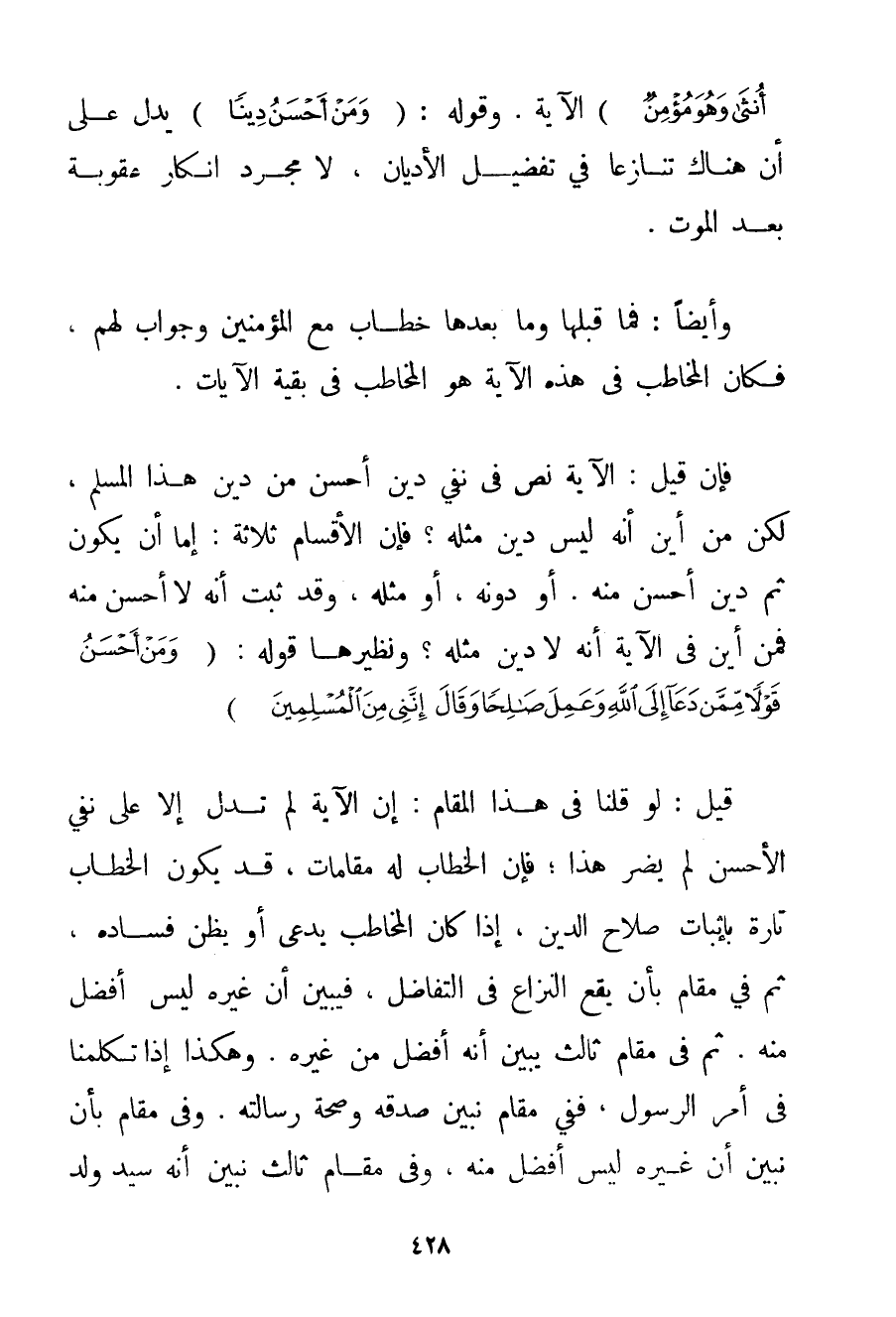 أُنْثَى وَهُوَ مُؤْمِنٌ} الْآيَةَ. وَقَوْلُهُ: {وَمَنْ أَحْسَنُ دِينًا} يَدُلُّ عَلَى أَنَّ هُنَاكَ تَنَازُعًا فِي تَفْضِيلِ الْأَدْيَانِ لَا مُجَرَّدَ إنْكَارِ عُقُوبَةٍ بَعْدَ الْمَوْتِ. وَأَيْضًا: فَمَا قَبْلَهَا وَمَا بَعْدَهَا خِطَابٌ مَعَ الْمُؤْمِنِينَ وَجَوَابٌ لَهُمْ فَكَانَ الْمُخَاطَبُ فِي هَذِهِ الْآيَةِ هُوَ الْمُخَاطَبُ فِي بَقِيَّةِ الْآيَاتِ. فَإِنْ قِيلَ: الْآيَةُ نَصٌّ فِي نَفْيِ دِينٍ أَحْسَنَ مِنْ دِينِ هَذَا الْمُسْلِمِ لَكِنْ مِنْ أَيْنَ أَنَّهُ لَيْسَ دِينٌ مِثْلُهُ؟ فَإِنَّ الْأَقْسَامَ ثَلَاثَةٌ: إمَّا أَنْ يَكُونَ ثَمَّ دِينٌ أَحْسَنَ مِنْهُ. أَوْ دُونَهُ أَوْ مِثْلَهُ وَقَدْ ثَبَتَ أَنَّهُ لَا أَحْسَنَ مِنْهُ فَمِنْ أَيْنَ فِي الْآيَةِ أَنَّهُ لَا دِينَ مِثْلَهُ؟ وَنَظِيرُهَا قَوْلُهُ: {وَمَنْ أَحْسَنُ قَوْلًا مِمَّنْ دَعَا إلَى اللَّهِ وَعَمِلَ صَالِحًا وَقَالَ إنَّنِي مِنَ الْمُسْلِمِينَ} قِيلَ: لَوْ قُلْنَا فِي هَذَا الْمَقَامِ: إنَّ الْآيَةَ لَمْ تَدُلَّ إلَّا عَلَى نَفْيِ الْأَحْسَنِ لَمْ يَضُرَّ هَذَا؛ فَإِنَّ الْخِطَابَ لَهُ مَقَامَاتٌ قَدْ يَكُونُ الْخِطَابُ تَارَةً بِإِثْبَاتِ صَلَاحِ الدِّينِ إذَا كَانَ الْمُخَاطَبُ يَدَّعِي أَوْ يَظُنُّ فَسَادَهُ ثُمَّ فِي مَقَامٍ بِأَنْ يَقَعَ النِّزَاعُ فِي التَّفَاضُلِ فَيُبَيِّنُ أَنَّ غَيْرَهُ لَيْسَ أَفْضَلَ مِنْهُ. ثُمَّ فِي مَقَامٍ ثَالِثٍ يُبَيِّنُ أَنَّهُ أَفْضَلُ مِنْ غَيْرِهِ. وَهَكَذَا إذَا تَكَلَّمْنَا فِي أَمْرِ الرَّسُولِ فَفِي مَقَامٍ نُبَيِّنُ صِدْقَهُ وَصِحَّةَ رِسَالَتِهِ. وَفِي مَقَامٍ بِأَنْ نُبَيِّنَ أَنَّ غَيْرَهُ لَيْسَ أَفْضَلَ مِنْهُ وَفِي مَقَامٍ ثَالِثٍ نُبَيِّنُ أَنَّهُ سَيِّدُ وَلَدِ