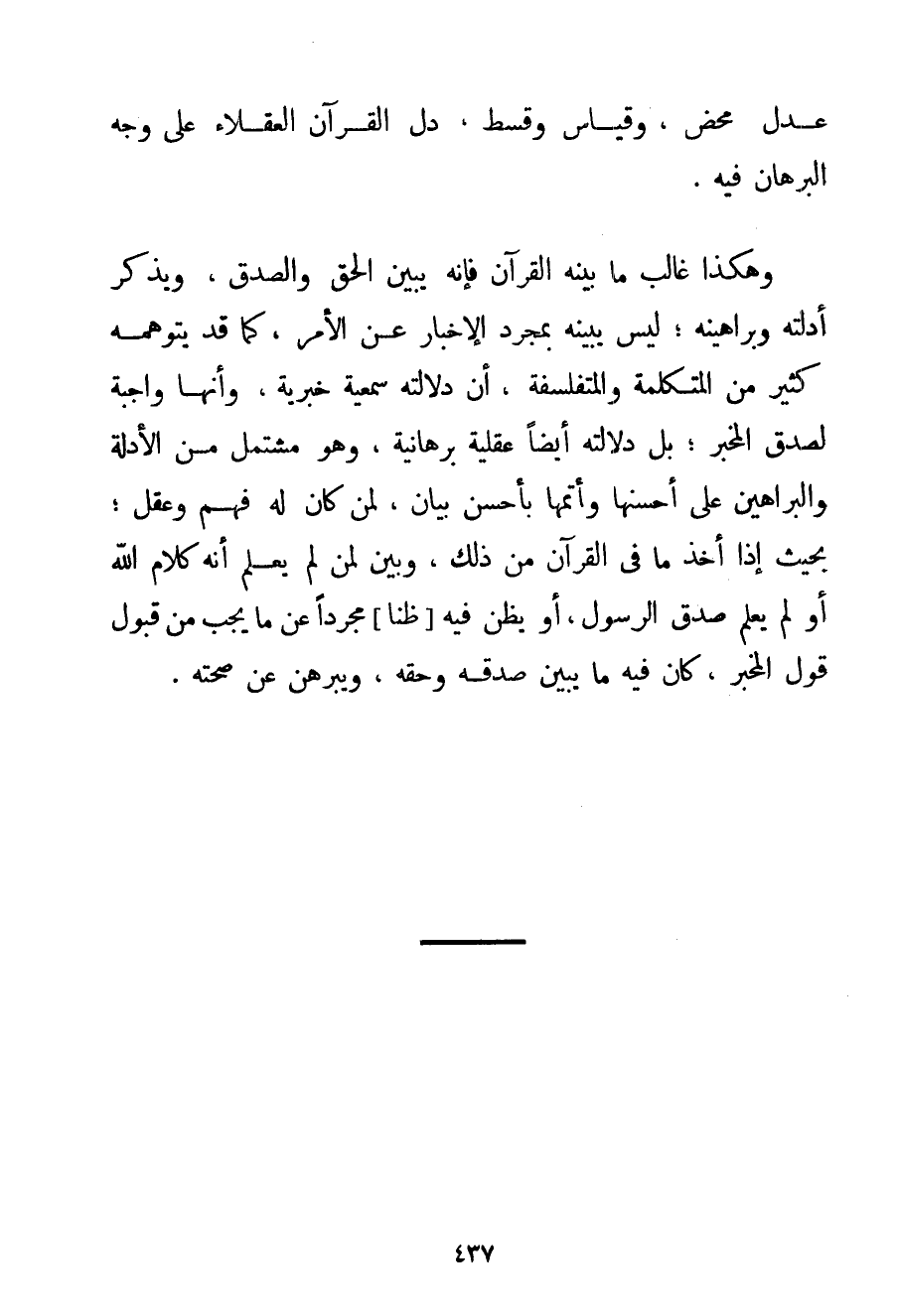 عَدْلٌ مَحْضٌ وَقِيَاسٌ وَقِسْطٌ دَلَّ الْقُرْآنُ الْعُقَلَاءَ عَلَى وَجْهِ الْبُرْهَانِ فِيهِ. وَهَكَذَا غَالِبُ مَا بَيَّنَهُ الْقُرْآنُ فَإِنَّهُ يُبَيِّنُ الْحَقَّ وَالصِّدْقَ وَيَذْكُرُ أَدِلَّتَهُ وَبَرَاهِينَهُ؛ لَيْسَ يُبَيِّنُهُ بِمُجَرَّدِ الْإِخْبَارِ عَنْ الْأَمْرِ كَمَا قَدْ يَتَوَهَّمُهُ كَثِيرٌ مِنْ الْمُتَكَلِّمَةِ والمتفلسفة أَنَّ دَلَالَتَهُ سَمْعِيَّةٌ خَبَرِيَّةٌ وَأَنَّهَا وَاجِبَةٌ لِصِدْقِ الْمُخْبِرِ؛ بَلْ دَلَالَتُهُ أَيْضًا عَقْلِيَّةٌ بُرْهَانِيَّةٌ وَهُوَ مُشْتَمِلٌ مِنْ الْأَدِلَّةِ وَالْبَرَاهِينِ عَلَى أَحْسَنِهَا وَأَتَمِّهَا بِأَحْسَنِ بَيَانٍ لِمَنْ كَانَ لَهُ فَهْمٌ وَعَقْلٌ؛ بِحَيْثُ إذَا أَخَذَ مَا فِي الْقُرْآنِ مِنْ ذَلِكَ وَبَيَّنَ لِمَنْ لَمْ يَعْلَمْ أَنَّهُ كَلَامُ اللَّهِ أَوْ لَمْ يَعْلَمْ صِدْقَ الرَّسُولِ أَوْ يَظُنَّ فِيهِ ظَنًّا مُجَرَّدًا عَنْ مَا يَجِبُ مِنْ قَبُولِ قَوْلِ الْمُخْبِرِ كَانَ فِيهِ مَا يُبَيِّنُ صِدْقَهُ وَحَقَّهُ وَيُبَرْهِنُ عَنْ صِحَّتِهِ.