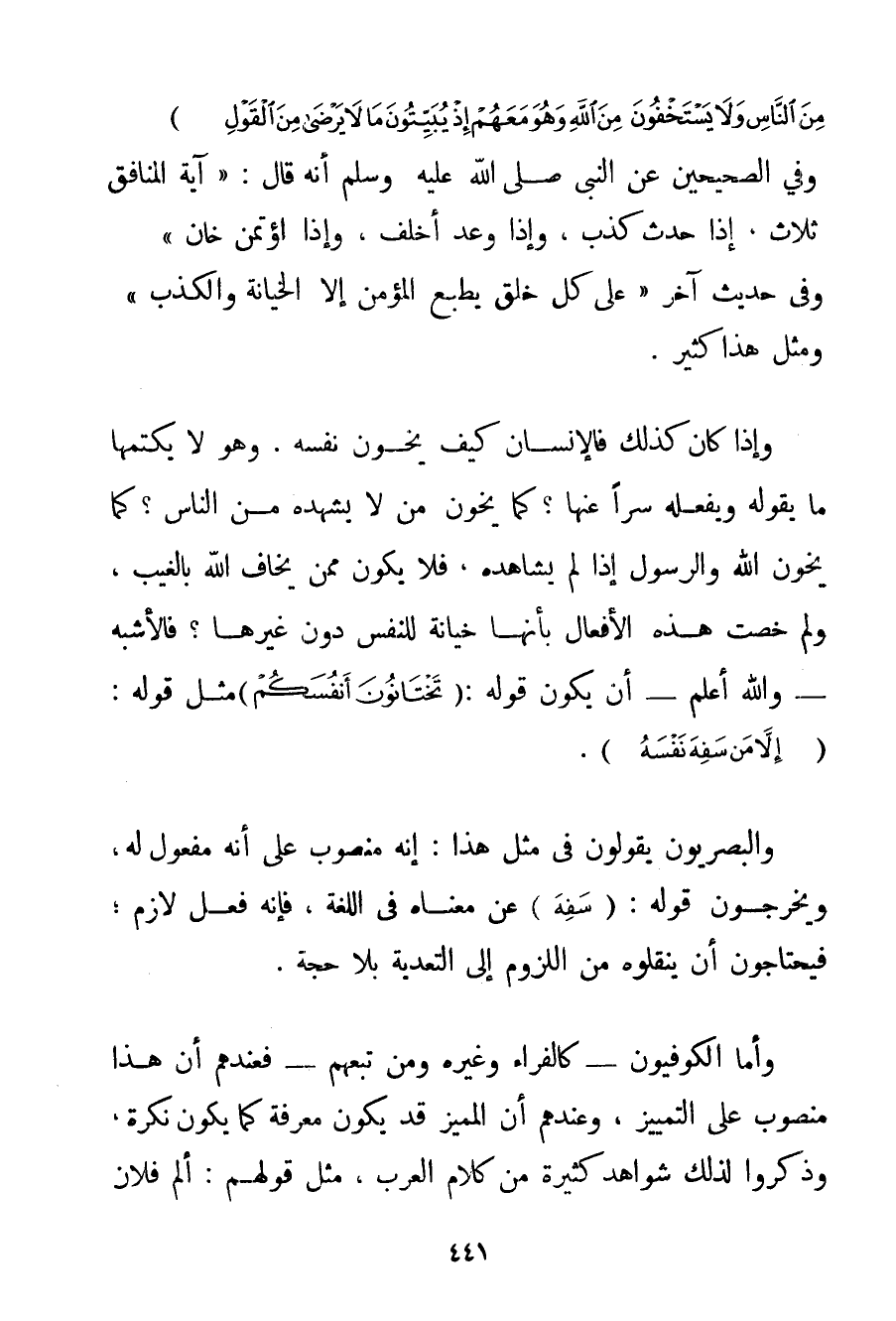{يَسْتَخْفُونَ مِنَ النَّاسِ وَلَا يَسْتَخْفُونَ مِنَ اللَّهِ وَهُوَ مَعَهُمْ إذْ يُبَيِّتُونَ مَا لَا يَرْضَى مِنَ الْقَوْلِ} وَفِي الصَّحِيحَيْنِ عَنْ النَّبِيِّ صَلَّى اللَّهُ عَلَيْهِ وَسَلَّمَ أَنَّهُ قَالَ: {آيَةُ الْمُنَافِقِ ثَلَاثٌ إذَا حَدَّثَ كَذَبَ وَإِذَا وَعَدَ أَخْلَفَ وَإِذَا اُؤْتُمِنَ خَانَ} وَفِي حَدِيثٍ آخَرَ {عَلَى كُلِّ خُلُقٍ يُطْبَعُ الْمُؤْمِنُ إلَّا الْخِيَانَةَ وَالْكَذِبَ} وَمَثَلُ هَذَا كَثِيرٌ. وَإِذَا كَانَ كَذَلِكَ فَالْإِنْسَانُ كَيْفَ يَخُونُ نَفْسَهُ. وَهُوَ لَا يَكْتُمُهَا مَا يَقُولُهُ وَيَفْعَلُهُ سِرًّا عَنْهَا؟ كَمَا يَخُونُ مَنْ لَا يَشْهَدُهُ مِنْ النَّاسِ؟ كَمَا يَخُونُ اللَّهَ وَالرَّسُولَ إذَا لَمْ يُشَاهِدْهُ فَلَا يَكُونُ مِمَّنْ يَخَافُ اللَّهَ بِالْغَيْبِ وَلِمَ خُصَّتْ هَذِهِ الْأَفْعَالُ بِأَنَّهَا خِيَانَةٌ لِلنَّفْسِ دُونَ غَيْرِهَا؟ فَالْأَشْبَهُ - وَاَللَّهُ أَعْلَمُ - أَنْ يَكُونَ قَوْلُهُ: {تَخْتَانُونَ أَنْفُسَكُمْ} مِثْلَ قَوْلِهِ: {إلَّا مَنْ سَفِهَ نَفْسَهُ} . وَالْبَصْرِيُّونَ يَقُولُونَ فِي مِثْلِ هَذَا: إنَّهُ مَنْصُوبٌ عَلَى أَنَّهُ مَفْعُولٌ لَهُ وَيُخْرِجُونِ قَوْلَهُ: {سَفِهَ} عَنْ مَعْنَاهُ فِي اللُّغَةِ فَإِنَّهُ فِعْلٌ لَازِمٌ؛ فَيَحْتَاجُونَ أَنْ يَنْقُلُوهُ مِنْ اللُّزُومِ إلَى التَّعْدِيَةِ بِلَا حُجَّةٍ. وَأَمَّا الْكُوفِيُّونَ - كَالْفَرَّاءِ وَغَيْرِهِ وَمَنْ تَبِعَهُمْ - فَعِنْدَهُمْ أَنَّ هَذَا مَنْصُوبٌ عَلَى التَّمْيِيزِ وَعِنْدَهُمْ أَنَّ الْمُمَيَّزَ قَدْ يَكُونُ مَعْرِفَةً كَمَا يَكُونُ نَكِرَةً وَذَكَرُوا لِذَلِكَ شَوَاهِدَ كَثِيرَةً مِنْ كَلَامِ الْعَرَبِ مِثْلَ قَوْلِهِمْ: أَلِمَ فُلَانٌ