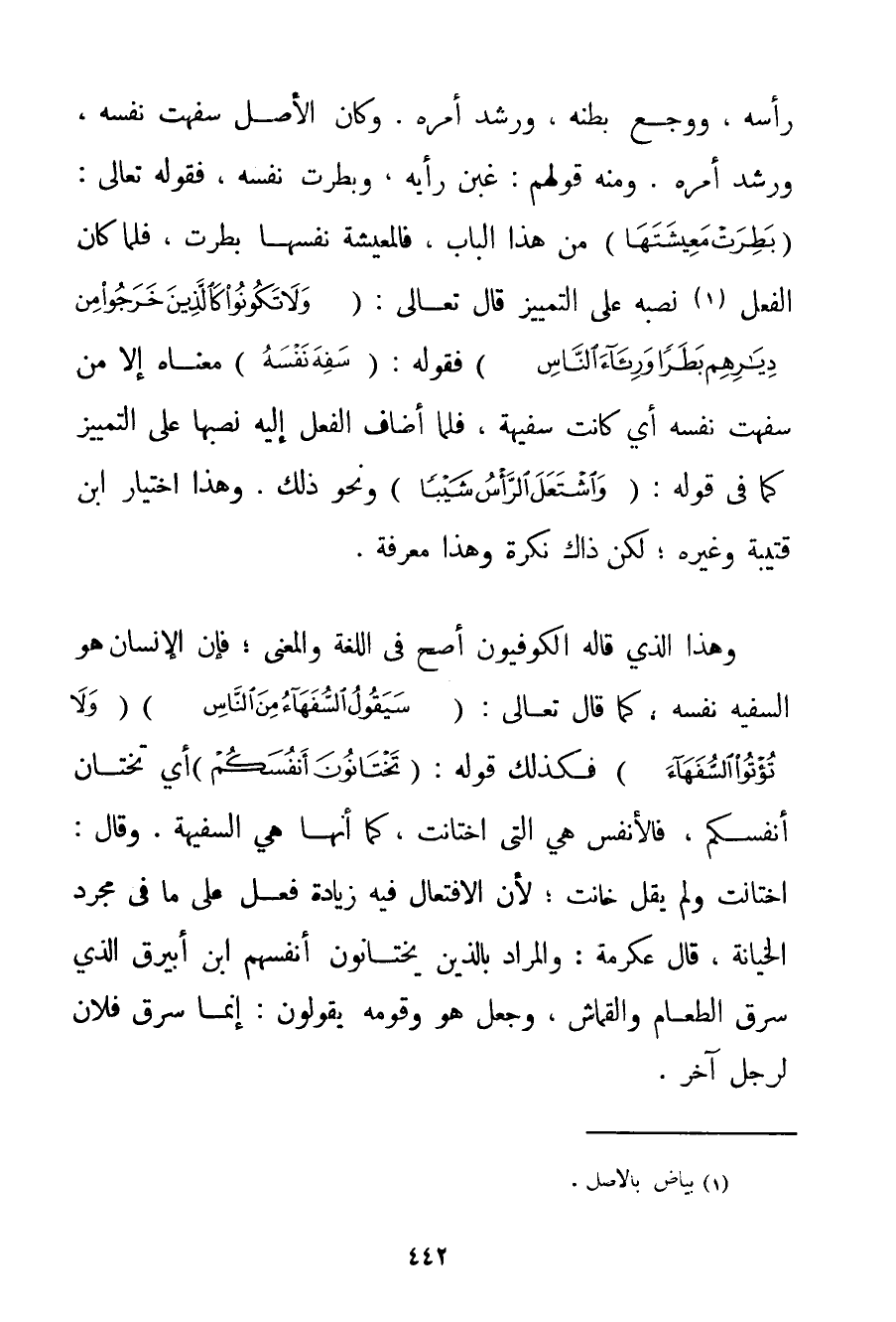 رَأْسَهُ وَوَجِعَ بَطْنَهُ وَرَشَدَ أَمْرَهُ. وَكَانَ الْأَصْلُ سَفِهَتْ نَفْسُهُ وَرَشَدَ أَمْرُهُ. وَمِنْهُ قَوْلُهُمْ: غَبِنَ رَأْيُهُ وَبَطِرَتْ نَفْسُهُ فَقَوْلُهُ تَعَالَى: {بَطِرَتْ مَعِيشَتَهَا} مِنْ هَذَا الْبَابِ فَالْمَعِيشَةُ نَفْسُهَا بَطِرَتْ فَلَمَّا كَانَ الْفِعْلُ. . . (1) نَصَبَهُ عَلَى التَّمْيِيزِ قَالَ تَعَالَى: {وَلَا تَكُونُوا كَالَّذِينَ خَرَجُوا مِنْ دِيَارِهِمْ بَطَرًا وَرِئَاءَ النَّاسِ} فَقَوْلُهُ: {سَفِهَ نَفْسَهُ} مَعْنَاهُ إلَّا مَنْ سَفِهَتْ نَفْسُهُ أَيْ كَانَتْ سَفِيهَةً فَلَمَّا أَضَافَ الْفِعْلَ إلَيْهِ نَصَبَهَا عَلَى التَّمْيِيزِ كَمَا فِي قَوْلِهِ: {وَاشْتَعَلَ الرَّأْسُ شَيْبًا} وَنَحْوِ ذَلِكَ. وَهَذَا اخْتِيَارُ ابْنِ قُتَيْبَةَ وَغَيْرِهِ؛ لَكِنَّ ذَاكَ نَكِرَةٌ وَهَذَا مَعْرِفَةٌ. وَهَذَا الَّذِي قَالَهُ الْكُوفِيُّونَ أَصَحُّ فِي اللُّغَةِ وَالْمَعْنَى؛ فَإِنَّ الْإِنْسَانَ هُوَ السَّفِيهُ نَفْسُهُ: كَمَا قَالَ تَعَالَى: {سَيَقُولُ السُّفَهَاءُ مِنَ النَّاسِ} {وَلَا تُؤْتُوا السُّفَهَاءَ} فَكَذَلِكَ قَوْلُهُ: {تَخْتَانُونَ أَنْفُسَكُمْ} أَيْ تَخْتَانُ أَنْفُسُكُمْ فَالْأَنْفُسُ هِيَ الَّتِي اخْتَانَتْ كَمَا أَنَّهَا هِيَ السَّفِيهَةُ. وَقَالَ: اخْتَانَتْ وَلَمْ يَقُلْ خَانَتْ؛ لِأَنَّ الِافْتِعَالَ فِيهِ زِيَادَةُ فِعْلٍ عَلَى مَا فِي مُجَرَّدِ الْخِيَانَةِ قَالَ عِكْرِمَةُ: وَالْمُرَادُ بِاَلَّذِينَ يَخْتَانُونَ أَنْفُسَهُمْ ابْنُ أبيرق الَّذِي سَرَقَ الطَّعَامَ وَالْقُمَاشَ وَجَعَلَ هُوَ وَقَوْمُهُ يَقُولُونَ: إنَّمَا سَرَقَ فُلَانٌ لِرَجُلِ آخَرَ.