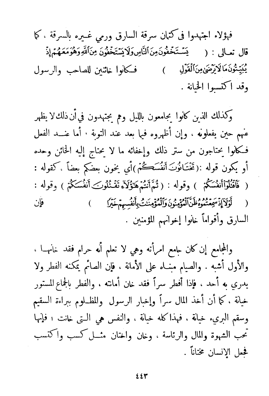 فَهَؤُلَاءِ اجْتَهَدُوا فِي كِتْمَانِ سَرِقَةِ السَّارِقِ وَرَمْيِ غَيْرِهِ بِالسَّرِقَةِ كَمَا قَالَ تَعَالَى: {يَسْتَخْفُونَ مِنَ النَّاسِ وَلَا يَسْتَخْفُونَ مِنَ اللَّهِ وَهُوَ مَعَهُمْ إذْ يُبَيِّتُونَ مَا لَا يَرْضَى مِنَ الْقَوْلِ} فَكَانُوا خَائِنِينَ لِلصَّاحِبِ وَالرَّسُولِ وَقَدْ اكْتَسَبُوا الْخِيَانَةَ. وَكَذَلِكَ الَّذِينَ كَانُوا يُجَامِعُونَ بِاللَّيْلِ وَهُمْ يَجْتَهِدُونَ فِي أَنَّ ذَلِكَ لَا يَظْهَرُ عَنْهُمْ حِينَ يَفْعَلُونَهُ وَإِنْ أَظْهَرُوهُ فِيمَا بَعْدُ عِنْدِ التَّوْبَةِ أَمَّا عِنْدَ الْفِعْلِ فَكَانُوا يَحْتَاجُونَ مِنْ سَتْرِ ذَلِكَ وَإِخْفَائِهِ مَا لَا يَحْتَاجُ إلَيْهِ الْخَائِنُ وَحْدَهُ أَوْ يَكُونُ قَوْلُهُ: {تَخْتَانُونَ أَنْفُسَكُمْ} أَيْ يَخُونُ بَعْضُكُمْ بَعْضًا كَقَوْلِهِ: {فَاقْتُلُوا أَنْفُسَكُمْ} وَقَوْلُهُ: {ثُمَّ أَنْتُمْ هَؤُلَاءِ تَقْتُلُونَ أَنْفُسَكُمْ} وَقَوْلُهُ: {لَوْلَا إذْ سَمِعْتُمُوهُ ظَنَّ الْمُؤْمِنُونَ وَالْمُؤْمِنَاتُ بِأَنْفُسِهِمْ خَيْرًا} فَإِنَّ السَّارِقَ وَأَقْوَامًا خَانُوا إخْوَانَهُمْ الْمُؤْمِنِينَ. وَالْمَجَامِعُ إنْ كَانَ جَامَعَ امْرَأَتَهُ وَهِيَ لَا تَعْلَمُ أَنَّهُ حَرَامٌ فَقَدْ خَانَهَا وَالْأَوَّلُ أَشْبَهُ. وَالصِّيَامُ مَبْنَاهُ عَلَى الْأَمَانَةِ فَإِنَّ الصَّائِمَ يُمْكِنُهُ الْفِطْرُ وَلَا يَدْرِي بِهِ أَحَدٌ فَإِذَا أَفْطَرَ سِرًّا فَقَدْ خَانَ أَمَانَتَهُ وَالْفِطْرُ بِالْجِمَاعِ الْمَسْتُورِ خِيَانَةٌ كَمَا أَنَّ أَخْذَ الْمَالِ سِرًّا وَإِخْبَارَ الرَّسُولِ وَالْمَظْلُومِ بِبَرَاءَةِ السَّقِيمِ وَسَقِمَ الْبَرِيءِ خِيَانَةٌ فَهَذَا كُلُّهُ خِيَانَةٌ وَالنَّفْسُ هِيَ الَّتِي خَانَتْ؛ فَإِنَّهَا تُحِبُّ الشَّهْوَةَ وَالْمَالَ وَالرِّئَاسَةَ وَخَانَ وَاخْتَانَ مِثْلُ كَسَبَ وَاكْتَسَبَ فَجَعَلَ الْإِنْسَانَ مُخْتَانًا.