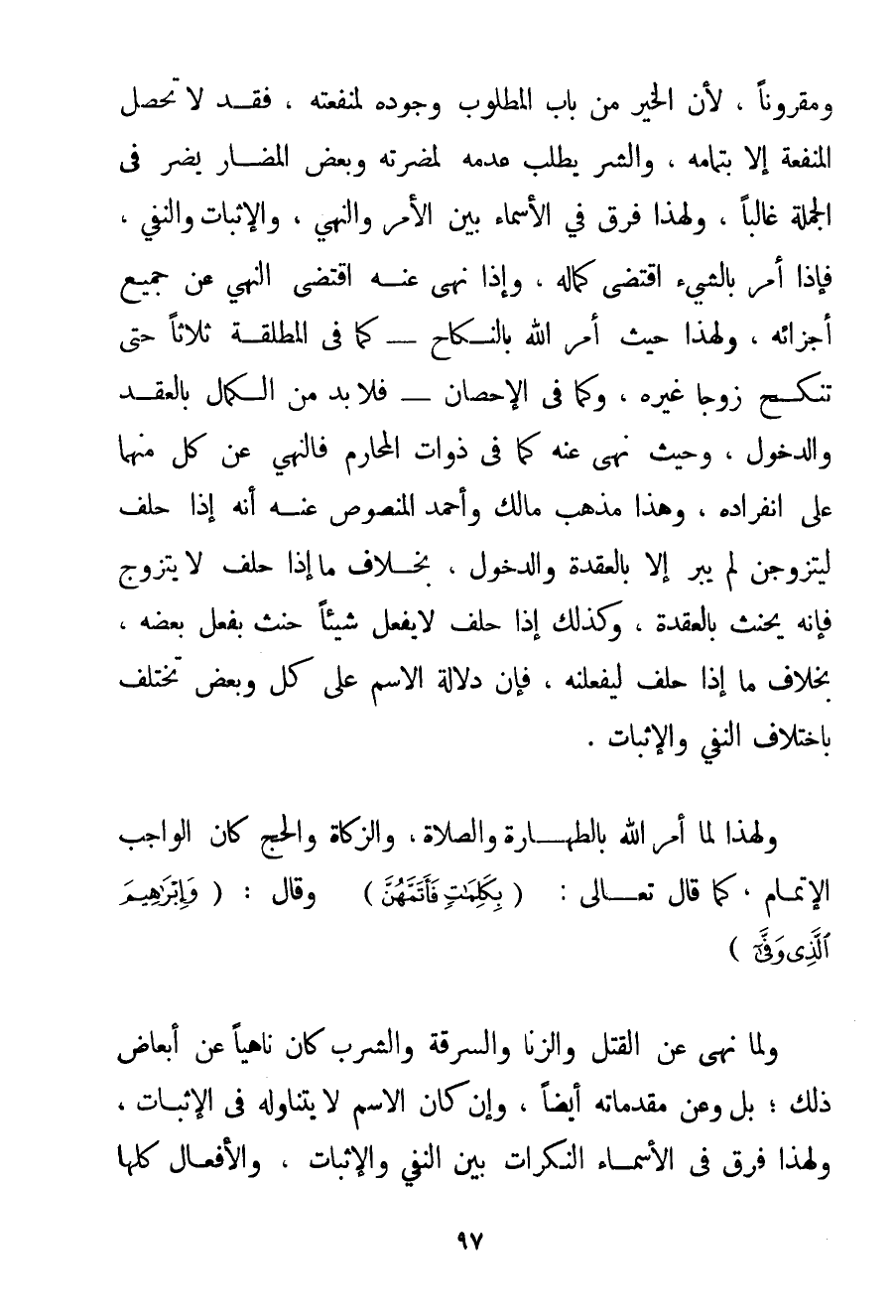 وَمَقْرُونًا لِأَنَّ الْخَيْرَ مِنْ بَابِ الْمَطْلُوبِ وُجُودُهُ لِمَنْفَعَتِهِ فَقَدْ لَا تَحْصُلُ الْمَنْفَعَةُ إلَّا بِتَمَامِهِ وَالشَّرَّ يُطْلَبُ عَدَمُهُ لِمَضَرَّتِهِ وَبَعْضُ الْمَضَارِّ يَضُرُّ فِي الْجُمْلَةِ غَالِبًا وَلِهَذَا فُرِّقَ فِي الْأَسْمَاءِ بَيْنَ الْأَمْرِ وَالنَّهْيِ وَالْإِثْبَاتِ وَالنَّفْيِ فَإِذَا أَمَرَ بِالشَّيْءِ اقْتَضَى كَمَالِهِ وَإِذَا نَهَى عَنْهُ اقْتَضَى النَّهْيَ عَنْ جَمِيعِ أَجْزَائِهِ وَلِهَذَا حَيْثُ أَمَرَ اللَّهُ بِالنِّكَاحِ - كَمَا فِي الْمُطَلَّقَةِ ثَلَاثًا حَتَّى تَنْكِحَ زَوْجًا غَيْرَهُ وَكَمَا فِي الْإِحْصَانِ - فَلَا بُدَّ مِنْ الْكَمَالِ بِالْعَقْدِ وَالدُّخُولِ وَحَيْثُ نَهَى عَنْهُ كَمَا فِي ذَوَاتِ الْمَحَارِمِ فَالنَّهْيُ عَنْ كُلٍّ مِنْهُمَا عَلَى انْفِرَادِهِ وَهَذَا مَذْهَبُ مَالِكٍ وَأَحْمَد الْمَنْصُوصُ عَنْهُ أَنَّهُ إذَا حَلَفَ لَيَتَزَوَّجَن لَمْ يَبَرَّ إلَّا بِالْعُقْدَةِ وَالدُّخُولِ بِخِلَافِ مَا إذَا حَلَفَ لَا يَتَزَوَّجُ فَإِنَّهُ يَحْنَثُ بِالْعُقْدَةِ وَكَذَلِكَ إذَا حَلَفَ لَا يَفْعَلُ شَيْئًا حَنِثَ بِفِعْلِ بَعْضِهِ بِخِلَافِ مَا إذَا حَلَفَ لَيَفْعَلَنهُ فَإِنَّ دَلَالَةَ الِاسْمِ عَلَى كُلٍّ وَبَعْضٍ تَخْتَلِفُ بِاخْتِلَافِ النَّفْيِ وَالْإِثْبَاتِ. وَلِهَذَا لَمَّا أَمَرَ اللَّهُ بِالطَّهَارَةِ وَالصَّلَاةِ وَالزَّكَاةِ وَالْحَجِّ كَانَ الْوَاجِبُ الْإِتْمَامَ كَمَا قَالَ تَعَالَى: {بِكَلِمَاتٍ فَأَتَمَّهُنَّ} وَقَالَ: {وَإِبْرَاهِيمَ الَّذِي وَفَّى.} وَلَمَّا نَهَى عَنْ الْقَتْلِ وَالزِّنَا وَالسَّرِقَةِ وَالشُّرْبِ كَانَ نَاهِيًا عَنْ أَبْعَاضِ ذَلِكَ؛ بَلْ وَعَنْ مُقَدِّمَاتِهِ أَيْضًا وَإِنْ كَانَ الِاسْمُ لَا يَتَنَاوَلُهُ فِي الْإِثْبَاتِ وَلِهَذَا فَرَّقَ فِي الْأَسْمَاءِ النَّكِرَاتِ بَيْنَ النَّفْيِ وَالْإِثْبَاتِ وَالْأَفْعَالُ كُلُّهَا