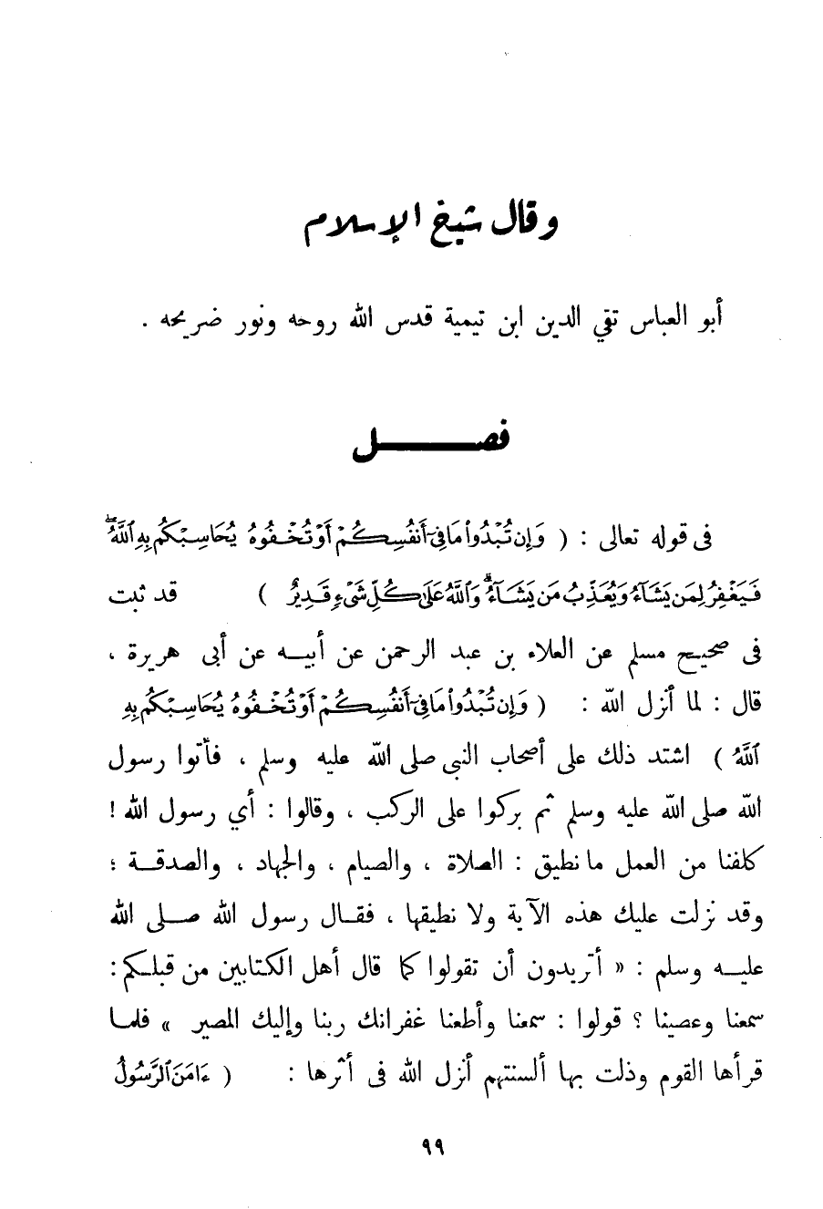 فِي قَوْله تَعَالَى {وَإِنْ تُبْدُوا مَا فِي أَنْفُسِكُمْ أَوْ تُخْفُوهُ يُحَاسِبْكُمْ بِهِ اللَّهُ فَيَغْفِرُ لِمَنْ يَشَاءُ وَيُعَذِّبُ مَنْ يَشَاءُ وَاللَّهُ عَلَى كُلِّ شَيْءٍ قَدِيرٌ} قَدْ ثَبَتَ فِي صَحِيحِ مُسْلِمٍ عَنْ الْعَلَاءِ بْنِ عَبْدِ الرَّحْمَنِ عَنْ أَبِيهِ عَنْ {أَبِي هُرَيْرَةَ قَالَ: لَمَّا أَنْزَلَ اللَّهُ: {وَإِنْ تُبْدُوا مَا فِي أَنْفُسِكُمْ أَوْ تُخْفُوهُ يُحَاسِبْكُمْ بِهِ اللَّهُ} اشْتَدَّ ذَلِكَ عَلَى أَصْحَابِ النَّبِيِّ صَلَّى اللَّهُ عَلَيْهِ وَسَلَّمَ فَأَتَوْا رَسُولَ اللَّهِ صَلَّى اللَّهُ عَلَيْهِ وَسَلَّمَ ثُمَّ بَرَكُوا عَلَى الرُّكَبِ وَقَالُوا: أَيْ رَسُولَ اللَّهِ كُلِّفْنَا مِنْ الْعَمَلِ مَا نُطِيقُ: الصَّلَاةَ وَالصِّيَامَ وَالْجِهَادَ وَالصَّدَقَةَ؛ وَقَدْ نَزَلَتْ عَلَيْك هَذِهِ الْآيَةُ وَلَا نُطِيقُهَا فَقَالَ رَسُولُ اللَّهِ صَلَّى اللَّهُ عَلَيْهِ وَسَلَّمَ أَتُرِيدُونَ أَنْ تَقُولُوا كَمَا قَالَ أَهْلُ الْكِتَابَيْنِ مِنْ قَبْلِكُمْ: سَمِعْنَا وَعَصَيْنَا؟ قُولُوا: سَمِعْنَا وَأَطَعْنَا غُفْرَانَك رَبَّنَا وَإِلَيْك الْمَصِيرُ فَلَمَّا قَرَأَهَا الْقَوْمُ وَذَلَّتْ بِهَا أَلْسِنَتُهُمْ أَنْزَلَ اللَّهُ فِي أَثَرِهَا: {آمَنَ الرَّسُولُ