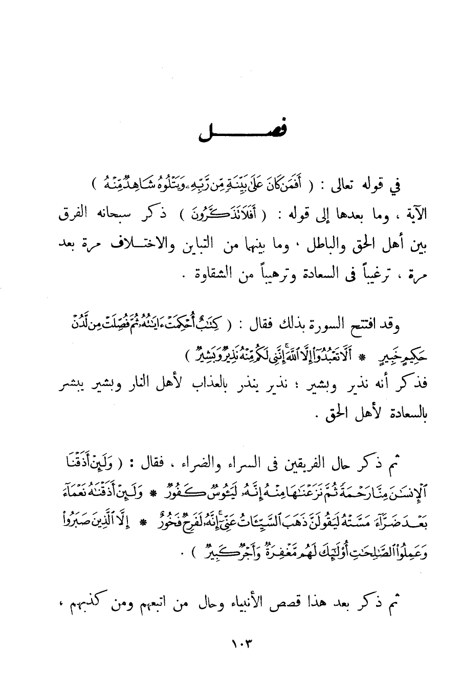 فِي قَوْله تَعَالَى {أَفَمَنْ كَانَ عَلَى بَيِّنَةٍ مِنْ رَبِّهِ وَيَتْلُوهُ شَاهِدٌ مِنْهُ} الْآيَةُ وَمَا بَعْدَهَا إلَى قَوْلِهِ: {أَفَلَا تَذَكَّرُونَ} ذَكَرَ سُبْحَانَهُ الْفَرْقَ بَيْنَ أَهْلِ الْحَقِّ وَالْبَاطِلِ وَمَا بَيْنَهُمَا مِنْ التَّبَايُنِ وَالِاخْتِلَافِ مَرَّةً بَعْدَ مَرَّةٍ تَرْغِيبًا فِي السَّعَادَةِ وَتَرْهِيبًا مِنْ الشَّقَاوَةِ. وَقَدْ افْتَتَحَ السُّورَةَ بِذَلِكَ فَقَالَ: {كِتَابٌ أُحْكِمَتْ آيَاتُهُ ثُمَّ فُصِّلَتْ مِنْ لَدُنْ حَكِيمٍ خَبِيرٍ} {أَلَّا تَعْبُدُوا إلَّا اللَّهَ إنَّنِي لَكُمْ مِنْهُ نَذِيرٌ وَبَشِيرٌ} فَذَكَرَ أَنَّهُ نَذِيرٌ وَبَشِيرٌ؛ نَذِيرٌ يُنْذِرُ بِالْعَذَابِ لِأَهْلِ النَّارِ وَبَشِيرٌ يُبَشِّرُ بِالسَّعَادَةِ لِأَهْلِ الْحَقِّ. ثُمَّ ذَكَرَ حَالَ الْفَرِيقَيْنِ فِي السَّرَّاءِ وَالضَّرَّاءِ فَقَالَ: {وَلَئِنْ أَذَقْنَا الْإِنْسَانَ مِنَّا رَحْمَةً ثُمَّ نَزَعْنَاهَا مِنْهُ إنَّهُ لَيَئُوسٌ كَفُورٌ} {وَلَئِنْ أَذَقْنَاهُ نَعْمَاءَ بَعْدَ ضَرَّاءَ مَسَّتْهُ لَيَقُولَنَّ ذَهَبَ السَّيِّئَاتُ عَنِّي إنَّهُ لَفَرِحٌ فَخُورٌ} {إلَّا الَّذِينَ صَبَرُوا وَعَمِلُوا الصَّالِحَاتِ أُولَئِكَ لَهُمْ مَغْفِرَةٌ وَأَجْرٌ كَبِيرٌ} . ثُمَّ ذَكَرَ بَعْدَ هَذَا قَصَصَ الْأَنْبِيَاءِ وَحَالَ مَنْ اتَّبَعَهُمْ وَمَنْ كَذَّبَهُمْ