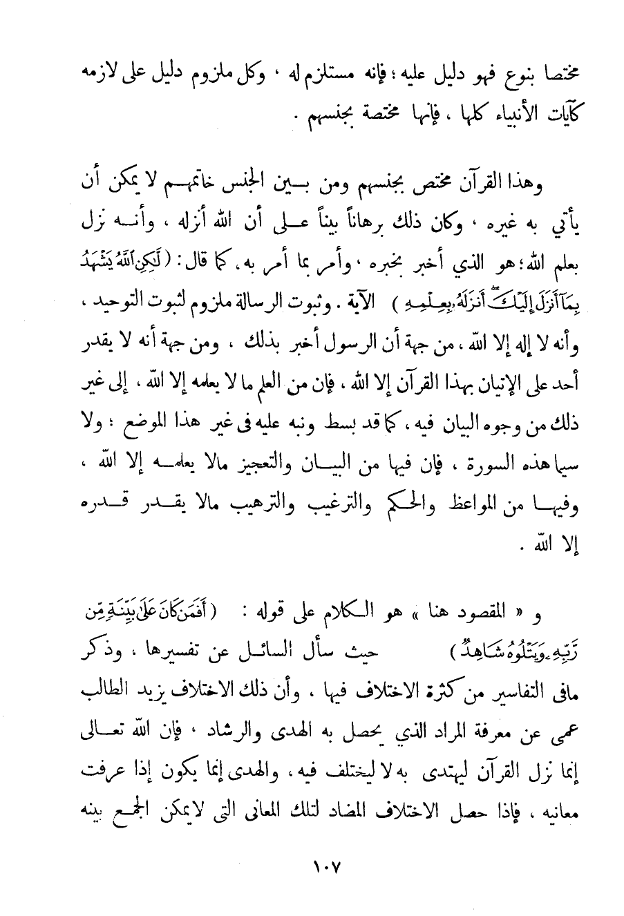 مُخْتَصًّا بِنَوْعِ فَهُوَ دَلِيلٌ عَلَيْهِ؛ فَإِنَّهُ مُسْتَلْزِمٌ لَهُ وَكُلُّ مَلْزُومٍ دَلِيلٌ عَلَى لَازِمِهِ كَآيَاتِ الْأَنْبِيَاءِ كُلِّهَا فَإِنَّهَا مُخْتَصَّةٌ بِجِنْسِهِمْ. وَهَذَا الْقُرْآنُ مُخْتَصٌّ بِجِنْسِهِمْ وَمِنْ بَيْنِ الْجِنْسِ خَاتَمُهُمْ لَا يُمْكِنُ أَنْ يَأْتِيَ بِهِ غَيْرُهُ وَكَانَ ذَلِكَ بُرْهَانًا بَيِّنًا عَلَى أَنَّ اللَّهَ أَنْزَلَهُ وَأَنَّهُ نَزَلَ بِعِلْمِ اللَّهِ؛ هُوَ الَّذِي أَخْبَرَ بِخَبَرِهِ وَأَمَرَ بِمَا أَمَرَ بِهِ كَمَا قَالَ: {لَكِنِ اللَّهُ يَشْهَدُ بِمَا أَنْزَلَ إلَيْكَ أَنْزَلَهُ بِعِلْمِهِ} الْآيَةُ. وَثُبُوتُ الرِّسَالَةِ مَلْزُومٌ لِثُبُوتِ التَّوْحِيدِ وَأَنَّهُ لَا إلَهَ إلَّا اللَّهُ مِنْ جِهَةِ أَنَّ الرَّسُولَ أَخْبَرَ بِذَلِكَ وَمِنْ جِهَةِ أَنَّهُ لَا يَقْدِرُ أَحَدٌ عَلَى الْإِتْيَانِ بِهَذَا الْقُرْآنِ إلَّا اللَّهُ فَإِنَّ مِنْ الْعِلْمِ مَا لَا يَعْلَمُهُ إلَّا اللَّهُ إلَى غَيْرِ ذَلِكَ مِنْ وُجُوهِ الْبَيَانِ فِيهِ كَمَا قَدْ بُسِطَ وَنُبِّهَ عَلَيْهِ فِي غَيْرِ هَذَا الْمَوْضِعِ؛ وَلَا سِيَّمَا هَذِهِ السُّورَةُ فَإِنَّ فِيهَا مِنْ الْبَيَانِ وَالتَّعْجِيزِ مَا لَا يَعْلَمُهُ إلَّا اللَّهُ وَفِيهَا مِنْ الْمَوَاعِظِ وَالْحَكَمِ وَالتَّرْغِيبِ وَالتَّرْهِيبِ مَا لَا يُقَدِّرُ قَدْرَهُ إلَّا اللَّهُ. و " الْمَقْصُودُ هُنَا " هُوَ الْكَلَامُ عَلَى قَوْلِهِ: {أَفَمَنْ كَانَ عَلَى بَيِّنَةٍ مِنْ رَبِّهِ وَيَتْلُوهُ شَاهِدٌ} حَيْثُ سَأَلَ السَّائِلُ عَنْ تَفْسِيرِهَا وَذَكَرَ مَا فِي التَّفَاسِيرِ مِنْ كَثْرَةِ الِاخْتِلَافِ فِيهَا وَأَنَّ ذَلِكَ الِاخْتِلَافَ يَزِيدُ الطَّالِبَ عَمًى عَنْ مَعْرِفَةِ الْمُرَادِ الَّذِي يَحْصُلُ بِهِ الْهُدَى وَالرَّشَادُ فَإِنَّ اللَّهَ تَعَالَى إنَّمَا نَزَلَ الْقُرْآنُ لِيُهْتَدَى بِهِ لَا لِيُخْتَلَفَ فِيهِ وَالْهُدَى إنَّمَا يَكُونُ إذَا عُرِفَتْ مَعَانِيهِ فَإِذَا حَصَلَ الِاخْتِلَافُ الْمُضَادُّ لِتِلْكَ الْمَعَانِي الَّتِي لَا يُمْكِنُ الْجَمْعُ بَيْنَهُ