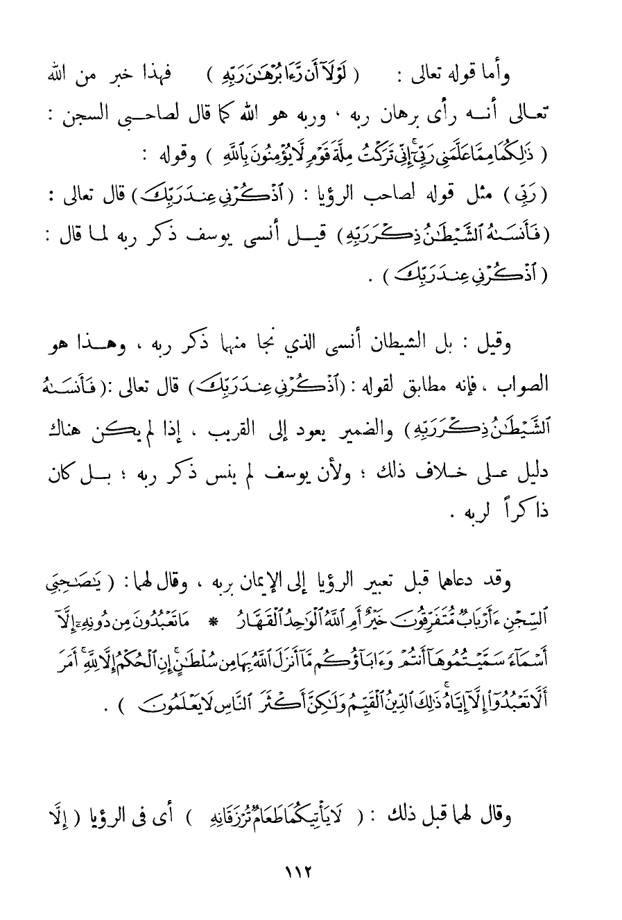 وَأَمَّا قَوْله تَعَالَى {لَوْلَا أَنْ رَأَى بُرْهَانَ رَبِّهِ} فَهَذَا خَبَرٌ مِنْ اللَّهِ تَعَالَى أَنَّهُ رَأَى بُرْهَانَ رَبِّهِ وَرَبُّهُ هُوَ اللَّهُ كَمَا قَالَ لِصَاحِبَيْ السِّجْنِ: {ذَلِكُمَا مِمَّا عَلَّمَنِي رَبِّي إنِّي تَرَكْتُ مِلَّةَ قَوْمٍ لَا يُؤْمِنُونَ بِاللَّهِ} وَقَوْلُهُ: {رَبِّيَ} مِثْلَ قَوْلِهِ لِصَاحِبِ الرُّؤْيَا: {اذْكُرْنِي عِنْدَ رَبِّكَ} قَالَ تَعَالَى: {فَأَنْسَاهُ الشَّيْطَانُ ذِكْرَ رَبِّهِ} قِيلَ أُنْسِيَ يُوسُفُ ذِكْرَ رَبِّهِ لَمَّا قَالَ: {اذْكُرْنِي عِنْدَ رَبِّكَ} . وَقِيلَ: بَلْ الشَّيْطَانُ أَنْسَى الَّذِي نَجَا مِنْهُمَا ذِكْرَ رَبِّهِ وَهَذَا هُوَ الصَّوَابُ فَإِنَّهُ مُطَابِقٌ لِقَوْلِهِ: {اذْكُرْنِي عِنْدَ رَبِّكَ} قَالَ تَعَالَى: {فَأَنْسَاهُ الشَّيْطَانُ ذِكْرَ رَبِّهِ} وَالضَّمِيرُ يَعُودُ إلَى الْقَرِيبِ إذَا لَمْ يَكُنْ هُنَاكَ دَلِيلٌ عَلَى خِلَافِ ذَلِكَ؛ وَلِأَنَّ يُوسُفَ لَمْ يَنْسَ ذِكْرَ رَبِّهِ؛ بَلْ كَانَ ذَاكِرًا لِرَبِّهِ. وَقَدْ دَعَاهُمَا قَبْلَ تَعْبِيرِ الرُّؤْيَا إلَى الْإِيمَانِ بِرَبِّهِ وَقَالَ لَهُمَا: {يَا صَاحِبَيِ السِّجْنِ أَأَرْبَابٌ مُتَفَرِّقُونَ خَيْرٌ أَمِ اللَّهُ الْوَاحِدُ الْقَهَّارُ} {مَا تَعْبُدُونَ مِنْ دُونِهِ إلَّا أَسْمَاءً سَمَّيْتُمُوهَا أَنْتُمْ وَآبَاؤُكُمْ مَا أَنْزَلَ اللَّهُ بِهَا مِنْ سُلْطَانٍ إنِ الْحُكْمُ إلَّا لِلَّهِ أَمَرَ أَلَّا تَعْبُدُوا إلَّا إيَّاهُ ذَلِكَ الدِّينُ الْقَيِّمُ وَلَكِنَّ أَكْثَرَ النَّاسِ لَا يَعْلَمُونَ} . وَقَالَ لَهُمَا قَبْلَ ذَلِكَ {لَا يَأْتِيكُمَا طَعَامٌ تُرْزَقَانِهِ} أَيْ فِي الرُّؤْيَا {إلَّا