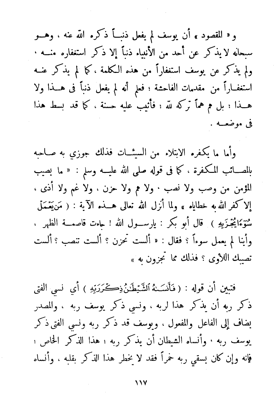 و " الْمَقْصُودُ " أَنَّ يُوسُفَ لَمْ يَفْعَلْ ذَنْبًا ذَكَرَهُ اللَّهُ عَنْهُ وَهُوَ سُبْحَانَهُ لَا يَذْكُرُ عَنْ أَحَدٍ مِنْ الْأَنْبِيَاءِ ذَنْبًا إلَّا ذَكَرَ اسْتِغْفَارَهُ مِنْهُ وَلَمْ يَذْكُرْ عَنْ يُوسُفَ اسْتِغْفَارًا مِنْ هَذِهِ الْكَلِمَةِ. كَمَا لَمْ يَذْكُرْ عَنْهُ اسْتِغْفَارًا مِنْ مُقَدِّمَاتِ الْفَاحِشَةِ؛ فَعُلِمَ أَنَّهُ لَمْ يَفْعَلْ ذَنْبًا فِي هَذَا وَلَا هَذَا؛ بَلْ هَمَّ هَمًّا تَرَكَهُ لِلَّهِ؛ فَأُثِيبَ عَلَيْهِ حَسَنَةً كَمَا قَدْ بُسِطَ هَذَا فِي مَوْضِعِهِ. وَأَمَّا مَا يُكَفِّرُهُ الِابْتِلَاءُ مِنْ السَّيِّئَاتِ فَذَلِكَ جُوزِيَ بِهِ صَاحِبُهُ بِالْمَصَائِبِ الْمُكَفِّرَةِ كَمَا فِي قَوْلِهِ صَلَّى اللَّهُ عَلَيْهِ وَسَلَّمَ {مَا يُصِيبُ الْمُؤْمِنَ مِنْ وَصَبٍ وَلَا نَصَبٍ وَلَا هَمٍّ وَلَا حَزَنٍ وَلَا غَمٍّ وَلَا أَذًى إلَّا كَفَّرَ اللَّهُ بِهِ خَطَايَاهُ} وَلَمَّا {أَنْزَلَ اللَّهُ تَعَالَى هَذِهِ الْآيَةَ: {مَنْ يَعْمَلْ سُوءًا يُجْزَ بِهِ} قَالَ أَبُو بَكْرٍ: يَا رَسُولَ اللَّهِ جَاءَتْ قَاصِمَةُ الظَّهْرِ وَأَيُّنَا لَمْ يَعْمَلْ سُوءًا؟ فَقَالَ: أَلَسْت تَحْزَنُ؟ أَلَسْت تَنْصَبُ؟ أَلَسْت تُصِيبُك اللأوى؟ فَذَلِكَ مِمَّا تُجْزَوْنَ بِهِ} . فَتَبَيَّنَ أَنَّ قَوْلَهُ: {فَأَنْسَاهُ الشَّيْطَانُ ذِكْرَ رَبِّهِ} أَيْ نُسِّيَ الْفَتَى ذِكْرَ رَبِّهِ أَنْ يَذْكُرَ هَذَا لِرَبِّهِ وَنُسِّيَ ذِكْرَ يُوسُفَ رَبَّهُ وَالْمَصْدَرُ يُضَافُ إلَى الْفَاعِلِ وَالْمَفْعُولِ وَيُوسُفُ قَدْ ذَكَرَ رَبَّهُ وَنُسِّيَ الْفَتَى ذِكْرَ يُوسُفَ رَبَّهُ وَأَنْسَاهُ الشَّيْطَانُ أَنْ يَذْكُرَ رَبَّهُ؛ هَذَا الذِّكْرَ الْخَاصَّ؛ فَإِنَّهُ وَإِنْ كَانَ يَسْقِي رَبَّهُ خَمْرًا فَقَدْ لَا يَخْطُرُ هَذَا الذِّكْرُ بِقَلْبِهِ وَأَنْسَاهُ