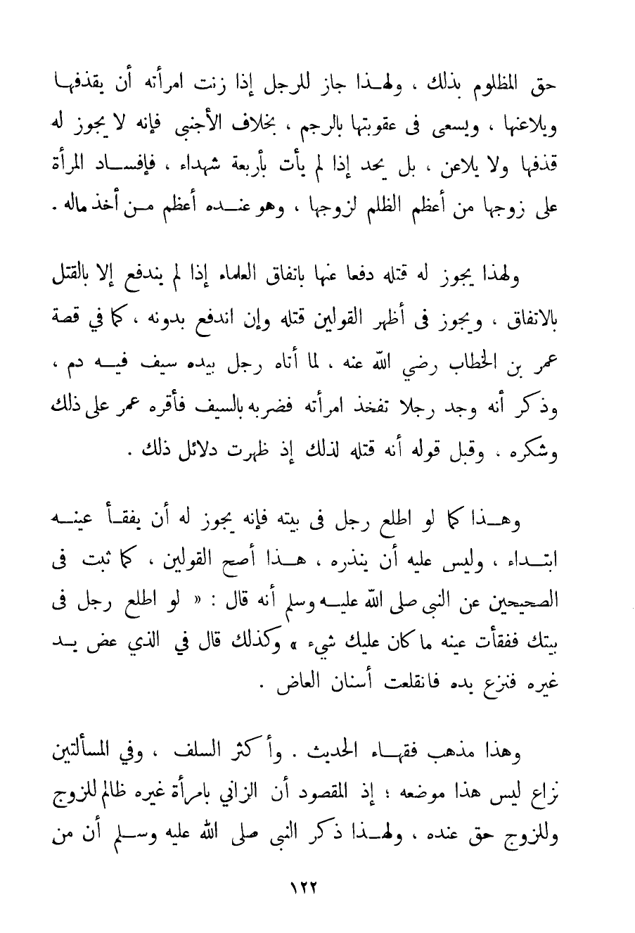 حَقُّ الْمَظْلُومِ بِذَلِكَ وَلِهَذَا جَازَ لِلرَّجُلِ إذَا زَنَتْ امْرَأَتُهُ أَنْ يَقْذِفَهَا وَيُلَاعِنَهَا وَيَسْعَى فِي عُقُوبَتِهَا بِالرَّجْمِ بِخِلَافِ الْأَجْنَبِيِّ فَإِنَّهُ لَا يَجُوزُ لَهُ قَذْفُهَا وَلَا يُلَاعِنُ بَلْ يُحَدُّ إذَا لَمْ يَأْتِ بِأَرْبَعَةِ شُهَدَاءَ فَإِفْسَادُ الْمَرْأَةِ عَلَى زَوْجِهَا مِنْ أَعْظَمِ الظُّلْمِ لِزَوْجِهَا وَهُوَ عِنْدَهُ أَعْظَمُ مِنْ أَخْذِ مَالِهِ. وَلِهَذَا يَجُوزُ لَهُ قَتْلُهُ دَفْعًا عَنْهَا بِاتِّفَاقِ الْعُلَمَاءِ إذَا لَمْ يَنْدَفِعْ إلَّا بِالْقَتْلِ بِالِاتِّفَاقِ وَيَجُوزُ فِي أَظْهَرِ الْقَوْلَيْنِ قَتْلُهُ وَإِنْ انْدَفَعَ بِدُونِهِ كَمَا فِي قِصَّةِ عُمَرَ بْنِ الْخَطَّابِ رَضِيَ اللَّهُ عَنْهُ لَمَّا أَتَاهُ رَجُلٌ بِيَدِهِ سَيْفٌ فِيهِ دَمٌ وَذَكَرَ أَنَّهُ وَجَدَ رَجُلًا تَفَخَّذَ امْرَأَتَهُ فَضَرَبَهُ بِالسَّيْفِ فَأَقَرَّهُ عُمَرُ عَلَى ذَلِكَ وَشَكَرَهُ وَقَبِلَ قَوْلَهُ أَنَّهُ قَتَلَهُ لِذَلِكَ إذْ ظَهَرَتْ دَلَائِلُ ذَلِكَ. وَهَذَا كَمَا لَوْ اطَّلَعَ رَجُلٌ فِي بَيْتِهِ فَإِنَّهُ يَجُوزُ لَهُ أَنْ يَفْقَأَ عَيْنَهُ ابْتِدَاءً وَلَيْسَ عَلَيْهِ أَنْ يُنْذِرَهُ هَذَا أَصَحُّ الْقَوْلَيْنِ كَمَا ثَبَتَ فِي الصَّحِيحَيْنِ عَنْ النَّبِيِّ صَلَّى اللَّهُ عَلَيْهِ وَسَلَّمَ أَنَّهُ قَالَ: {لَوْ اطَّلَعَ رَجُلٌ فِي بَيْتِك فَفَقَأْت عَيْنَهُ مَا كَانَ عَلَيْك شَيْءٌ} وَكَذَلِكَ قَالَ فِي الَّذِي عَضَّ يَدَ غَيْرِهِ فَنَزَعَ يَدَهُ فَانْقَلَعَتْ أَسْنَانُ الْعَاضِّ. وَهَذَا مَذْهَبُ فُقَهَاءِ الْحَدِيثِ. وَأَكْثَرُ السَّلَفِ وَفِي الْمَسْأَلَتَيْنِ نِزَاعٌ لَيْسَ هَذَا مَوْضِعَهُ؛ إذْ الْمَقْصُودُ أَنَّ الزَّانِيَ بِامْرَأَةِ غَيْرِهِ ظَالِمٌ لِلزَّوْجِ وَلِلزَّوْجِ حَقٌّ عِنْدَهُ وَلِهَذَا {ذَكَرَ النَّبِيُّ صَلَّى اللَّهُ عَلَيْهِ وَسَلَّمَ أَنَّ مَنْ