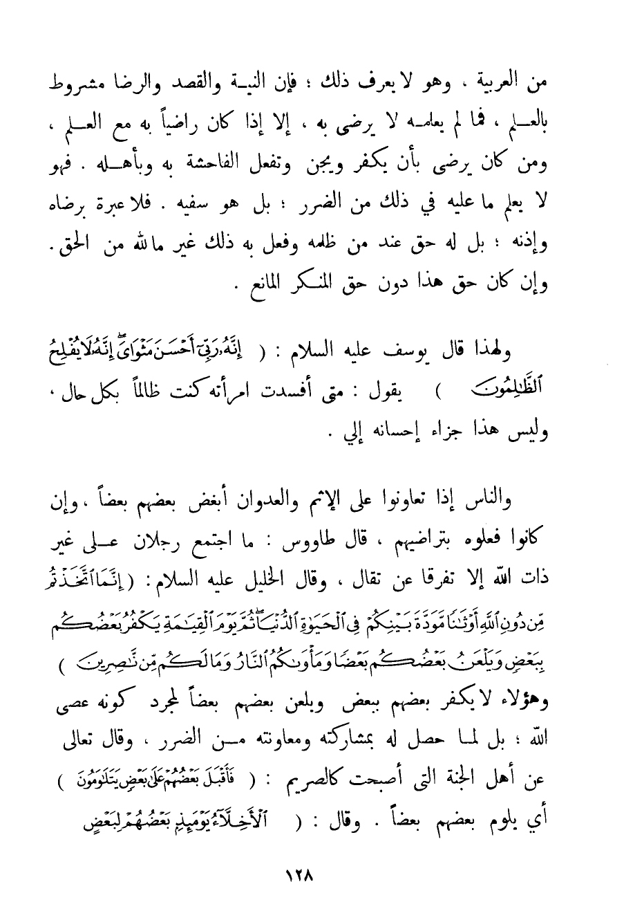 مِنْ الْعَرَبِيَّةِ وَهُوَ لَا يَعْرِفُ ذَلِكَ؛ فَإِنَّ النِّيَّةَ وَالْقَصْدَ وَالرِّضَا مَشْرُوطٌ بِالْعِلْمِ فَمَا لَمْ يَعْلَمْهُ لَا يَرْضَى بِهِ إلَّا إذَا كَانَ رَاضِيًا بِهِ مَعَ الْعِلْمِ وَمَنْ كَانَ يَرْضَى بِأَنْ يَكْفُرَ وَيُجَنَّ وَتُفْعَلَ الْفَاحِشَةُ بِهِ وَبِأَهْلِهِ. فَهُوَ لَا يَعْلَمُ مَا عَلَيْهِ فِي ذَلِكَ مِنْ الضَّرَرِ؛ بَلْ هُوَ سَفِيهٌ. فَلَا عِبْرَةَ بِرِضَاهُ وَإِذْنِهِ؛ بَلْ لَهُ حَقٌّ عِنْدَ مَنْ ظَلَمَهُ وَفَعَلَ بِهِ ذَلِكَ غَيْرُ مَا لِلَّهِ مِنْ الْحَقِّ. وَإِنْ كَانَ حَقُّ هَذَا دُونَ حَقِّ الْمُنْكِرِ الْمَانِعِ. وَلِهَذَا قَالَ يُوسُفُ عَلَيْهِ السَّلَامُ {إنَّهُ رَبِّي أَحْسَنَ مَثْوَايَ إنَّهُ لَا يُفْلِحُ الظَّالِمُونَ} يَقُولُ: مَتَى أَفْسَدْت امْرَأَتَهُ كُنْت ظَالِمًا بِكُلِّ حَالٍ وَلَيْسَ هَذَا جَزَاءَ إحْسَانِهِ إلَيَّ. وَالنَّاسُ إذَا تَعَاوَنُوا عَلَى الْإِثْمِ وَالْعُدْوَانِ أَبْغَضَ بَعْضُهُمْ بَعْضًا وَإِنْ كَانُوا فَعَلُوهُ بِتَرَاضِيهِمْ قَالَ طَاوُوسٌ: مَا اجْتَمَعَ رَجُلَانِ عَلَى غَيْرِ ذَاتِ اللَّهِ إلَّا تَفَرَّقَا عَنْ تَقَالٍ وَقَالَ الْخَلِيلُ عَلَيْهِ السَّلَامُ {إنَّمَا اتَّخَذْتُمْ مِنْ دُونِ اللَّهِ أَوْثَانًا مَوَدَّةَ بَيْنِكُمْ فِي الْحَيَاةِ الدُّنْيَا ثُمَّ يَوْمَ الْقِيَامَةِ يَكْفُرُ بَعْضُكُمْ بِبَعْضٍ وَيَلْعَنُ بَعْضُكُمْ بَعْضًا وَمَأْوَاكُمُ النَّارُ وَمَا لَكُمْ مِنْ نَاصِرِينَ} وَهَؤُلَاءِ لَا يَكْفُرُ بَعْضُهُمْ بِبَعْضٍ وَيَلْعَنُ بَعْضُهُمْ بَعْضًا لِمُجَرَّدِ كَوْنِهِ عَصَى اللَّهَ؛ بَلْ لِمَا حَصَلَ لَهُ بِمُشَارَكَتِهِ وَمُعَاوَنَتِهِ مِنْ الضَّرَرِ وَقَالَ تَعَالَى عَنْ أَهْلِ الْجَنَّةِ الَّتِي أَصْبَحَتْ كَالصَّرِيمِ: {فَأَقْبَلَ بَعْضُهُمْ عَلَى بَعْضٍ يَتَلَاوَمُونَ} أَيْ يَلُومُ بَعْضُهُمْ بَعْضًا. وَقَالَ: {الْأَخِلَّاءُ يَوْمَئِذٍ