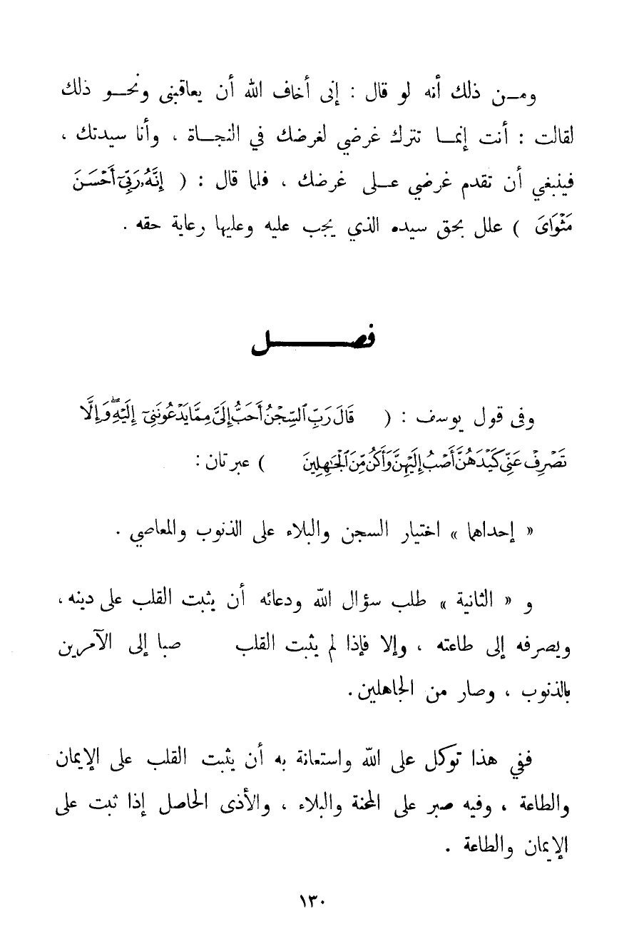 وَفِي قَوْلِ يُوسُفَ: {قَالَ رَبِّ السِّجْنُ أَحَبُّ إلَيَّ مِمَّا يَدْعُونَنِي إلَيْهِ وَإِلَّا تَصْرِفْ عَنِّي كَيْدَهُنَّ أَصْبُ إلَيْهِنَّ وَأَكُنْ مِنَ الْجَاهِلِينَ} عِبْرَتَانِ: " إحْدَاهُمَا " اخْتِيَارُ السَّجْنِ وَالْبَلَاءِ عَلَى الذُّنُوبِ وَالْمَعَاصِي. و " الثَّانِيَةُ " طَلَبُ سُؤَالِ اللَّهِ وَدُعَائِهِ أَنْ يُثَبِّتَ الْقَلْبَ عَلَى دِينِهِ وَيَصْرِفَهُ إلَى طَاعَتِهِ وَإِلَّا فَإِذَا لَمْ يُثَبِّتْ الْقَلْبَ صَبَا إلَى الْآمِرِينَ بِالذُّنُوبِ وَصَارَ مِنْ الْجَاهِلِينَ. فَفِي هَذَا تَوَكُّلٌ عَلَى اللَّهِ وَاسْتِعَانَةٌ بِهِ أَنْ يُثَبِّتَ الْقَلْبَ عَلَى الْإِيمَانِ وَالطَّاعَةِ وَفِيهِ صَبْرٌ عَلَى الْمِحْنَةِ وَالْبَلَاءِ وَالْأَذَى الْحَاصِلِ إذَا ثَبَتَ عَلَى الْإِيمَانِ وَالطَّاعَةِ.