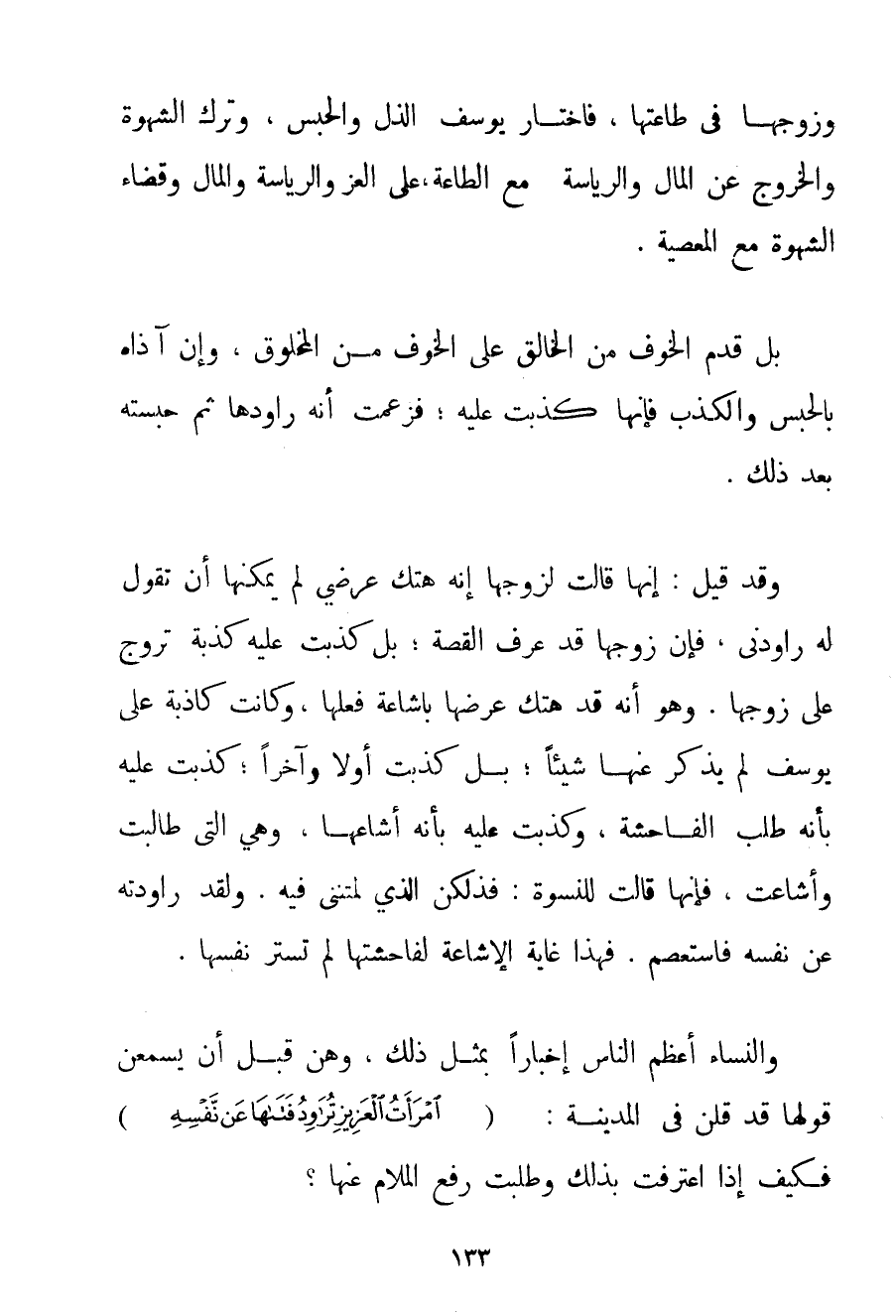 وَزَوْجُهَا فِي طَاعَتِهَا فَاخْتَارَ يُوسُفُ الذُّلَّ وَالْحَبْسَ وَتَرْكَ الشَّهْوَةِ وَالْخُرُوجَ عَنْ الْمَالِ وَالرِّيَاسَةِ مَعَ الطَّاعَةِ عَلَى الْعِزِّ وَالرِّيَاسَةِ وَالْمَالِ وَقَضَاءِ الشَّهْوَةِ مَعَ الْمَعْصِيَةِ. بَلْ قَدَّمَ الْخَوْفَ مِنْ الْخَالِقِ عَلَى الْخَوْفِ مِنْ الْمَخْلُوقِ وَإِنْ آذَاهُ بِالْحَبْسِ وَالْكَذِبِ فَإِنَّهَا كَذَبَتْ عَلَيْهِ؛ فَزَعَمَتْ أَنَّهُ رَاوَدَهَا ثُمَّ حَبَسَتْهُ بَعْدَ ذَلِكَ. وَقَدْ قِيلَ: إنَّهَا قَالَتْ لِزَوْجِهَا إنَّهُ هَتَكَ عِرْضِي لَمْ يُمْكِنْهَا أَنْ تَقُولَ لَهُ رَاوَدَنِي فَإِنَّ زَوْجَهَا قَدْ عَرَفَ الْقِصَّةَ؛ بَلْ كَذَبَتْ عَلَيْهِ كِذْبَةً تَرُوجُ عَلَى زَوْجِهَا. وَهُوَ أَنَّهُ قَدْ هَتَكَ عِرْضَهَا بِإِشَاعَةِ فَعَلَهَا وَكَانَتْ كَاذِبَةً عَلَى يُوسُفَ لَمْ يَذْكُرْ عَنْهَا شَيْئًا؛ بَلْ كَذَبَتْ أَوَّلًا وَآخِرًا؛ كَذَبَتْ عَلَيْهِ بِأَنَّهُ طَلَبَ الْفَاحِشَةَ وَكَذَبَتْ عَلَيْهِ بِأَنَّهُ أَشَاعَهَا وَهِيَ الَّتِي طَالَبَتْ وَأَشَاعَتْ فَإِنَّهَا قَالَتْ لِلنِّسْوَةِ: فَذَلِكُنَّ الَّذِي لُمْتُنَّنِي فِيهِ. وَلَقَدْ رَاوَدْته عَنْ نَفْسِهِ فَاسْتَعْصَمَ. فَهَذَا غَايَةُ الْإِشَاعَةِ لِفَاحِشَتِهَا لَمْ تَسْتُرْ نَفْسَهَا. وَالنِّسَاءُ أَعْظَمُ النَّاسِ إخْبَارًا بِمِثْلِ ذَلِكَ وَهُنَّ قَبْلَ أَنْ يَسْمَعْنَ قَوْلَهَا قَدْ قُلْنَ فِي الْمَدِينَةِ: {امْرَأَةُ الْعَزِيزِ تُرَاوِدُ فَتَاهَا عَنْ نَفْسِهِ} فَكَيْفَ إذَا اعْتَرَفَتْ بِذَلِكَ وَطَلَبَتْ رَفْعَ الْمَلَامِ عَنْهَا؟ .