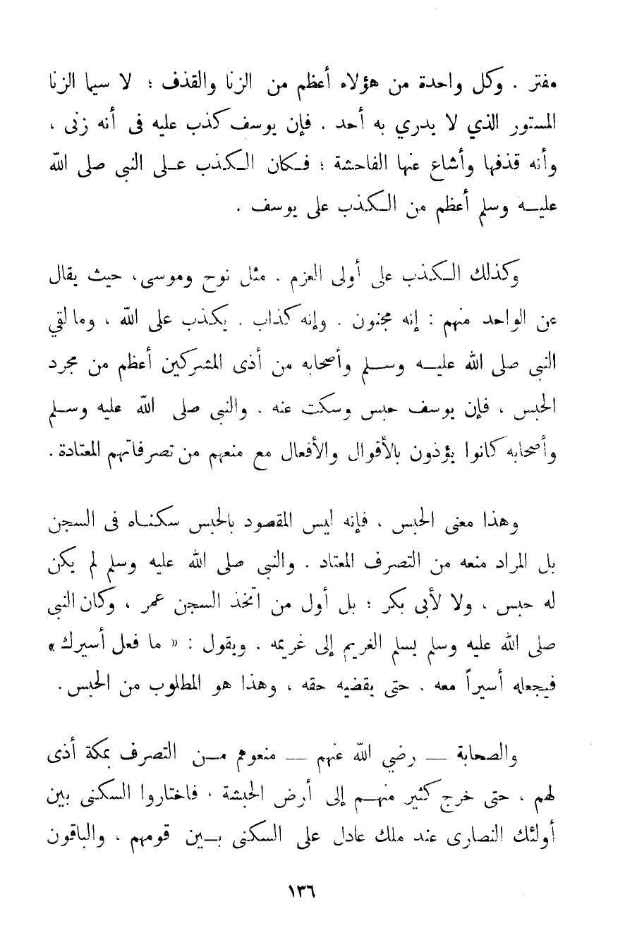 مُفْتَرٍ. وَكُلُّ وَاحِدَةٍ مِنْ هَؤُلَاءِ أَعْظَمُ مِنْ الزِّنَا وَالْقَذْفِ؛ لَا سِيَّمَا الزِّنَا الْمَسْتُورُ الَّذِي لَا يَدْرِي بِهِ أَحَدٌ. فَإِنَّ يُوسُفَ كَذَبَ عَلَيْهِ فِي أَنَّهُ زَنَى وَأَنَّهُ قَذَفَهَا وَأَشَاعَ عَنْهَا الْفَاحِشَةَ؛ فَكَانَ الْكَذِبُ عَلَى النَّبِيِّ صَلَّى اللَّهُ عَلَيْهِ وَسَلَّمَ أَعْظَمَ مِنْ الْكَذِبِ عَلَى يُوسُفَ. وَكَذَلِكَ الْكَذِبُ عَلَى أُولِي الْعَزْمِ مِثْلَ نُوحٍ وَمُوسَى حَيْثُ يُقَالُ عَنْ الْوَاحِدِ مِنْهُمْ: إنَّهُ مَجْنُونٌ وَإِنَّهُ كَذَّابٌ يَكْذِبُ عَلَى اللَّهِ وَمَا لَقِيَ النَّبِيُّ صَلَّى اللَّهُ عَلَيْهِ وَسَلَّمَ وَأَصْحَابُهُ مِنْ أَذَى الْمُشْرِكِينَ أَعْظَمُ مِنْ مُجَرَّدِ الْحَبْسِ فَإِنَّ يُوسُفَ حُبِسَ وَسُكِتَ عَنْهُ وَالنَّبِيُّ صَلَّى اللَّهُ عَلَيْهِ وَسَلَّمَ وَأَصْحَابُهُ كَانُوا يُؤْذَوْنَ بِالْأَقْوَالِ وَالْأَفْعَالِ مَعَ مَنْعِهِمْ مِنْ تَصَرُّفَاتِهِمْ الْمُعْتَادَةِ. وَهَذَا مَعْنَى الْحَبْسِ فَإِنَّهُ لَيْسَ الْمَقْصُودُ بِالْحَبْسِ سُكْنَاهُ فِي السِّجْنِ بَلْ الْمُرَادُ مَنْعُهُ مِنْ التَّصَرُّفِ الْمُعْتَادِ. وَالنَّبِيُّ صَلَّى اللَّهُ عَلَيْهِ وَسَلَّمَ لَمْ يَكُنْ لَهُ حَبْسٌ وَلَا لِأَبِي بَكْرٍ؛ بَلْ أَوَّلُ مَنْ اتَّخَذَ السِّجْنَ عُمَرُ وَكَانَ النَّبِيُّ صَلَّى اللَّهُ عَلَيْهِ وَسَلَّمَ {يُسَلِّمُ الْغَرِيمَ إلَى غَرِيمِهِ وَيَقُولُ: مَا فَعَلَ أَسِيرُك} فَيَجْعَلُهُ أَسِيرًا مَعَهُ حَتَّى يَقْضِيَهُ حَقَّهُ وَهَذَا هُوَ الْمَطْلُوبُ مِنْ الْحَبْسِ. وَالصَّحَابَةُ - رَضِيَ اللَّهُ عَنْهُمْ - مَنَعُوهُمْ مِنْ التَّصَرُّفِ بِمَكَّةَ أَذًى لَهُمْ حَتَّى خَرَجَ كَثِيرٌ مِنْهُمْ إلَى أَرْضِ الْحَبَشَةِ فَاخْتَارُوا السُّكْنَى بَيْنَ أُولَئِكَ النَّصَارَى عِنْدَ مَلِكٍ عَادِلٍ عَلَى السُّكْنَى بَيْنَ قَوْمِهِمْ وَالْبَاقُونَ