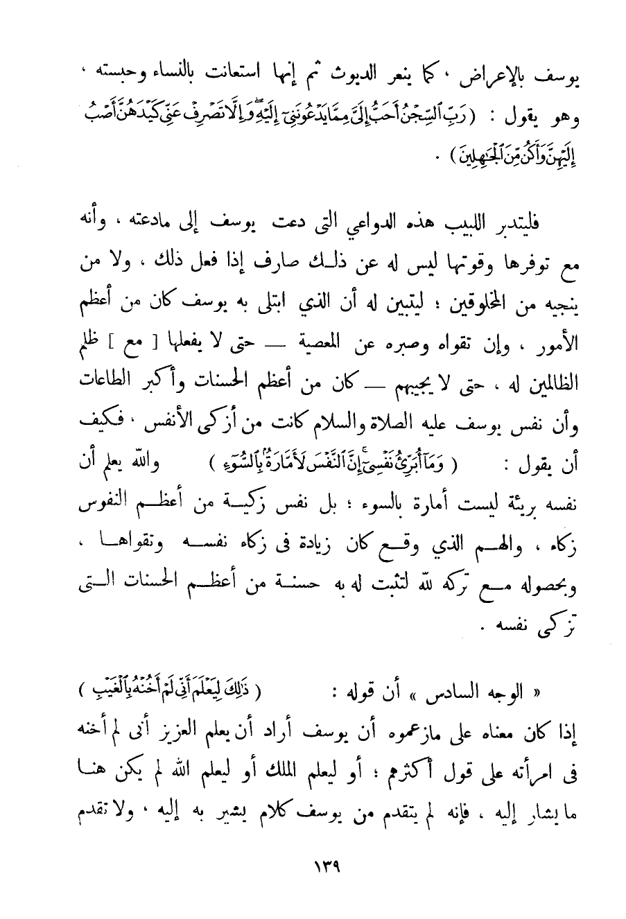 يُوسُفَ بِالْإِعْرَاضِ كَمَا يَنْعَرُ الدَّيُّوثُ ثُمَّ إنَّهَا اسْتَعَانَتْ بِالنِّسَاءِ وَحَبَسَتْهُ وَهُوَ يَقُولُ: {رَبِّ السِّجْنُ أَحَبُّ إلَيَّ مِمَّا يَدْعُونَنِي إلَيْهِ وَإِلَّا تَصْرِفْ عَنِّي كَيْدَهُنَّ أَصْبُ إلَيْهِنَّ وَأَكُنْ مِنَ الْجَاهِلِينَ} . فَلْيَتَدَبَّرْ اللَّبِيبُ هَذِهِ الدَّوَاعِيَ الَّتِي دَعَتْ يُوسُفَ إلَى مَا دَعَتْهُ وَأَنَّهُ مَعَ تَوَفُّرِهَا وَقُوَّتِهَا لَيْسَ لَهُ عَنْ ذَلِكَ صَارِفٌ إذَا فَعَلَ ذَلِكَ وَلَا مَنْ يُنْجِيهِ مِنْ الْمَخْلُوقِينَ؛ لِيَتَبَيَّنَ لَهُ أَنَّ الَّذِي اُبْتُلِيَ بِهِ يُوسُفُ كَانَ مِنْ أَعْظَمِ الْأُمُورِ وَأَنَّ تَقْوَاهُ وَصَبْرَهُ عَنْ الْمَعْصِيَةِ - حَتَّى لَا يَفْعَلَهَا مَعَ ظُلْمِ الظَّالِمِينَ لَهُ حَتَّى لَا يُجِيبَهُمْ - كَانَ مِنْ أَعْظَمِ الْحَسَنَاتِ وَأَكْبَرِ الطَّاعَاتِ وَأَنَّ نَفْسَ يُوسُفَ عَلَيْهِ الصَّلَاةُ وَالسَّلَامُ كَانَتْ مِنْ أَزْكَى الْأَنْفُسِ فَكَيْفَ أَنْ يَقُولَ: {وَمَا أُبَرِّئُ نَفْسِي إنَّ النَّفْسَ لَأَمَّارَةٌ بِالسُّوءِ} وَاَللَّهُ يَعْلَمُ أَنَّ نَفْسَهُ بَرِيئَةٌ لَيْسَتْ أَمَّارَةً بِالسُّوءِ؛ بَلْ نَفْسٌ زَكِيَّةٌ مِنْ أَعْظَمِ النُّفُوسِ زَكَاءً وَالْهَمُّ الَّذِي وَقَعَ كَانَ زِيَادَةً فِي زَكَاءِ نَفْسِهِ وَتَقْوَاهَا وَبِحُصُولِهِ مَعَ تَرْكِهِ لِلَّهِ لِتَثْبُتَ لَهُ بِهِ حَسَنَةٌ مِنْ أَعْظَمِ الْحَسَنَاتِ الَّتِي تُزَكِّي نَفْسَهُ. " الْوَجْهُ السَّادِسُ " أَنَّ قَوْلَهُ: {ذَلِكَ لِيَعْلَمَ أَنِّي لَمْ أَخُنْهُ بِالْغَيْبِ} إذَا كَانَ مَعْنَاهُ عَلَى مَا زَعَمُوهُ أَنَّ يُوسُفَ أَرَادَ أَنْ يَعْلَمَ الْعَزِيزُ أَنِّي لَمْ أَخُنْهُ فِي امْرَأَتِهِ عَلَى قَوْلِ أَكْثَرِهِمْ؛ أَوْ لِيَعْلَمَ الْمَلِكُ أَوْ لِيَعْلَمَ اللَّهُ لَمْ يَكُنْ هُنَا مَا يُشَارُ إلَيْهِ فَإِنَّهُ لَمْ يَتَقَدَّمْ مِنْ يُوسُفَ كَلَامٌ يُشِيرُ بِهِ إلَيْهِ وَلَا تَقَدَّمَ