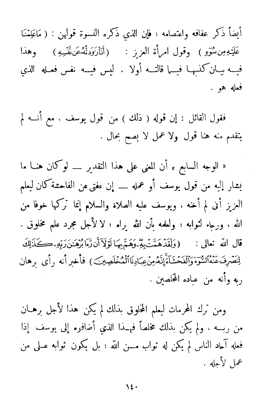أَيْضًا ذِكْرُ عَفَافِهِ وَاعْتِصَامِهِ؛ فَإِنَّ الَّذِي ذَكَرَهُ النِّسْوَةُ قَوْلُهُنَّ: {مَا عَلِمْنَا عَلَيْهِ مِنْ سُوءٍ} وَقَوْلُ امْرَأَةِ الْعَزِيزِ: {أَنَا رَاوَدْتُهُ عَنْ نَفْسِهِ} وَهَذَا فِيهِ بَيَانُ كَذِبِهَا فِيمَا قَالَتْهُ أَوَّلًا لَيْسَ فِيهِ نَفْسُ فِعْلِهِ الَّذِي فَعَلَهُ هُوَ. فَقَوْلُ الْقَائِلِ: إنَّ قَوْلَهُ (ذَلِكَ مِنْ قَوْلِ يُوسُفَ مَعَ أَنَّهُ لَمْ يَتَقَدَّمْ مِنْهُ هُنَا قَوْلٌ وَلَا عَمَلٌ لَا يَصِحُّ بِحَالِ. " الْوَجْهُ السَّابِعُ " أَنَّ الْمَعْنَى عَلَى هَذَا التَّقْدِيرِ - لَوْ كَانَ هُنَا مَا يُشَارُ إلَيْهِ مِنْ قَوْلِ يُوسُفَ أَوْ عَمَلِهِ - إنَّ عِفَّتِي عَنْ الْفَاحِشَةِ كَانَ لِيَعْلَمَ الْعَزِيزُ أَنِّي لَمْ أَخُنْهُ وَيُوسُفُ عَلَيْهِ الصَّلَاةُ وَالسَّلَامُ إنَّمَا تَرَكَهَا خَوْفًا مِنْ اللَّهِ وَرَجَاءً لِثَوَابِهِ؛ وَلِعِلْمِهِ بِأَنَّ اللَّهَ يَرَاهُ؛ لَا لِأَجْلِ مُجَرَّدِ عِلْمِ مَخْلُوقٍ. قَالَ اللَّهُ تَعَالَى: {وَلَقَدْ هَمَّتْ بِهِ وَهَمَّ بِهَا لَوْلَا أَنْ رَأَى بُرْهَانَ رَبِّهِ كَذَلِكَ لِنَصْرِفَ عَنْهُ السُّوءَ وَالْفَحْشَاءَ إنَّهُ مِنْ عِبَادِنَا الْمُخْلَصِينَ} فَأَخْبَرَ أَنَّهُ رَأَى بُرْهَانَ رَبِّهِ وَأَنَّهُ مِنْ عِبَادِهِ الْمُخْلَصِينَ. وَمَنْ تَرَكَ الْمُحَرَّمَاتِ لِيَعْلَمَ الْمَخْلُوقُ بِذَلِكَ لَمْ يَكُنْ هَذَا لِأَجْلِ بُرْهَانٍ مِنْ رَبِّهِ وَلَمْ يَكُنْ بِذَلِكَ مُخْلَصًا فَهَذَا الَّذِي أَضَافُوهُ إلَى يُوسُفَ إذَا فَعَلَهُ آحَادُ النَّاسِ لَمْ يَكُنْ لَهُ ثَوَابٌ مِنْ اللَّهِ؛ بَلْ يَكُونُ ثَوَابُهُ عَلَى مَنْ عَمِلَ لِأَجْلِهِ.
