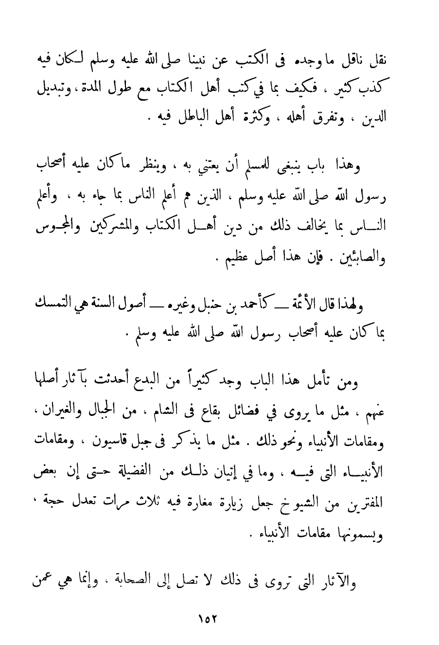 نَقَلَ نَاقِلٌ مَا وَجَدَهُ فِي الْكُتُبِ عَنْ نَبِيِّنَا صَلَّى اللَّهُ عَلَيْهِ وَسَلَّمَ لَكَانَ فِيهِ كَذِبٌ كَثِيرٌ فَكَيْفَ بِمَا فِي كُتُبِ أَهْلِ الْكِتَابِ مَعَ طُولِ الْمُدَّةِ وَتَبْدِيلِ الدِّينِ وَتَفَرُّقِ أَهْلِهِ وَكَثْرَةِ أَهْلِ الْبَاطِلِ فِيهِ. وَهَذَا بَابٌ يَنْبَغِي لِلْمُسْلِمِ أَنْ يَعْتَنِيَ بِهِ وَيَنْظُرَ مَا كَانَ عَلَيْهِ أَصْحَابُ رَسُولِ اللَّهِ صَلَّى اللَّهُ عَلَيْهِ وَسَلَّمَ الَّذِينَ هُمْ أَعْلَمُ النَّاسِ بِمَا جَاءَ بِهِ وَأَعْلَمُ النَّاسِ بِمَا يُخَالِفُ ذَلِكَ مِنْ دِينِ أَهْلِ الْكِتَابِ وَالْمُشْرِكِينَ وَالْمَجُوسِ وَالصَّابِئِينَ. فَإِنَّ هَذَا أَصْلٌ عَظِيمٌ. وَلِهَذَا قَالَ الْأَئِمَّةُ - كَأَحْمَدَ بْنِ حَنْبَلٍ وَغَيْرِهِ - أُصُولُ السُّنَّةِ هِيَ التَّمَسُّكُ بِمَا كَانَ عَلَيْهِ أَصْحَابُ رَسُولِ اللَّهِ صَلَّى اللَّهُ عَلَيْهِ وَسَلَّمَ. وَمَنْ تَأَمَّلَ هَذَا الْبَابَ وَجَدَ كَثِيرًا مِنْ الْبِدَعِ أُحْدِثَتْ بِآثَارِ أَصْلُهَا عَنْهُمْ مِثْلَ مَا يُرْوَى فِي فَضَائِلِ بِقَاعٍ فِي الشَّامِ مِنْ الْجِبَالِ وَالْغَيْرَانِ وَمَقَامَاتِ الْأَنْبِيَاءِ وَنَحْوِ ذَلِكَ. مِثْلَ مَا يُذْكَرُ فِي جَبَلِ قاسيون وَمَقَامَاتِ الْأَنْبِيَاءِ الَّتِي فِيهِ وَمَا فِي إتْيَانِ ذَلِكَ مِنْ الْفَضِيلَةِ حَتَّى إنَّ بَعْضَ الْمُفْتَرِينَ مِنْ الشُّيُوخِ جَعَلَ زِيَارَةَ مَغَارَةٍ فِيهِ ثَلَاثَ مَرَّاتٍ تَعْدِلُ حَجَّةً وَيُسَمُّونَهَا مَقَامَاتِ الْأَنْبِيَاءِ. وَالْآثَارُ الَّتِي تُرْوَى فِي ذَلِكَ لَا تَصِلُ إلَى الصَّحَابَةِ وَإِنَّمَا هِيَ عَمَّنْ