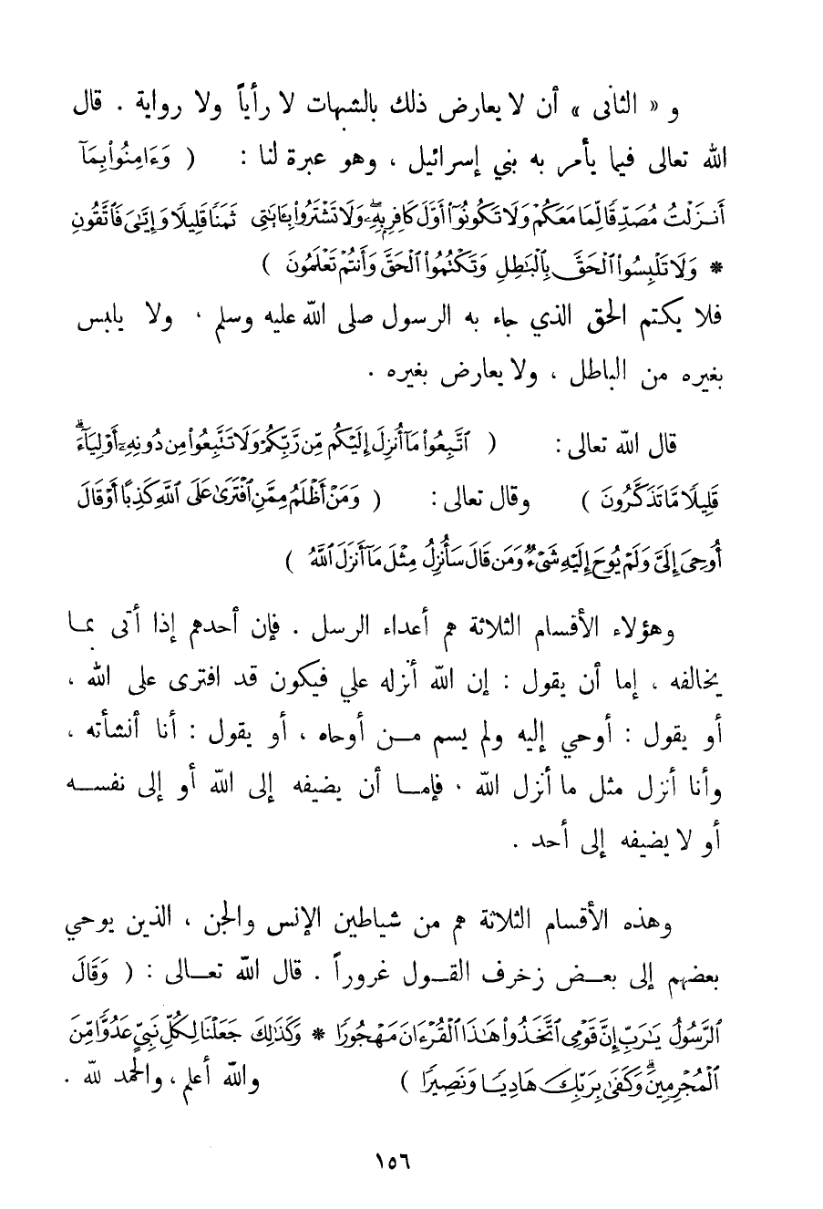 و " الثَّانِي " أَنْ لَا يُعَارِضَ ذَلِكَ بِالشُّبُهَاتِ لَا رَأْيًا وَلَا رِوَايَةً. قَالَ اللَّهُ تَعَالَى فِيمَا يَأْمُرُ بِهِ بَنِي إسْرَائِيلَ وَهُوَ عِبْرَةٌ لَنَا: {وَآمِنُوا بِمَا أَنْزَلْتُ مُصَدِّقًا لِمَا مَعَكُمْ وَلَا تَكُونُوا أَوَّلَ كَافِرٍ بِهِ وَلَا تَشْتَرُوا بِآيَاتِي ثَمَنًا قَلِيلًا وَإِيَّايَ فَاتَّقُونِ} {وَلَا تَلْبِسُوا الْحَقَّ بِالْبَاطِلِ وَتَكْتُمُوا الْحَقَّ وَأَنْتُمْ تَعْلَمُونَ} فَلَا يُكْتَمُ الْحَقُّ الَّذِي جَاءَ بِهِ الرَّسُولُ صَلَّى اللَّهُ عَلَيْهِ وَسَلَّمَ وَلَا يُلْبَسُ بِغَيْرِهِ مِنْ الْبَاطِلِ وَلَا يُعَارَضُ بِغَيْرِهِ. قَالَ اللَّهُ تَعَالَى: {اتَّبِعُوا مَا أُنْزِلَ إلَيْكُمْ مِنْ رَبِّكُمْ وَلَا تَتَّبِعُوا مِنْ دُونِهِ أَوْلِيَاءَ قَلِيلًا مَا تَذَكَّرُونَ} وَقَالَ تَعَالَى: {وَمَنْ أَظْلَمُ مِمَّنِ افْتَرَى عَلَى اللَّهِ كَذِبًا أَوْ قَالَ أُوحِيَ إلَيَّ وَلَمْ يُوحَ إلَيْهِ شَيْءٌ وَمَنْ قَالَ سَأُنْزِلُ مِثْلَ مَا أَنْزَلَ اللَّهُ.} وَهَؤُلَاءِ الْأَقْسَامُ الثَّلَاثَةُ هُمْ أَعْدَاءُ الرُّسُلِ. فَإِنَّ أَحَدَهُمْ إذَا أَتَى بِمَا يُخَالِفُهُ إمَّا أَنْ يَقُولَ: إنَّ اللَّهَ أَنْزَلَهُ عَلَيَّ فَيَكُونُ قَدْ افْتَرَى عَلَى اللَّهِ أَوْ يَقُولَ: أُوحِيَ إلَيْهِ وَلَمْ يُسَمِّ مَنْ أَوْحَاهُ أَوْ يَقُولَ: أَنَا أَنْشَأْته وَأَنَا أُنْزِلَ مِثْلَ مَا أَنْزَلَ اللَّهُ فَإِمَّا أَنْ يُضِيفَهُ إلَى اللَّهِ أَوْ إلَى نَفْسِهِ أَوْ لَا يُضِيفَهُ إلَى أَحَدٍ. وَهَذِهِ الْأَقْسَامُ الثَّلَاثَةُ هُمْ مِنْ شَيَاطِينِ الْإِنْسِ وَالْجِنِّ الَّذِينَ يُوحِي بَعْضُهُمْ إلَى بَعْضٍ زُخْرُفَ الْقَوْلِ غُرُورًا. قَالَ اللَّهُ تَعَالَى: {وَقَالَ الرَّسُولُ يَا رَبِّ إنَّ قَوْمِي اتَّخَذُوا هَذَا الْقُرْآنَ مَهْجُورًا} {وَكَذَلِكَ جَعَلْنَا لِكُلِّ نَبِيٍّ عَدُوًّا مِنَ الْمُجْرِمِينَ وَكَفَى بِرَبِّكَ هَادِيًا وَنَصِيرًا} وَاَللَّهُ أَعْلَمُ وَالْحَمْدُ لِلَّهِ.