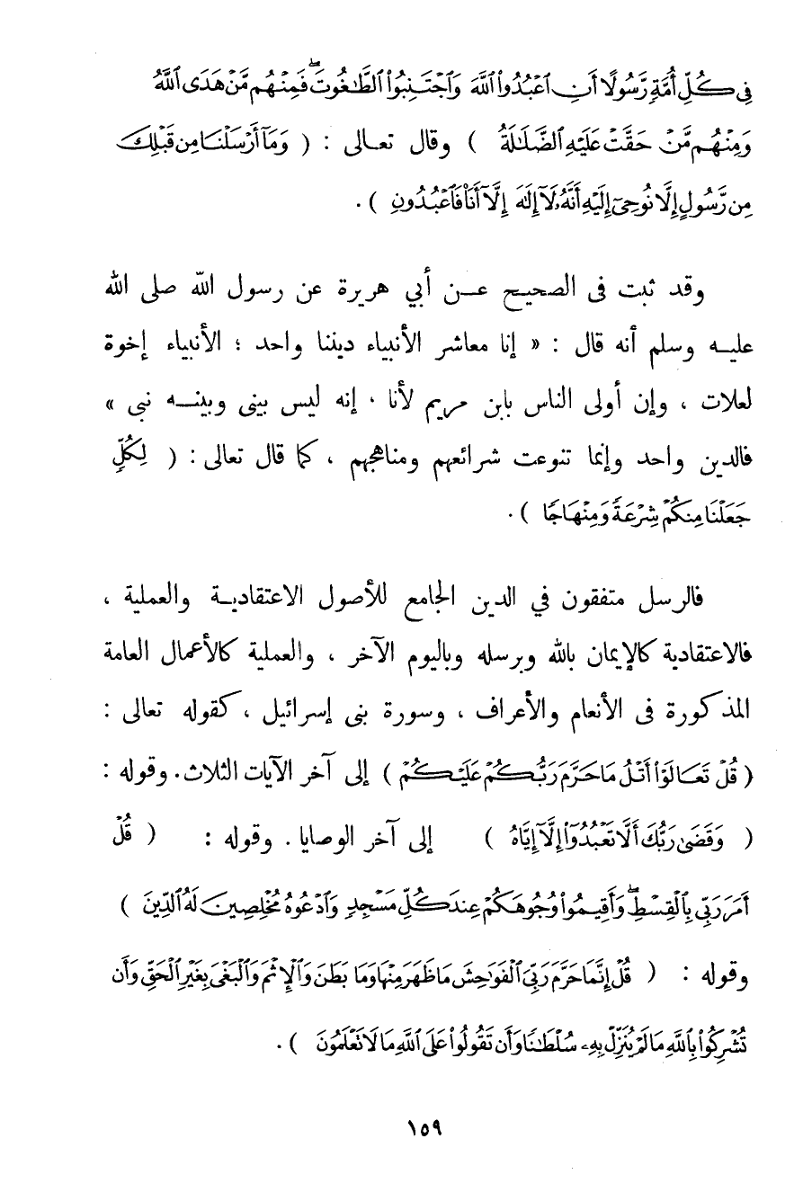 فِي كُلِّ أُمَّةٍ رَسُولًا أَنِ اُعْبُدُوا اللَّهَ وَاجْتَنِبُوا الطَّاغُوتَ فَمِنْهُمْ مَنْ هَدَى اللَّهُ وَمِنْهُمْ مَنْ حَقَّتْ عَلَيْهِ الضَّلَالَةُ} وَقَالَ تَعَالَى: {وَمَا أَرْسَلْنَا مِنْ قَبْلِكَ مِنْ رَسُولٍ إلَّا نُوحِي إلَيْهِ أَنَّهُ لَا إلَهَ إلَّا أَنَا فَاعْبُدُونِ} . وَقَدْ ثَبَتَ فِي الصَّحِيحِ عَنْ أَبِي هُرَيْرَةَ عَنْ رَسُولِ اللَّهِ صَلَّى اللَّهُ عَلَيْهِ وَسَلَّمَ أَنَّهُ قَالَ: {إنَّا مَعَاشِرَ الْأَنْبِيَاءِ دِينُنَا وَاحِدٌ؛ الْأَنْبِيَاءُ إخْوَةٌ لِعِلَّاتِ وَإِنَّ أَوْلَى النَّاسِ بِابْنِ مَرْيَمَ لَأَنَا إنَّهُ لَيْسَ بَيْنِي وَبَيْنَهُ نَبِيٌّ} فَالدِّينُ وَاحِدٌ وَإِنَّمَا تَنَوَّعَتْ شَرَائِعُهُمْ وَمَنَاهِجُهُمْ كَمَا قَالَ تَعَالَى: {لِكُلٍّ جَعَلْنَا مِنْكُمْ شِرْعَةً وَمِنْهَاجًا} . فَالرُّسُلُ مُتَّفِقُونَ فِي الدِّينِ الْجَامِعِ لِلْأُصُولِ الِاعْتِقَادِيَّةِ وَالْعَمَلِيَّةِ فالاعتقادية كَالْإِيمَانِ بِاَللَّهِ وَبِرُسُلِهِ وَبِالْيَوْمِ الْآخِرِ وَالْعَمَلِيَّةُ كَالْأَعْمَالِ الْعَامَّةِ الْمَذْكُورَةِ فِي الْأَنْعَامِ وَالْأَعْرَافِ وَسُورَةِ بَنِي إسْرَائِيلَ كَقَوْلِهِ تَعَالَى: {قُلْ تَعَالَوْا أَتْلُ مَا حَرَّمَ رَبُّكُمْ عَلَيْكُمْ} إلَى آخِرِ الْآيَاتِ الثَّلَاثِ. وَقَوْلِهِ: {وَقَضَى رَبُّكَ أَلَّا تَعْبُدُوا إلَّا إيَّاهُ} إلَى آخِرِ الْوَصَايَا. وَقَوْلِهِ: {قُلْ أَمَرَ رَبِّي بِالْقِسْطِ وَأَقِيمُوا وُجُوهَكُمْ عِنْدَ كُلِّ مَسْجِدٍ وَادْعُوهُ مُخْلِصِينَ لَهُ الدِّينَ} وَقَوْلِهِ: {قُلْ إنَّمَا حَرَّمَ رَبِّيَ الْفَوَاحِشَ مَا ظَهَرَ مِنْهَا وَمَا بَطَنَ وَالْإِثْمَ وَالْبَغْيَ بِغَيْرِ الْحَقِّ وَأَنْ تُشْرِكُوا بِاللَّهِ مَا لَمْ يُنَزِّلْ بِهِ سُلْطَانًا وَأَنْ تَقُولُوا عَلَى اللَّهِ مَا لَا تَعْلَمُونَ} .